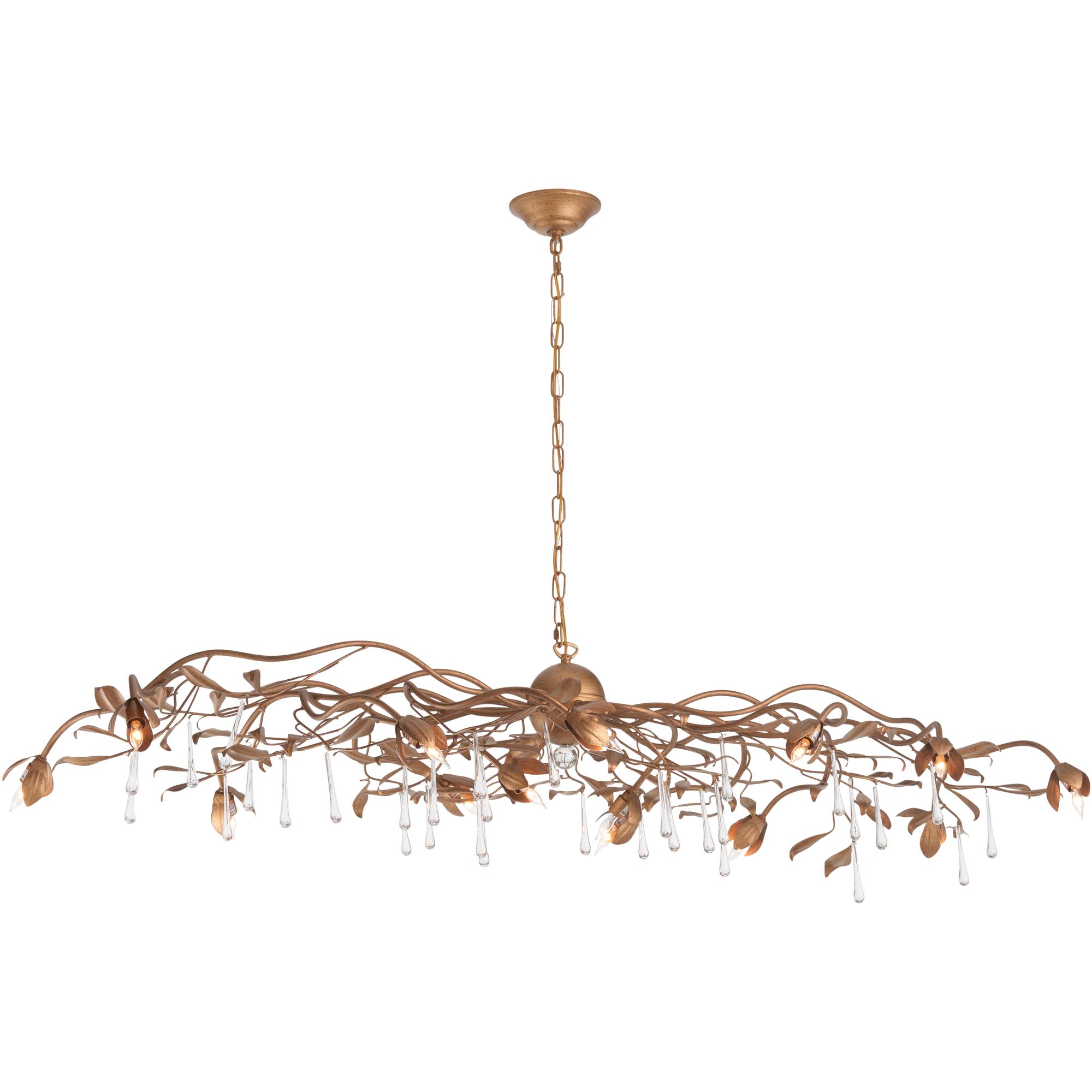 A statement of elegance and craftsmanship, the Bay Laurel Leaf Crystal Chandelier is a true work of art. Handcrafted by skilled artisans in Italy, this exquisite fixture is made of iron and in radiant gold leaf finish, adding a touch of glamour with droplets of crystals, bringing warmth and sophistication to any space. Inspired by the timeless beauty of laurel leaves, its intricate design adds a touch of organic luxury while casting a soft, inviting glow. Made in Italy.