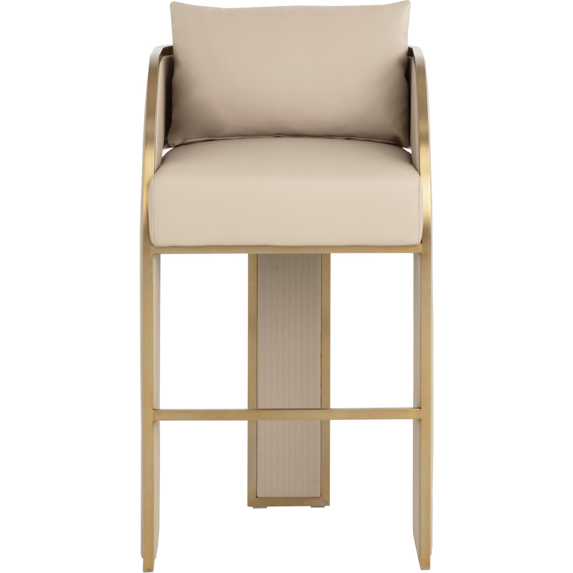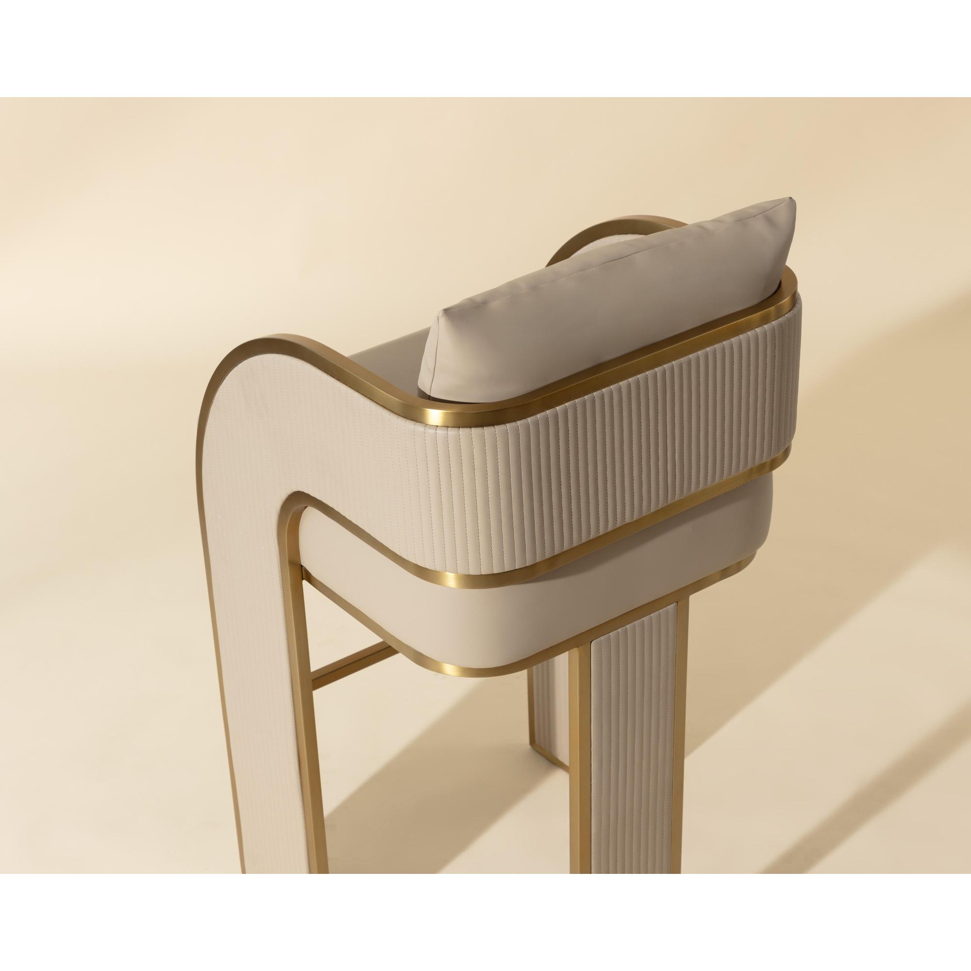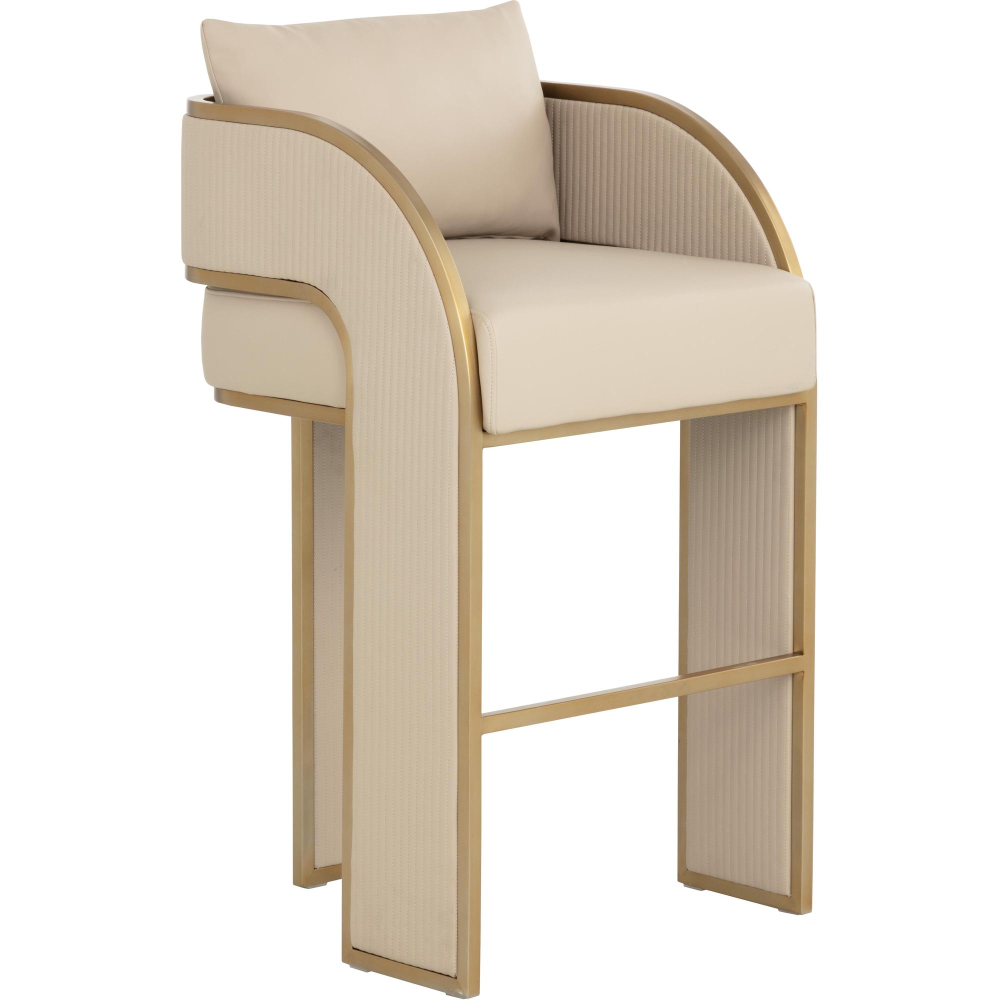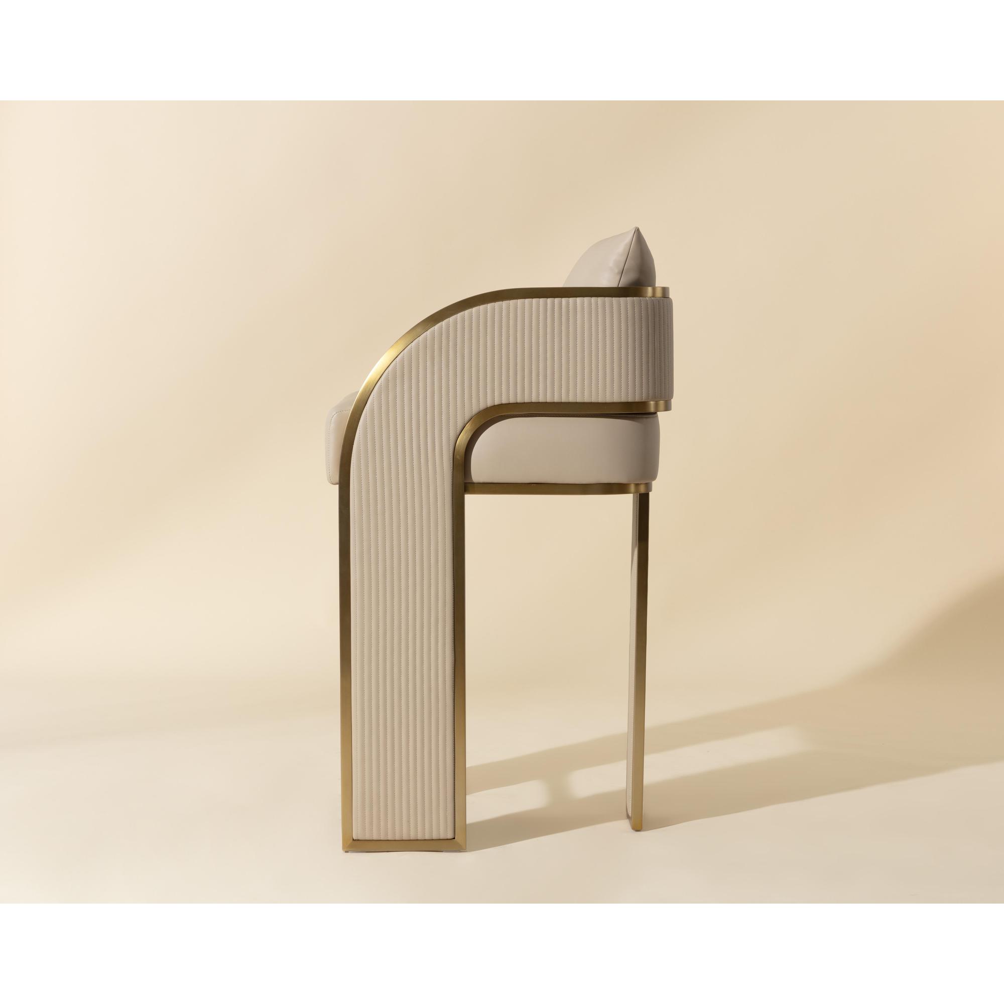 Bold and stylish, the Baz Barstool is sure to turn heads. Featuring a daring silhouette upholstered in napa beige faux leather. Gold stainless steel detailing and channel stitching add depth and visual impact to the overall look of the piece.