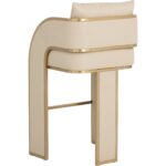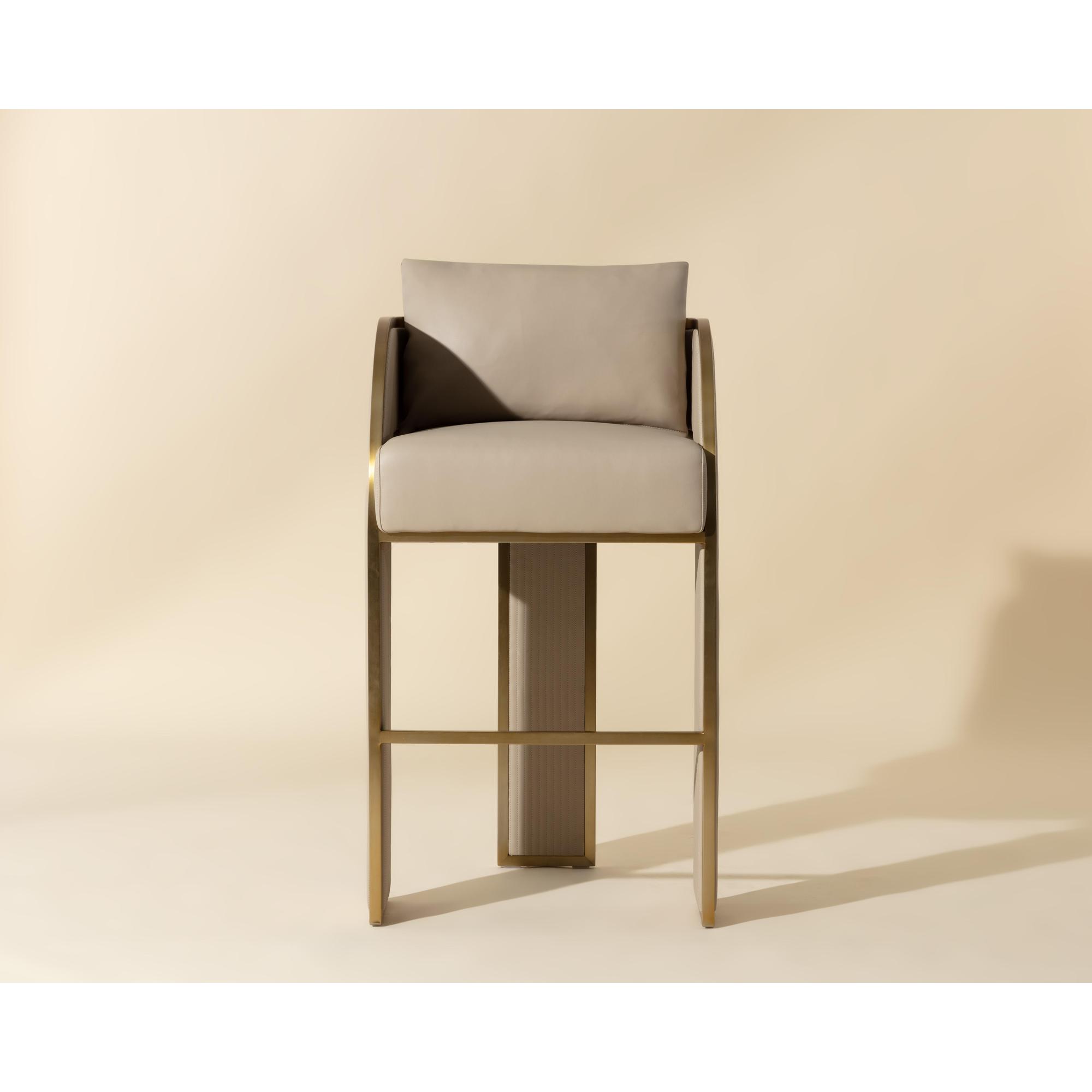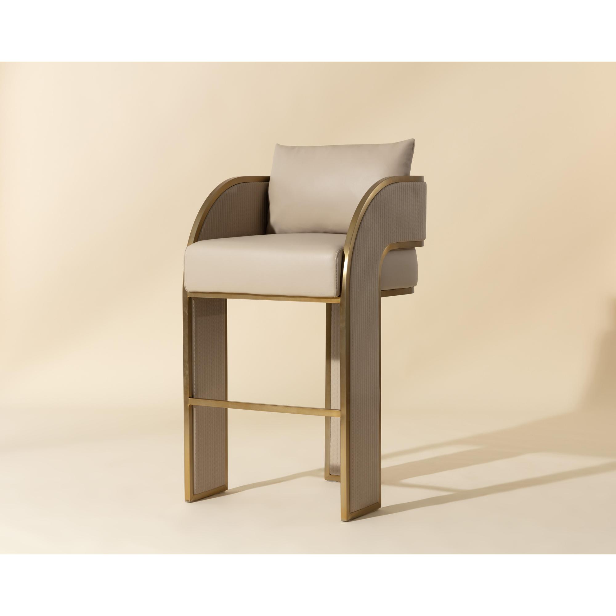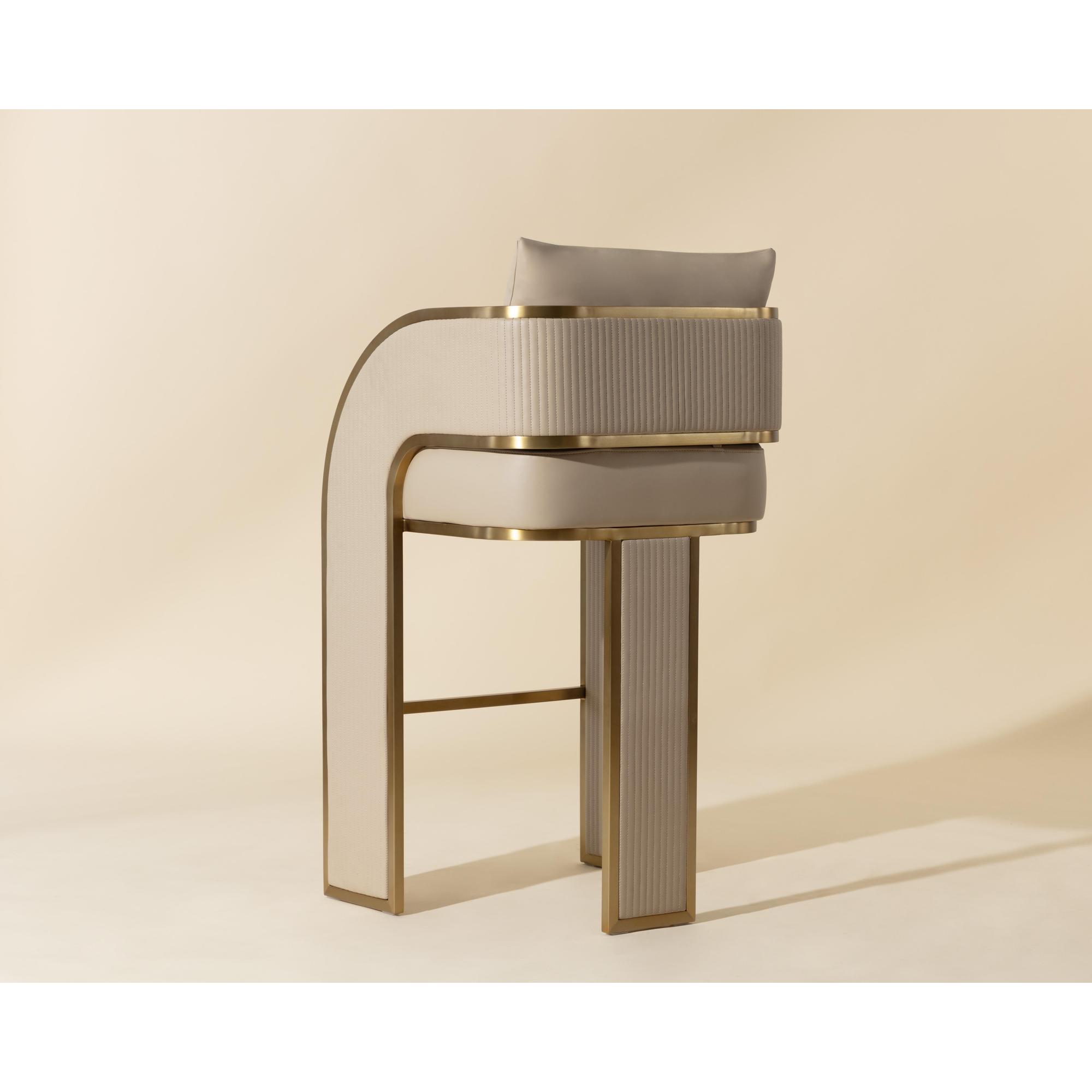 Bold and stylish, the Baz Barstool is sure to turn heads. Featuring a daring silhouette upholstered in napa beige faux leather. Gold stainless steel detailing and channel stitching add depth and visual impact to the overall look of the piece.