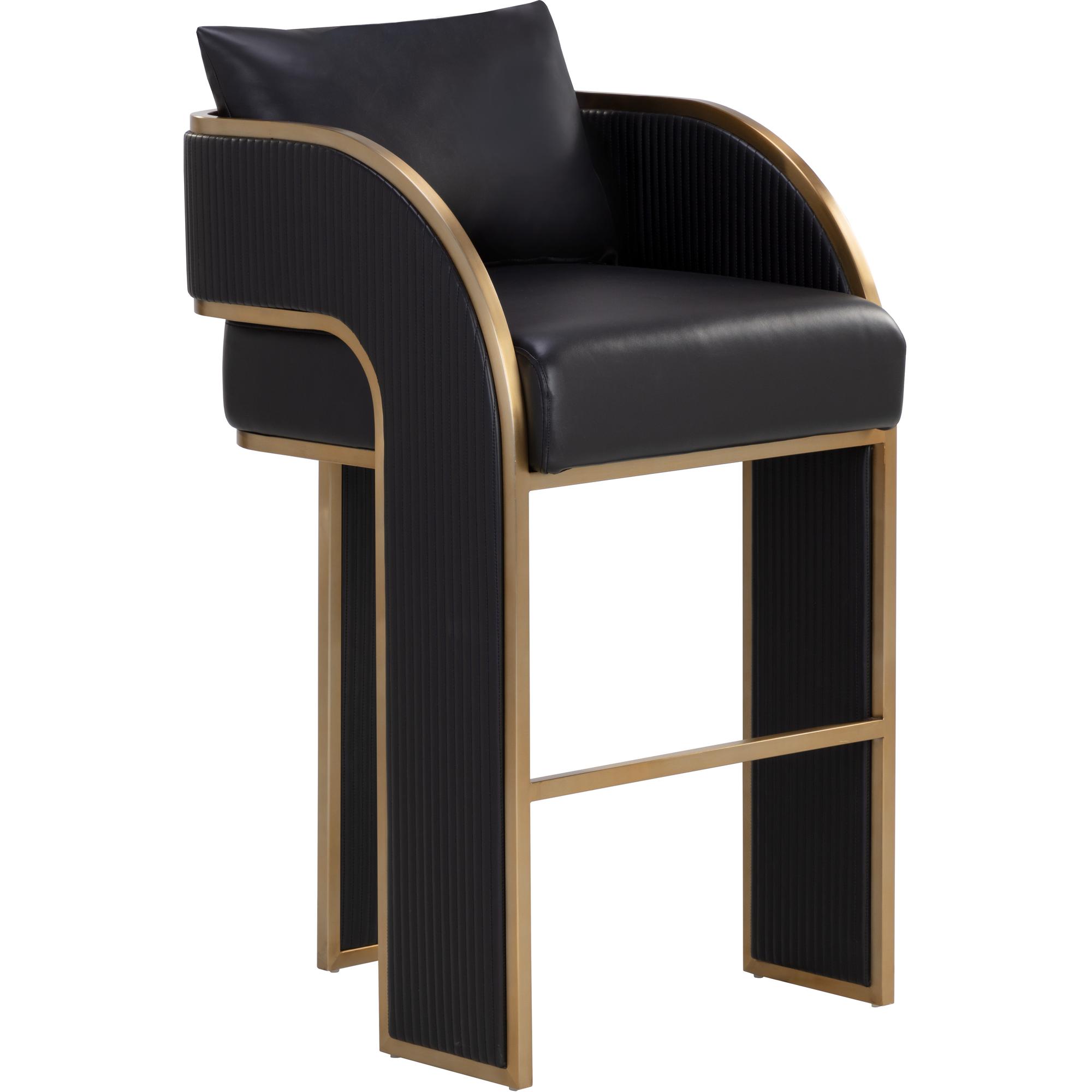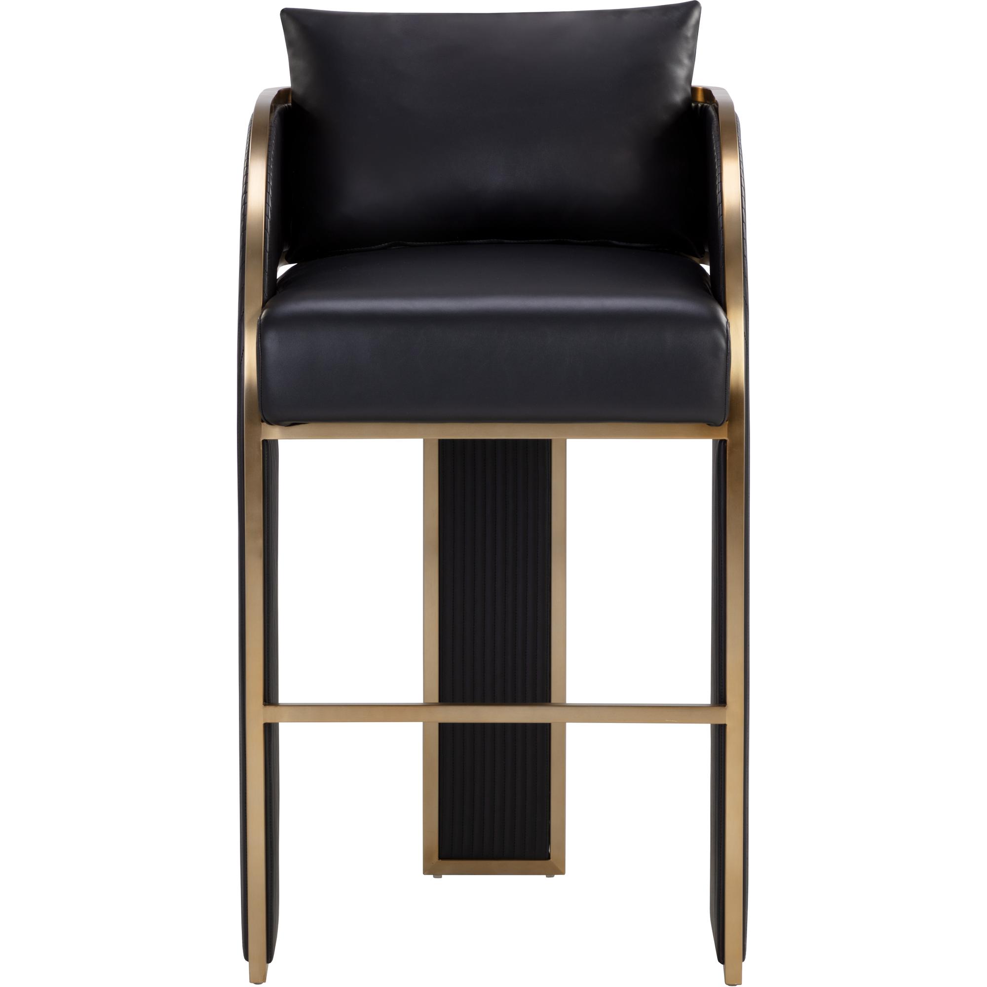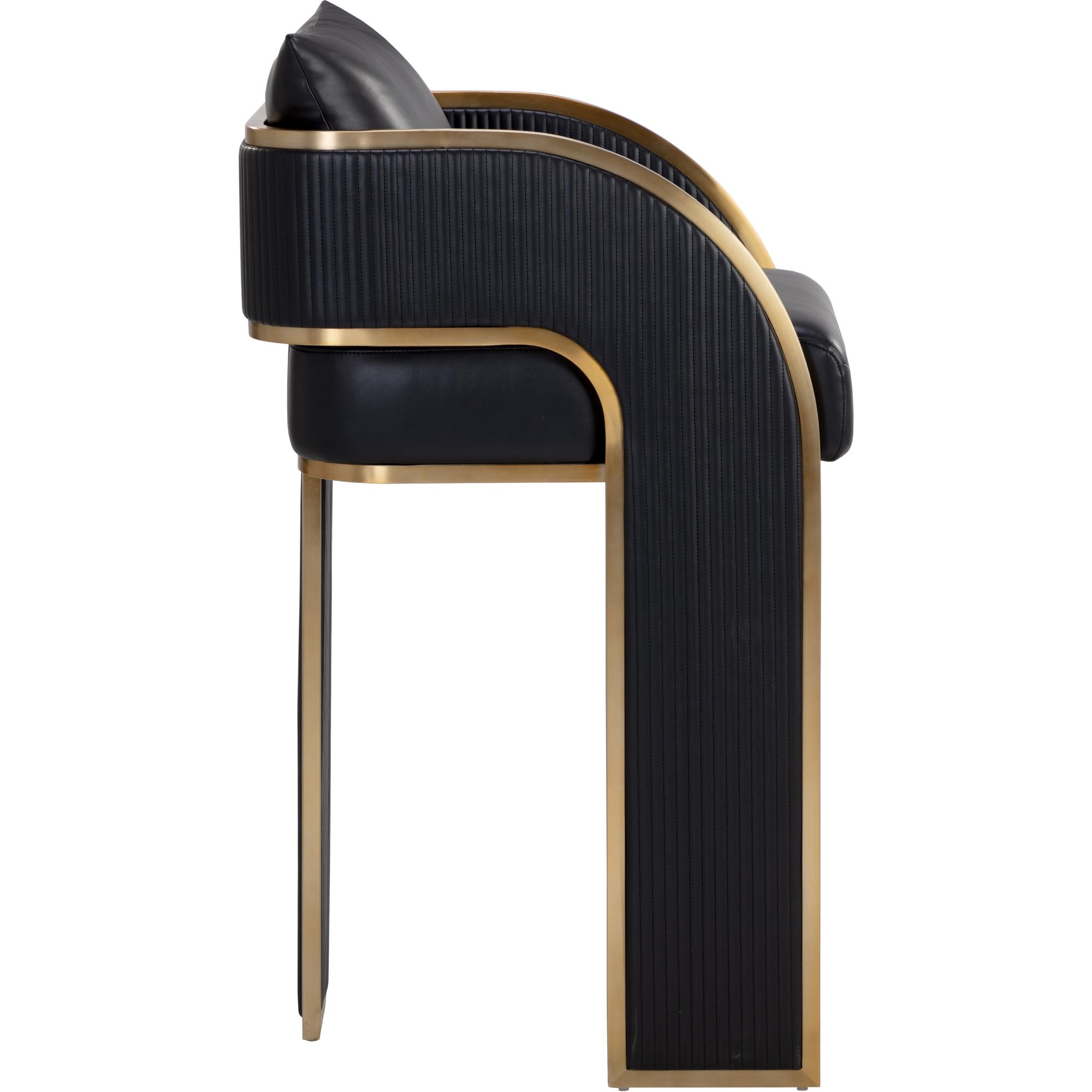Bold and stylish, the Baz Barstool is sure to turn heads. Featuring a daring silhouette upholstered in napa black faux leather. Gold stainless steel detailing and channel stitching add depth and visual impact to the overall look of the piece.