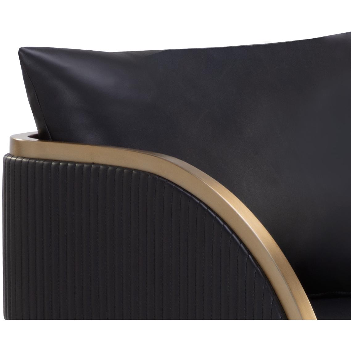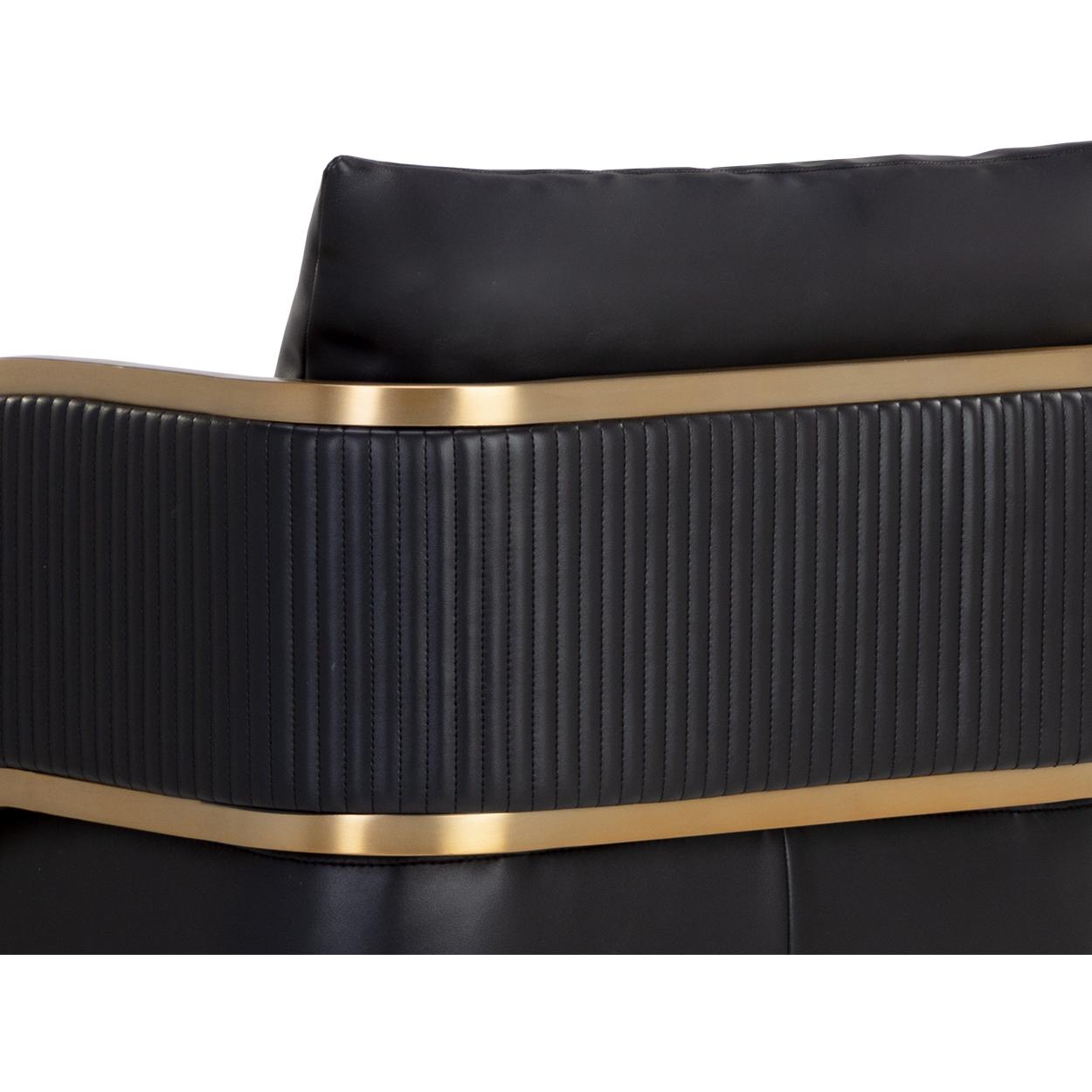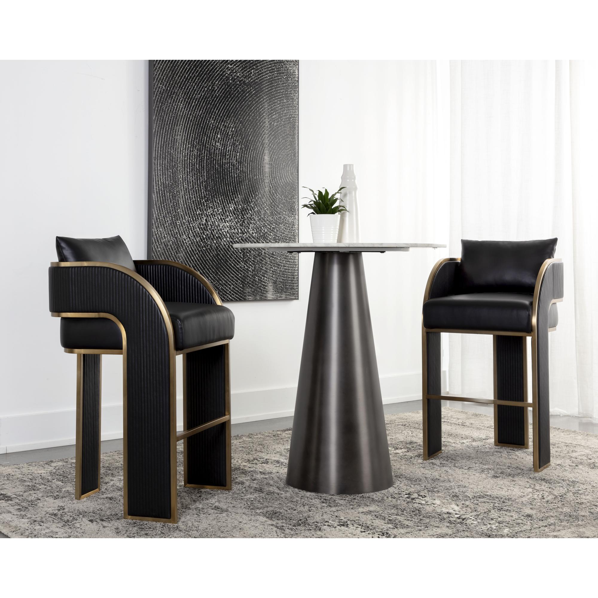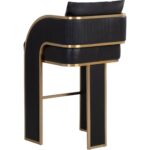 Bold and stylish, the Baz Barstool is sure to turn heads. Featuring a daring silhouette upholstered in napa black faux leather. Gold stainless steel detailing and channel stitching add depth and visual impact to the overall look of the piece.
