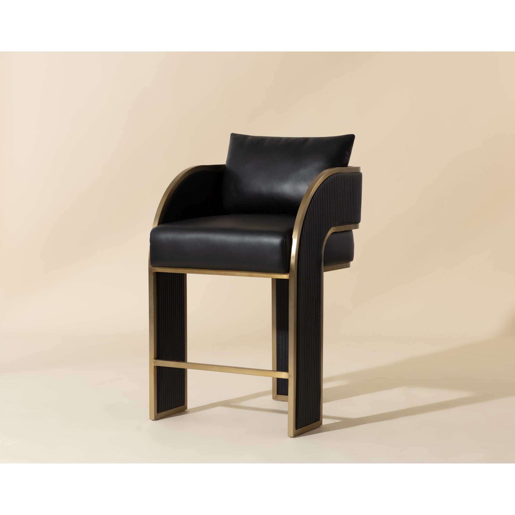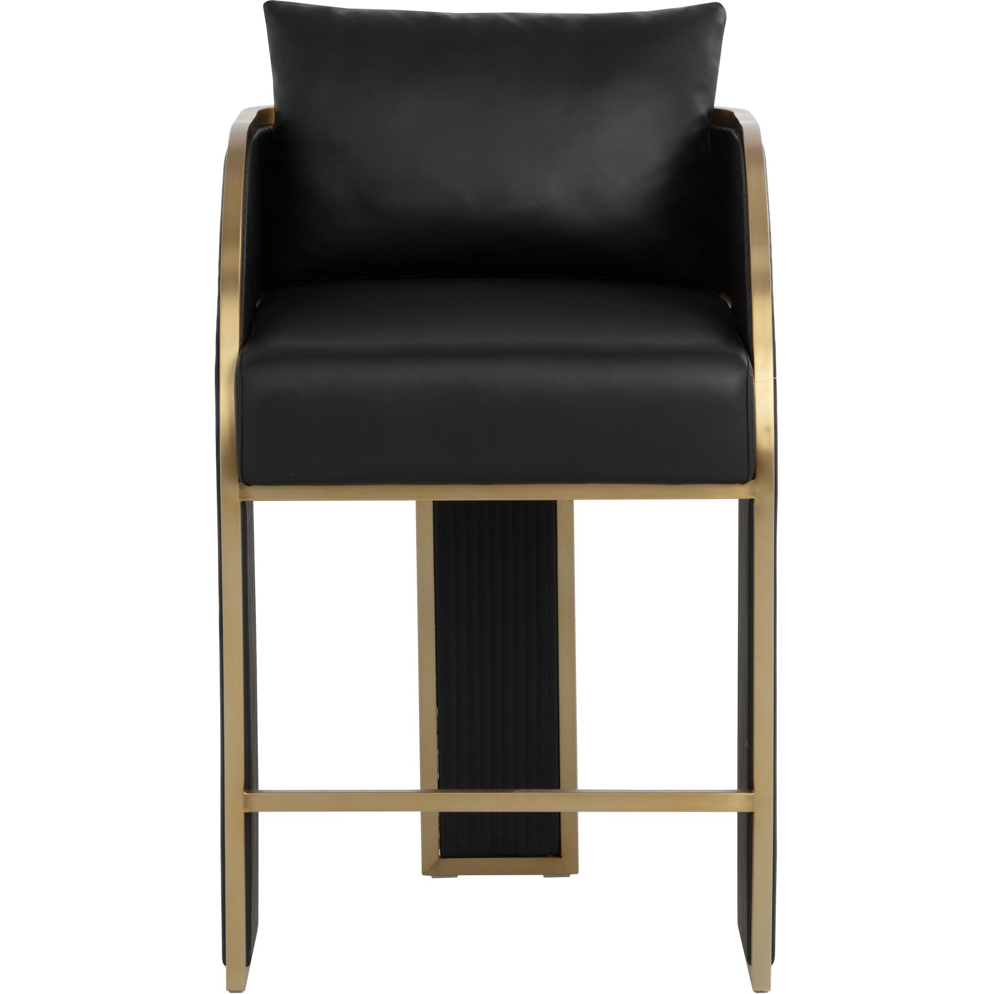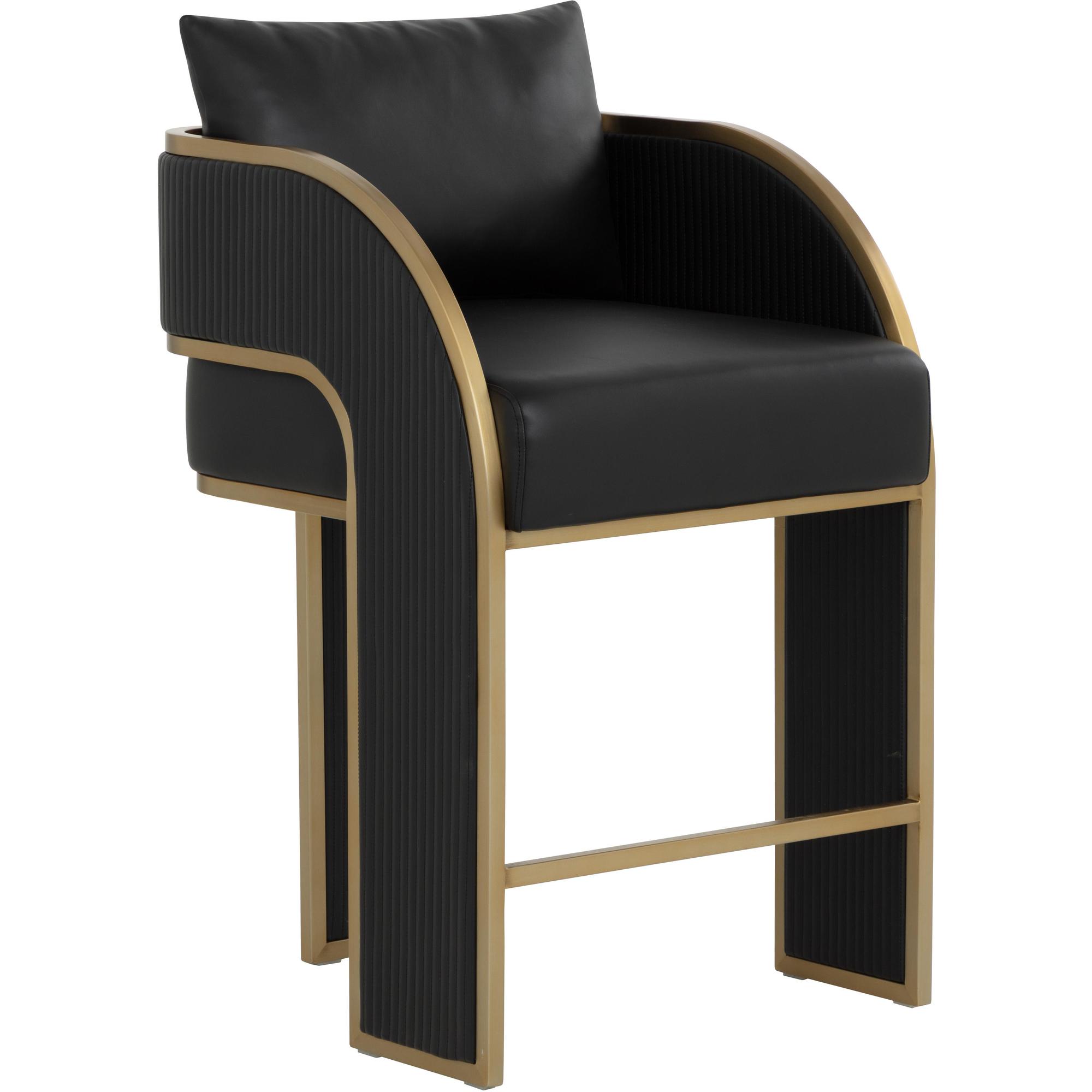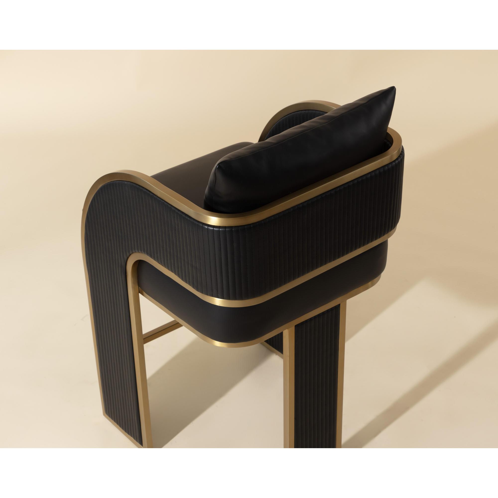 Bold and stylish, the Baz Counter Stool is sure to turn heads. Featuring a daring silhouette upholstered in napa black faux leather. Gold stainless steel detailing and channel stitching add depth and visual impact to the overall look of the piece.