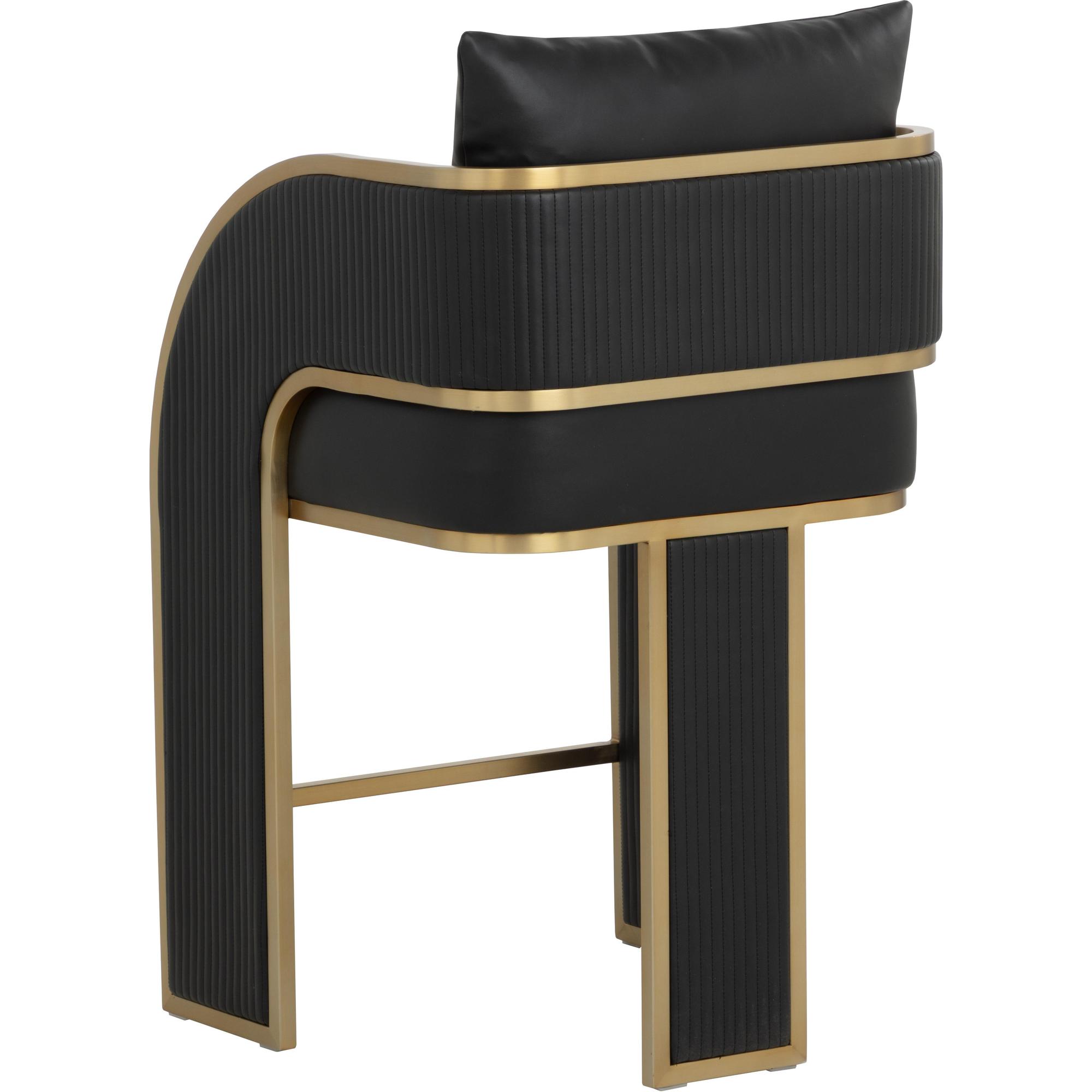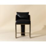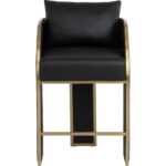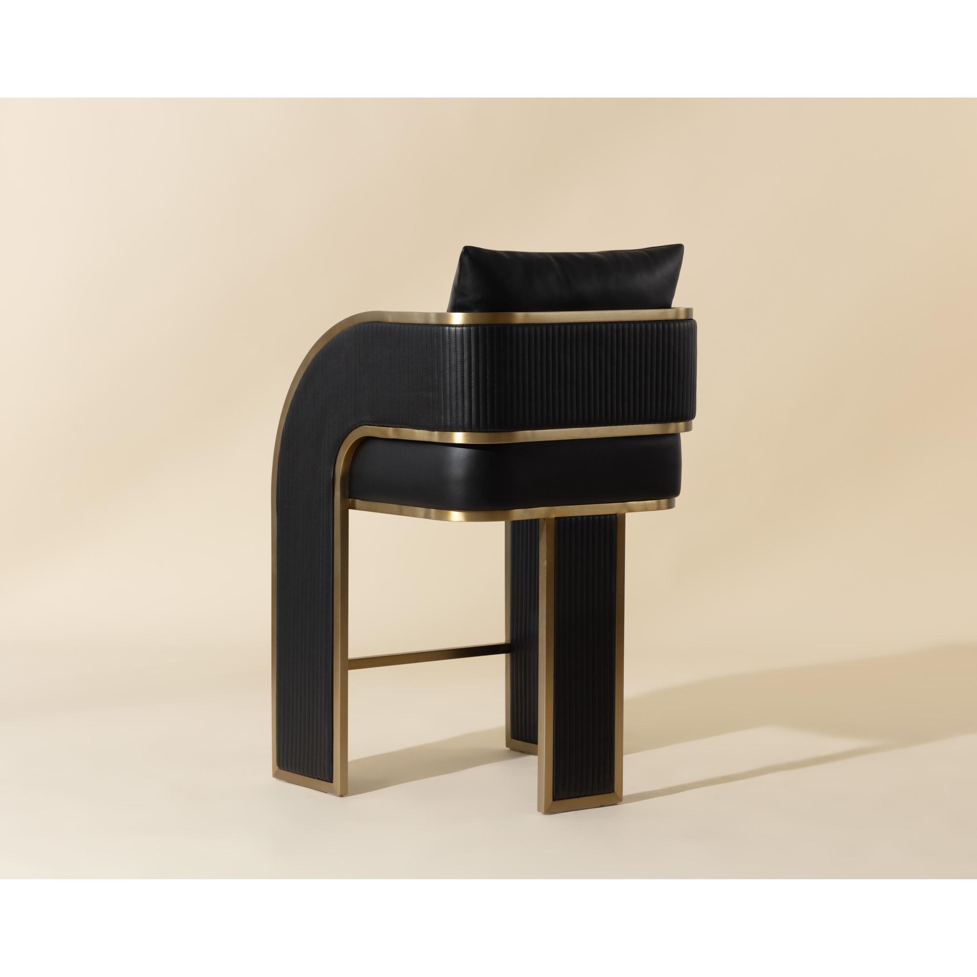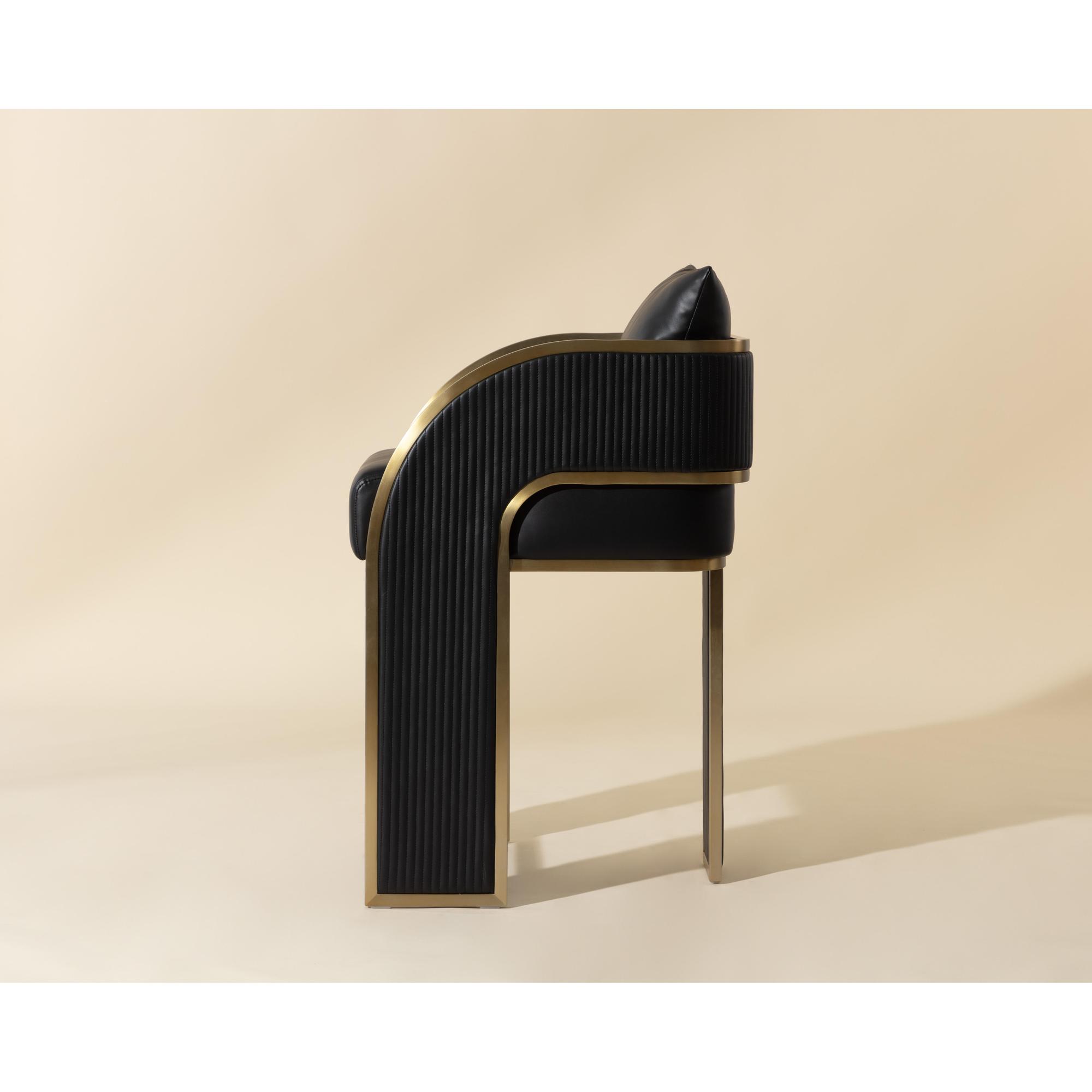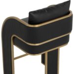 Bold and stylish, the Baz Counter Stool is sure to turn heads. Featuring a daring silhouette upholstered in napa black faux leather. Gold stainless steel detailing and channel stitching add depth and visual impact to the overall look of the piece.