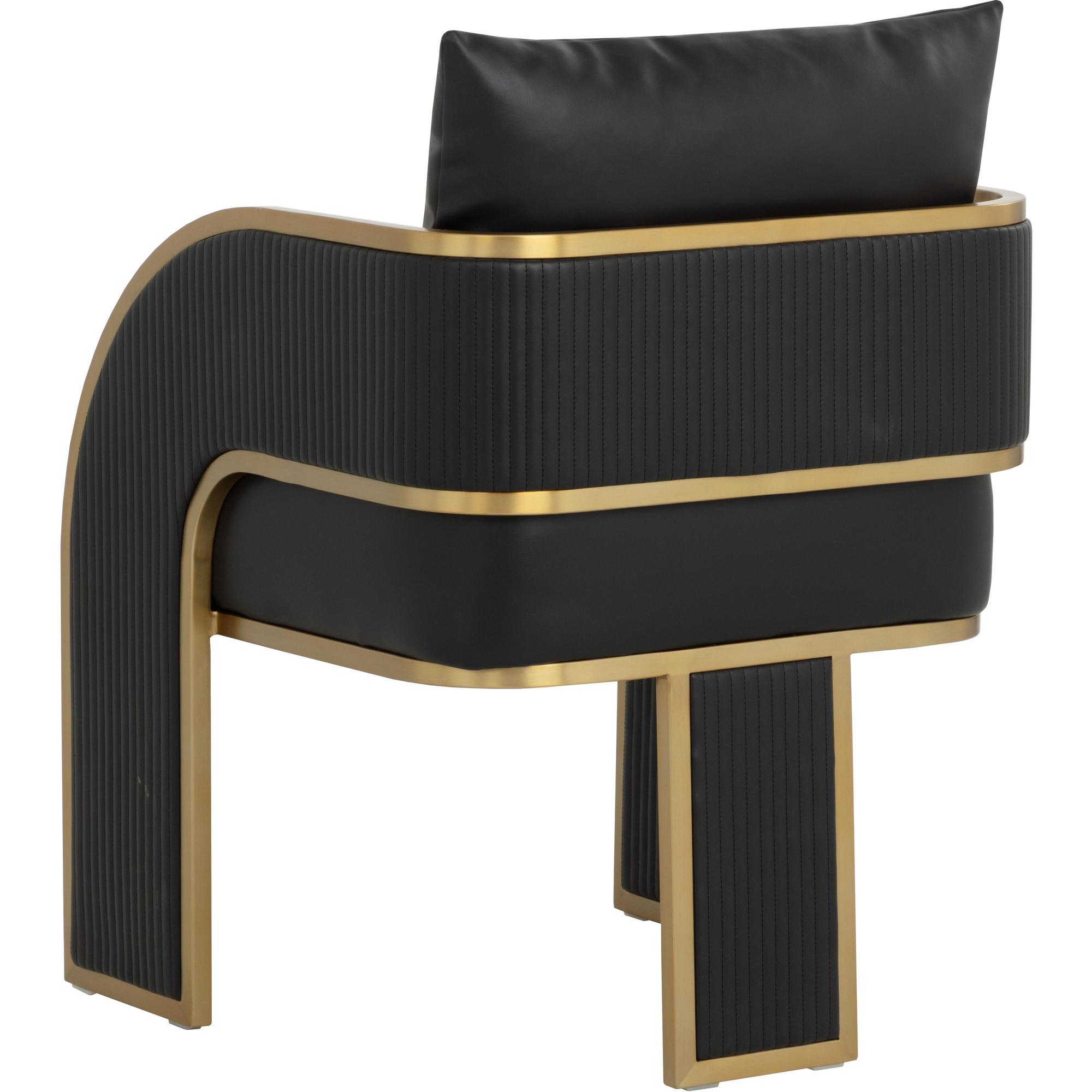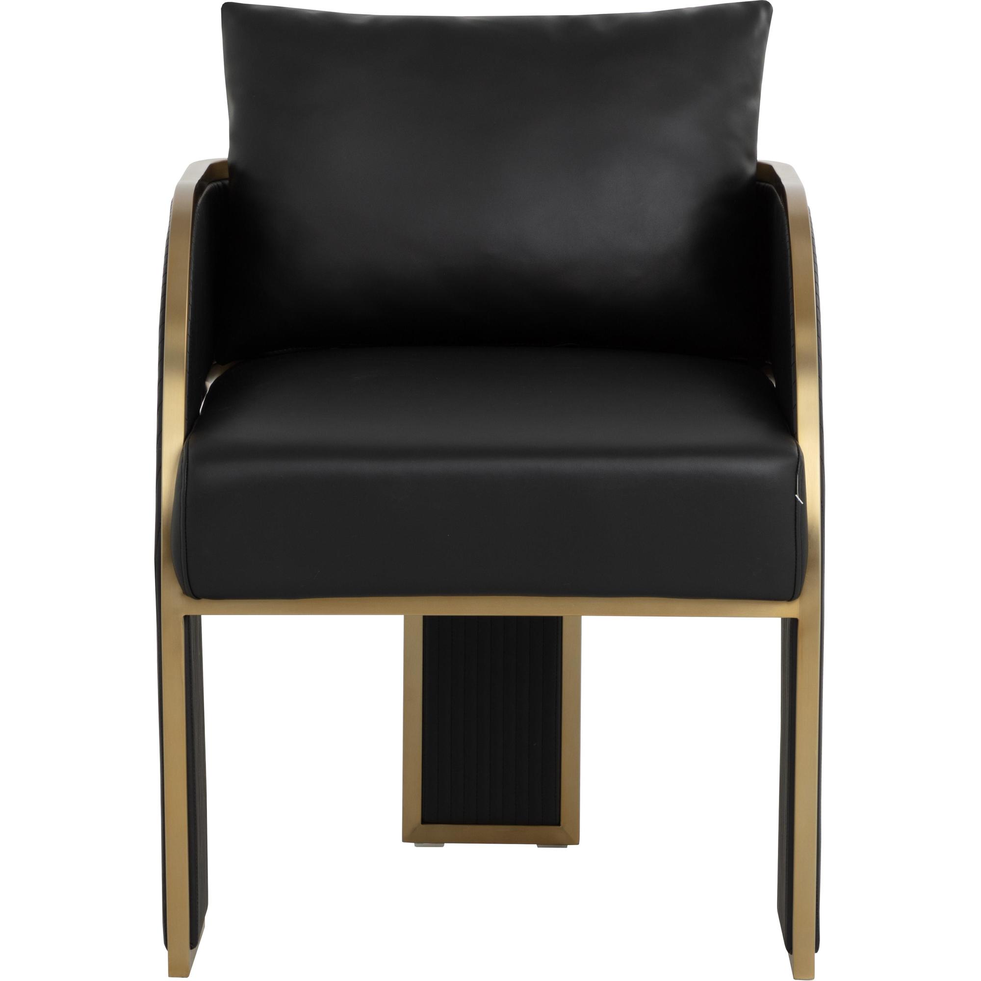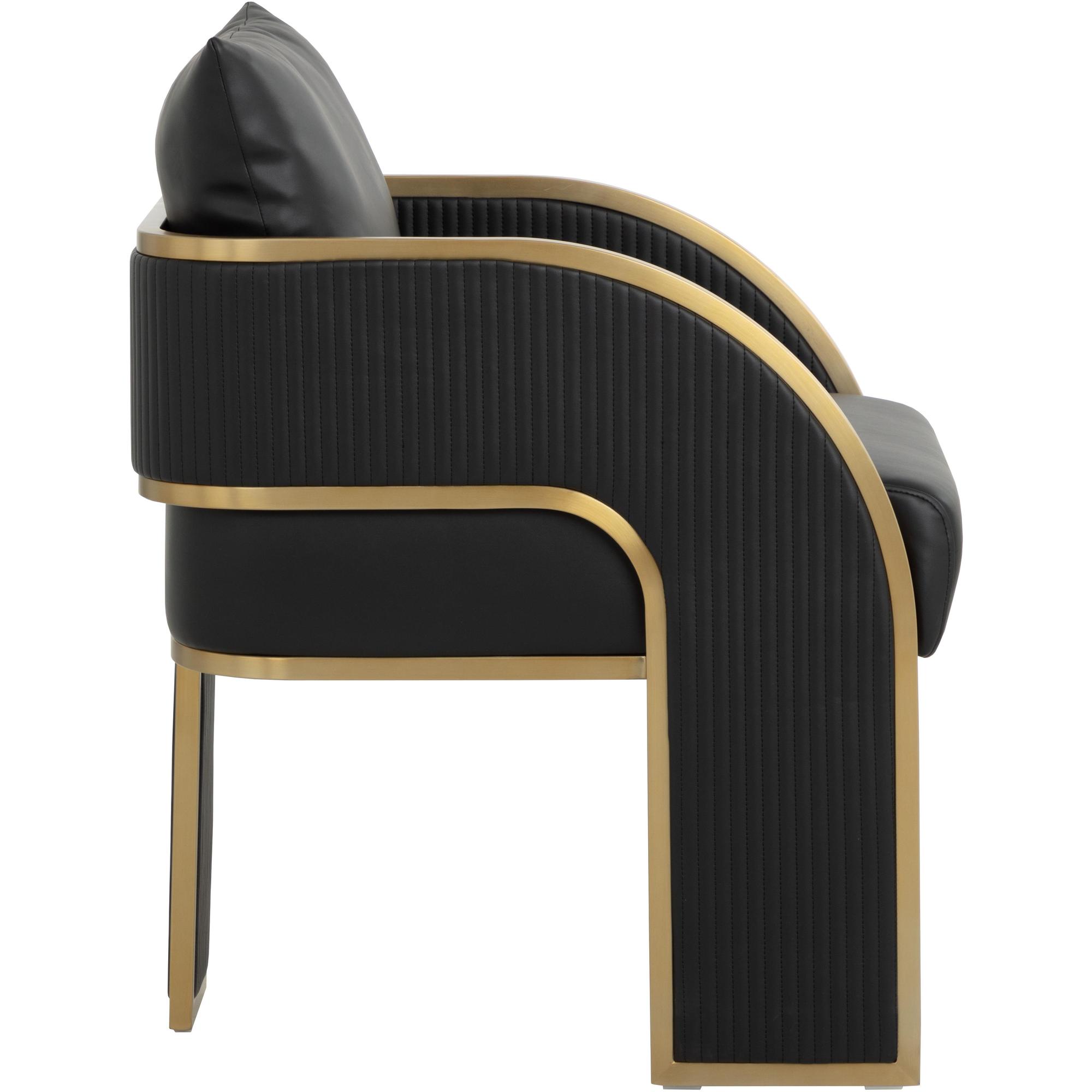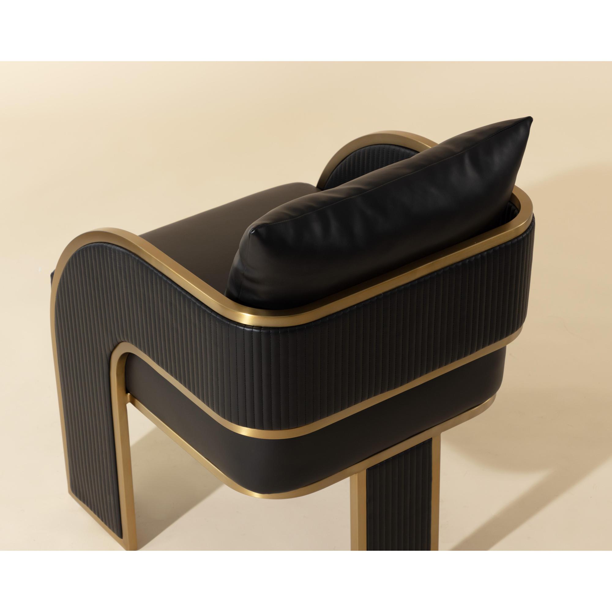 Bold and stylish, the Baz Dining Armchair is sure to turn heads. Featuring a daring silhouette upholstered in napa black faux leather. Gold stainless steel detailing and channel stitching add depth and visual impact to the overall look of the piece.