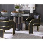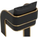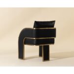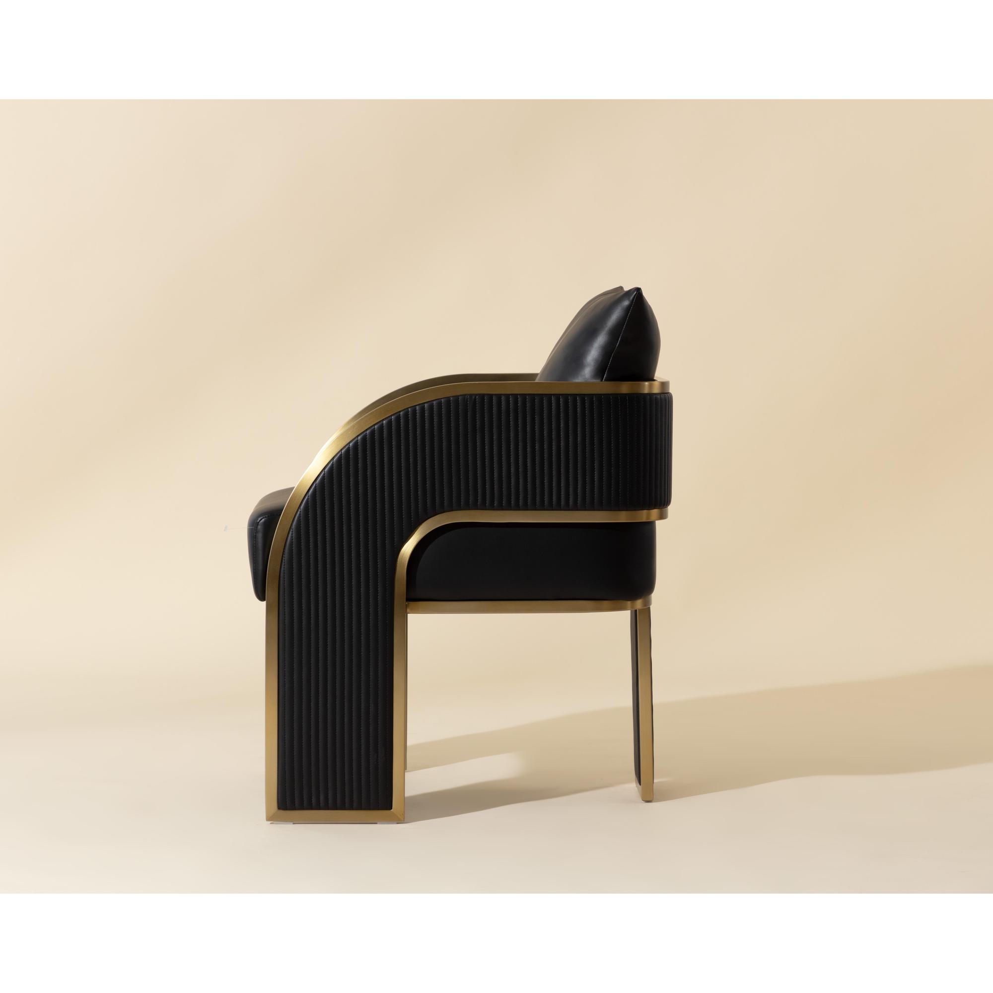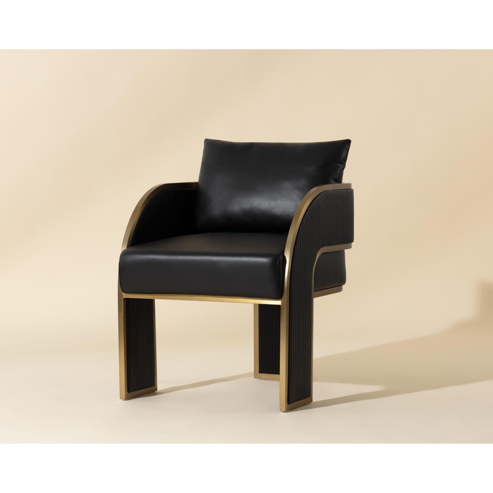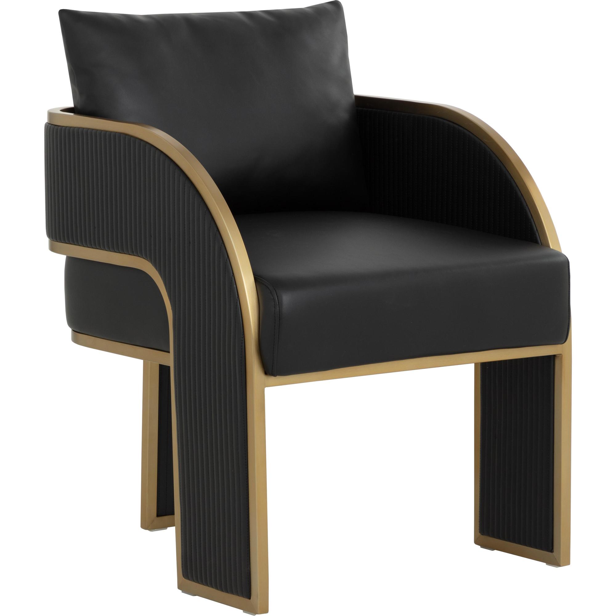 Bold and stylish, the Baz Dining Armchair is sure to turn heads. Featuring a daring silhouette upholstered in napa black faux leather. Gold stainless steel detailing and channel stitching add depth and visual impact to the overall look of the piece.