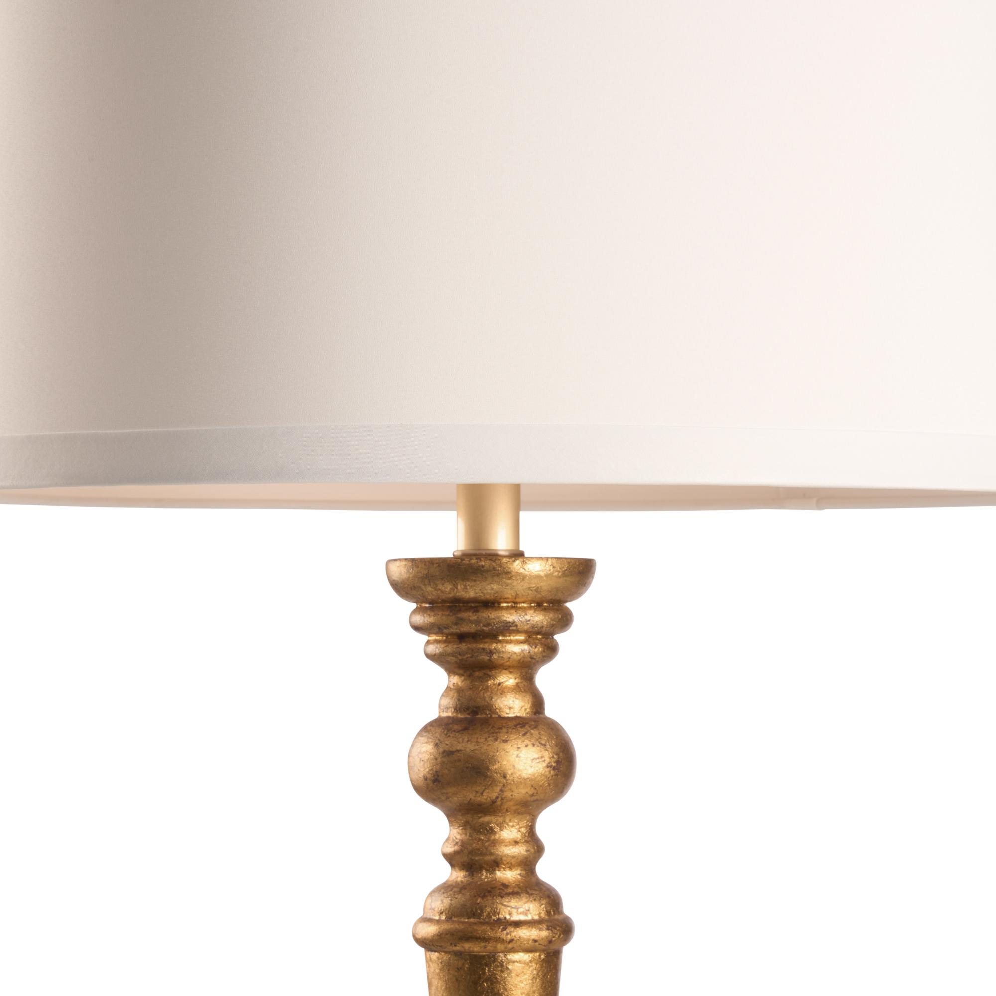 This classic floor lamp features an elegant, timeless design with an aged gold finish that lends a touch of vintage charm.