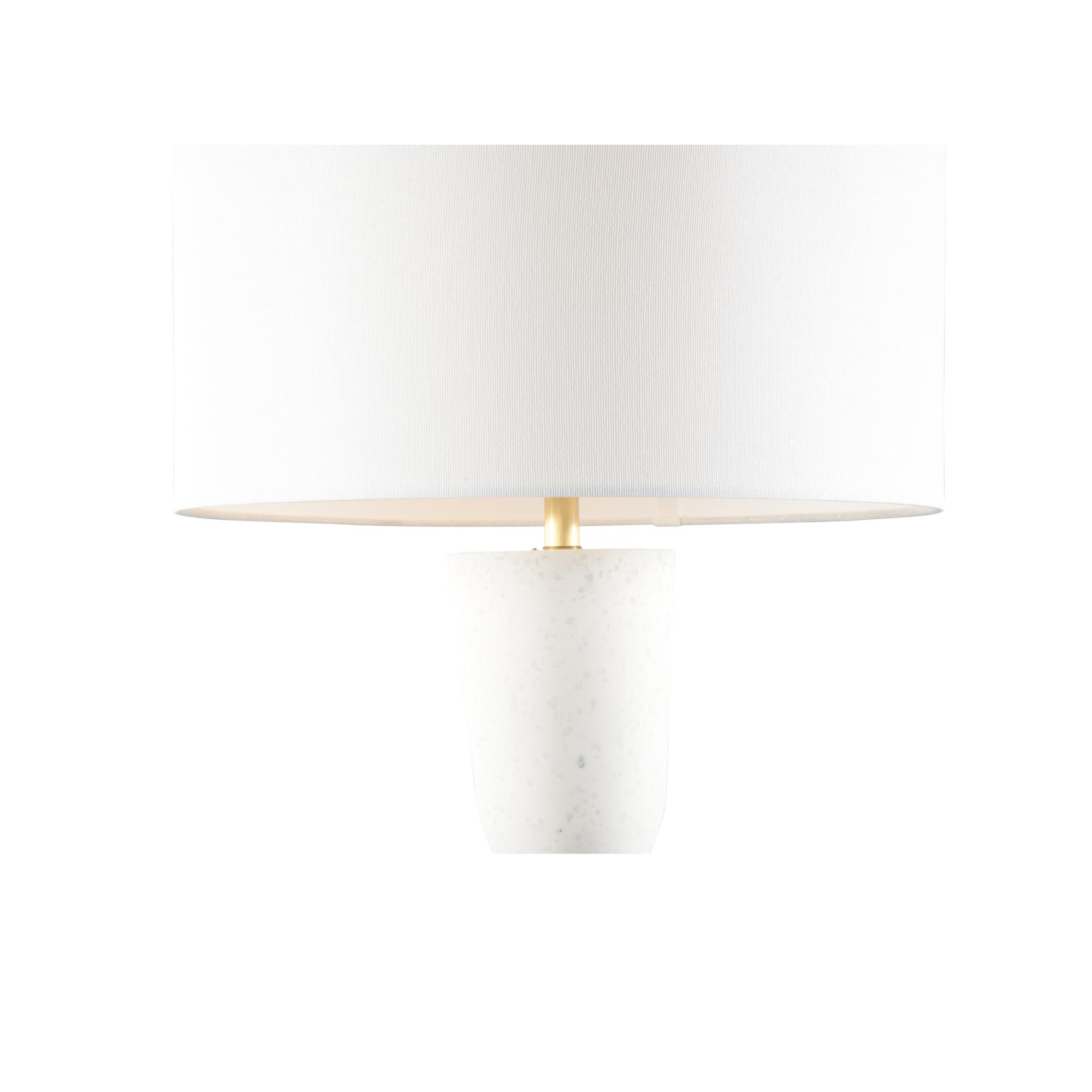 A composition of white terrazzo forms atop one another to create a sculptural design. This modern, minimalist piece exudes balance and symmetry.