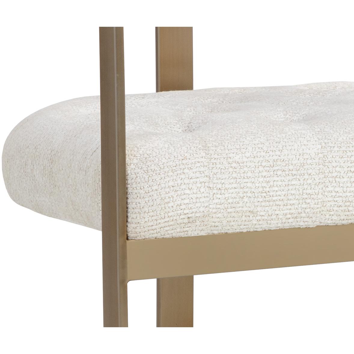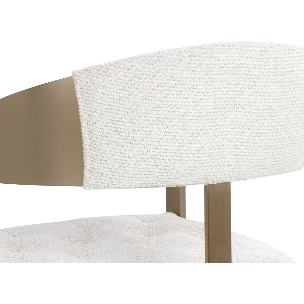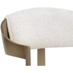 This ultra contemporary stool features a T-shaped back, tapered arms and a powder-coated antique brass stainless steel crown base. Stocked in rhea light barley fabric. Perfectly suited for commercial and residential settings. Suitable for various dining, kitchen and bar spaces of all sizes.