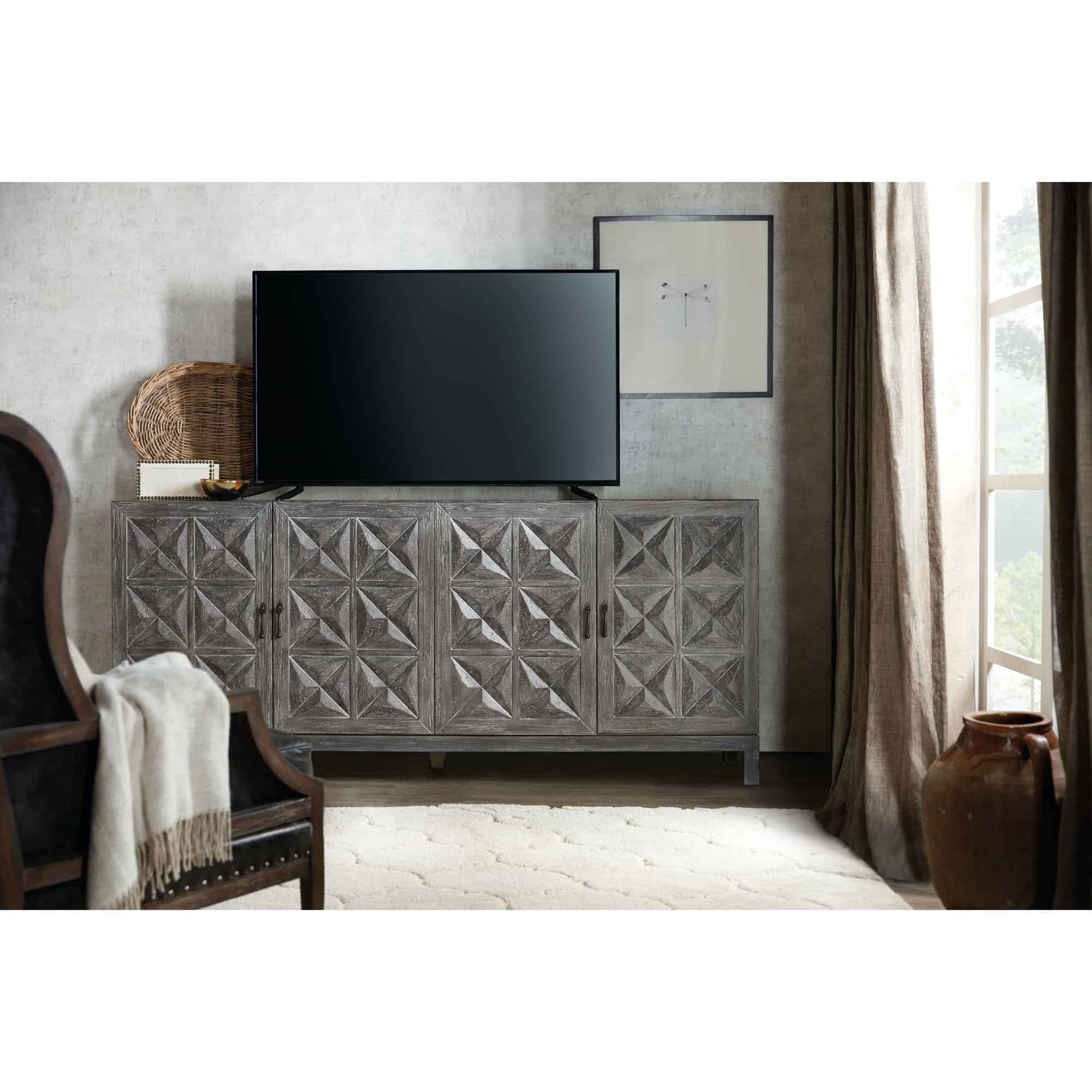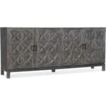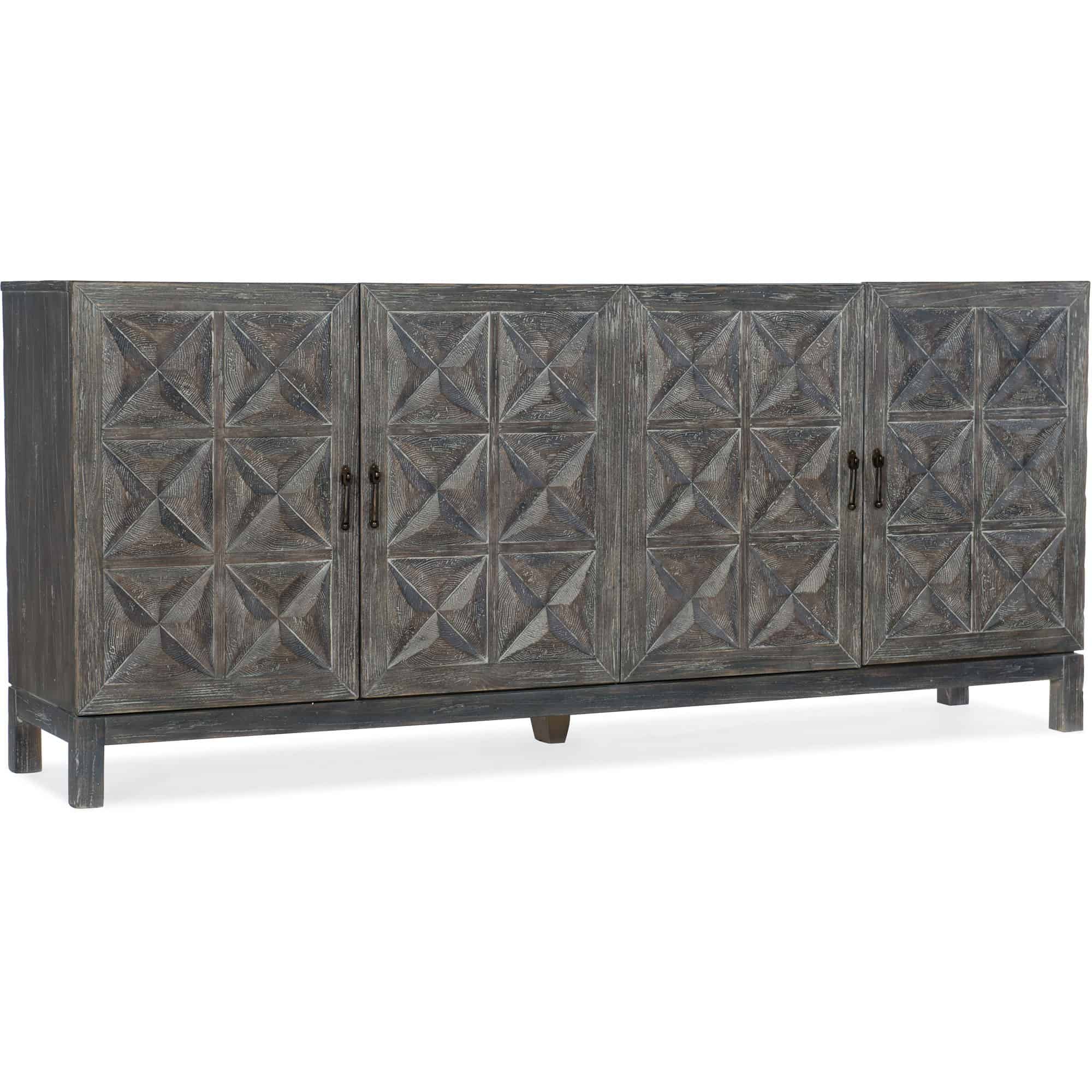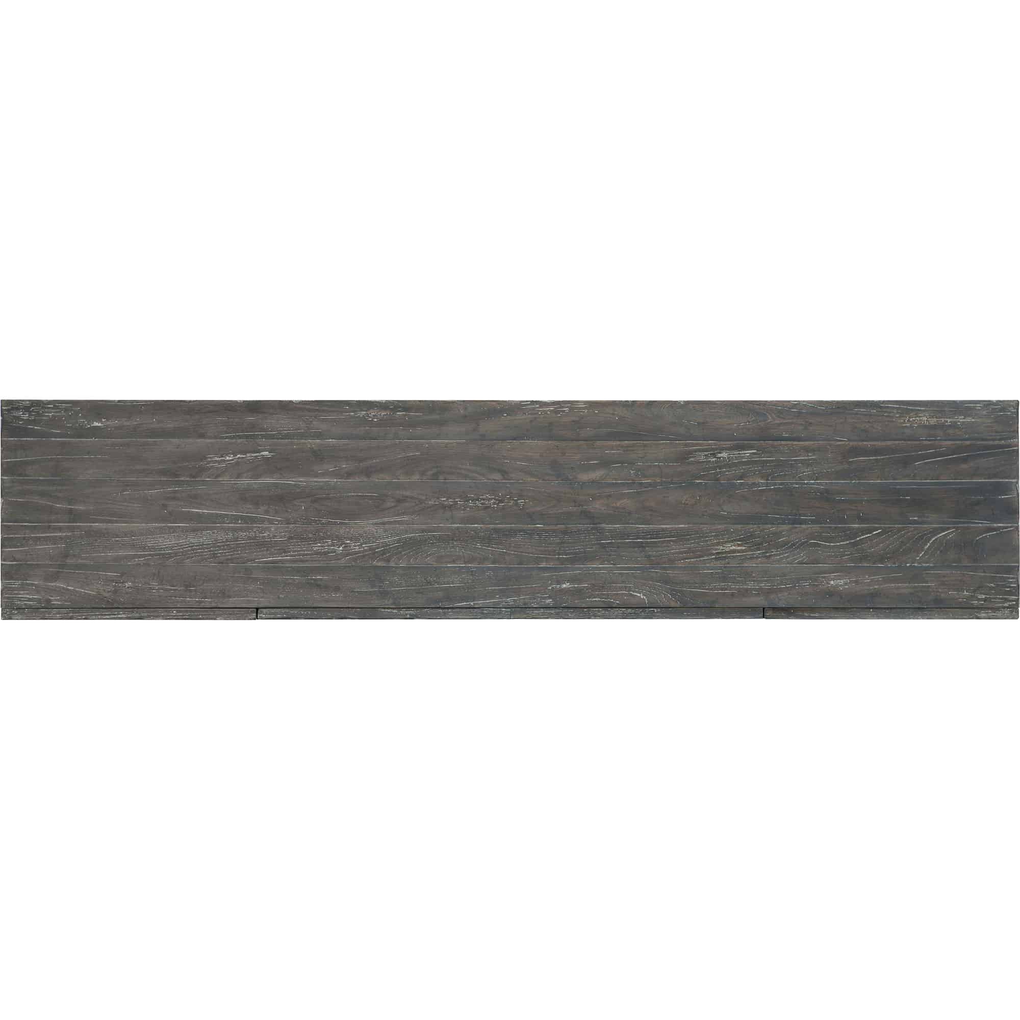 Finish: Shale: a soft grey with natural wood undertones. Mottled copper hardware. Distressing includes rasping, chopping, gouging and worm holes.