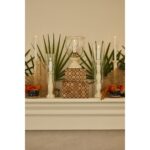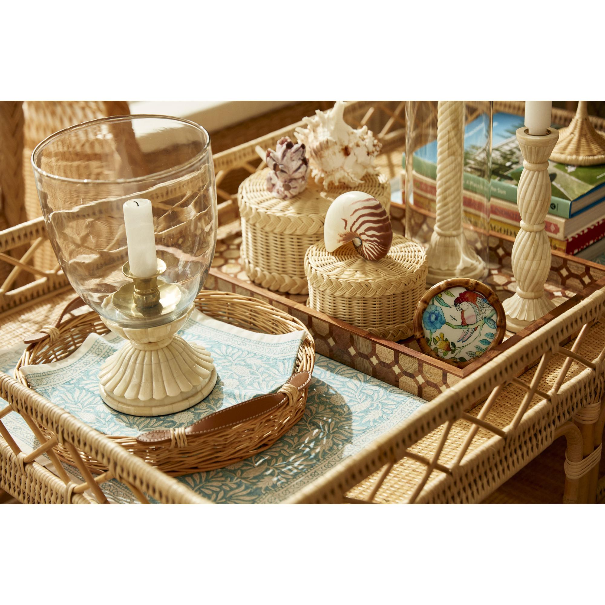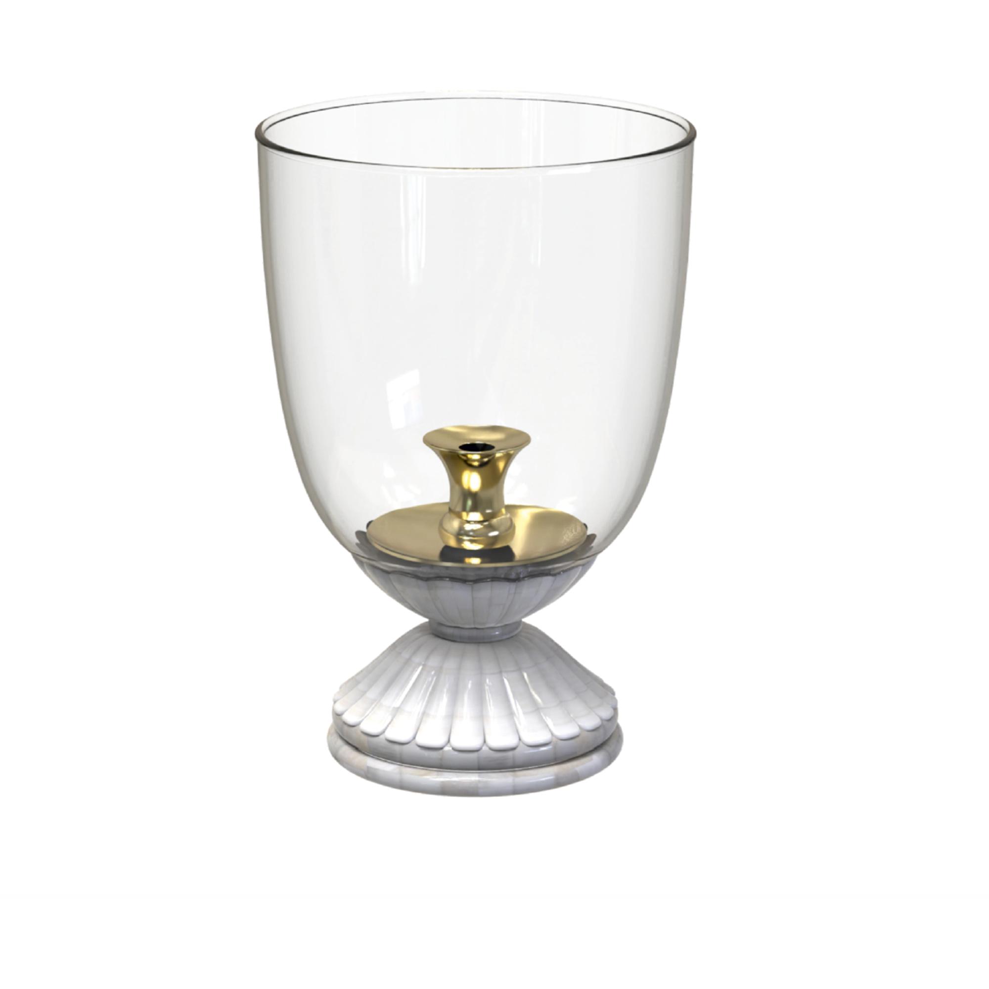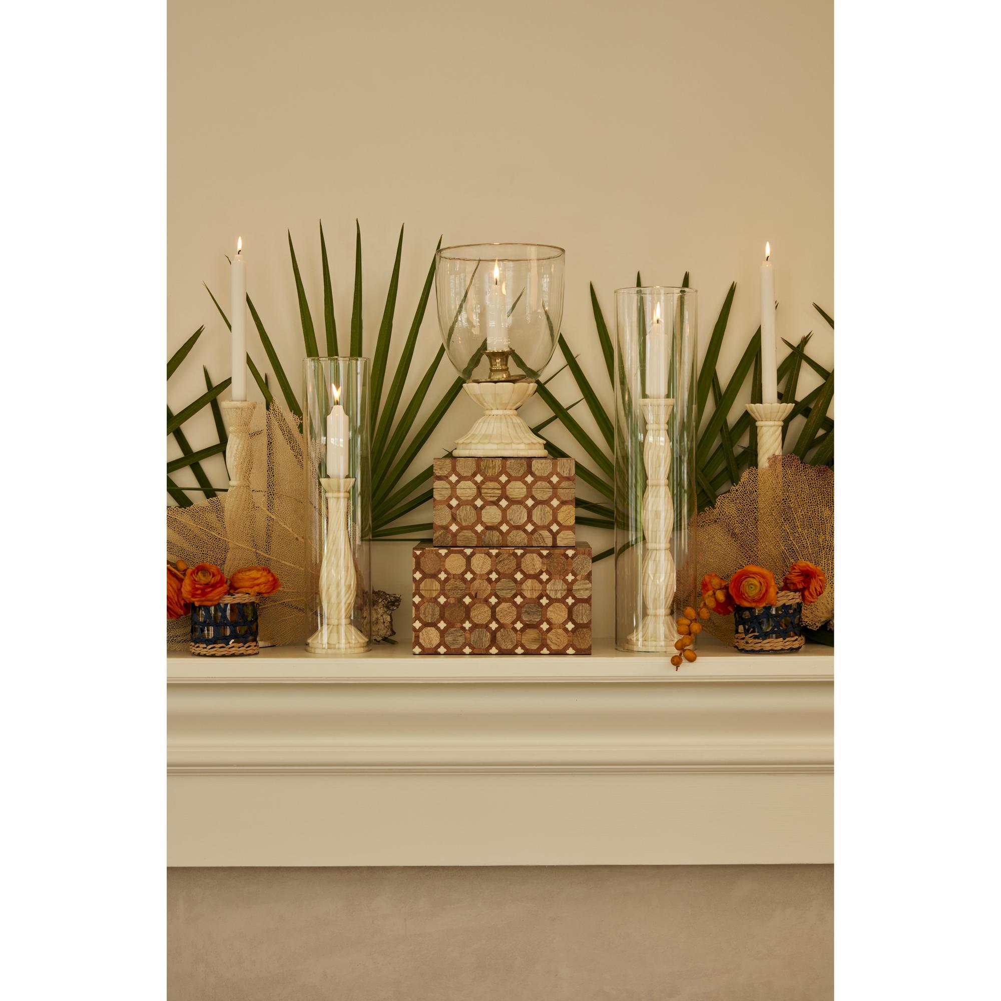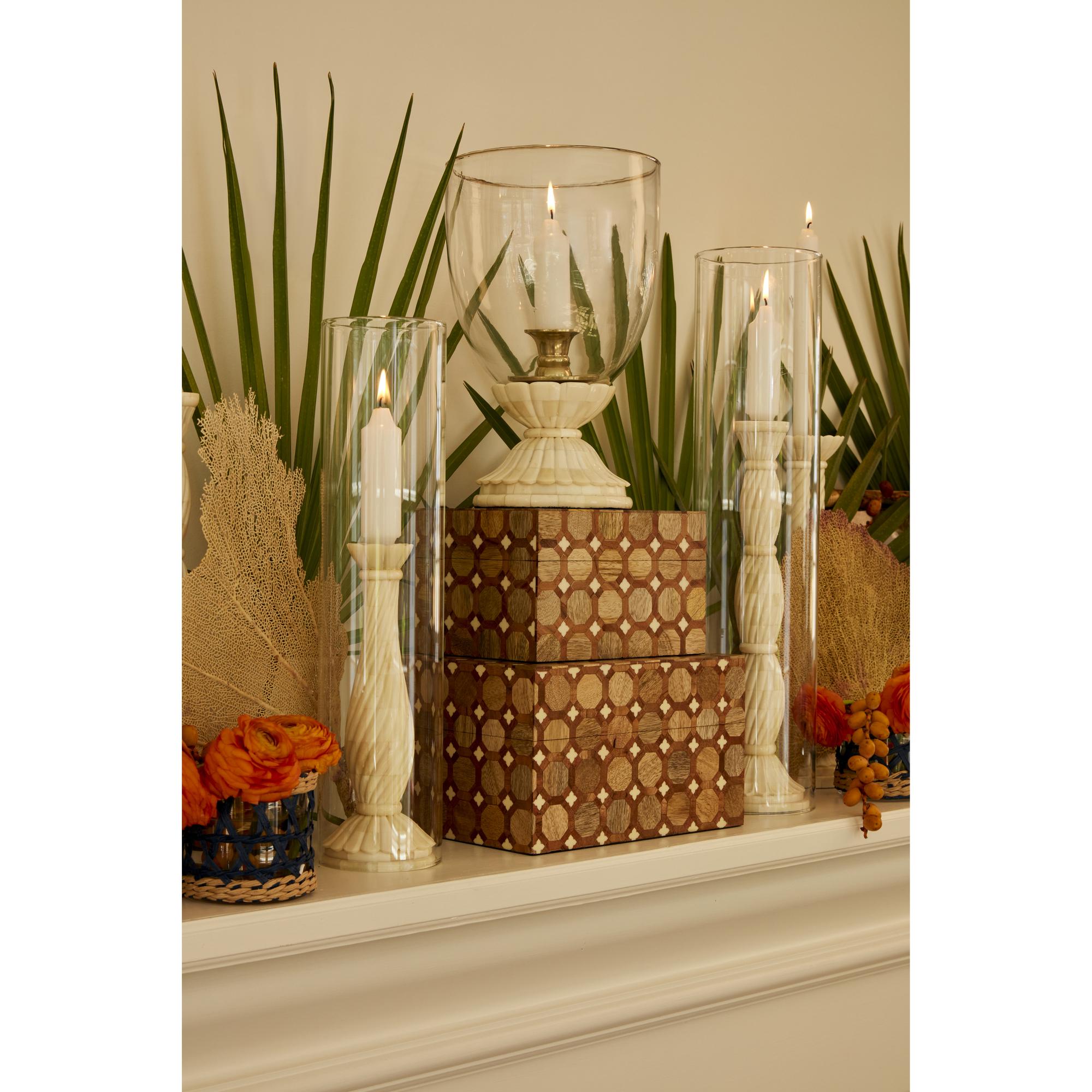 Our Beaumont Hurricane looks to the manor born. The elegant pedestal is hand carved from found natural bone in a gathered twist silhouette and crowned with solid brass candle holder and mouth-blown glass hurricane. Amanda loves this statement-making accent gracing an entryway console, paired on a deep mantel, and marched in multiples down the center of a dining table. The abbreviated height affords dinner guests an unobstructed view for easy conversation.