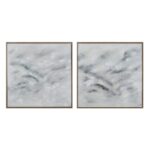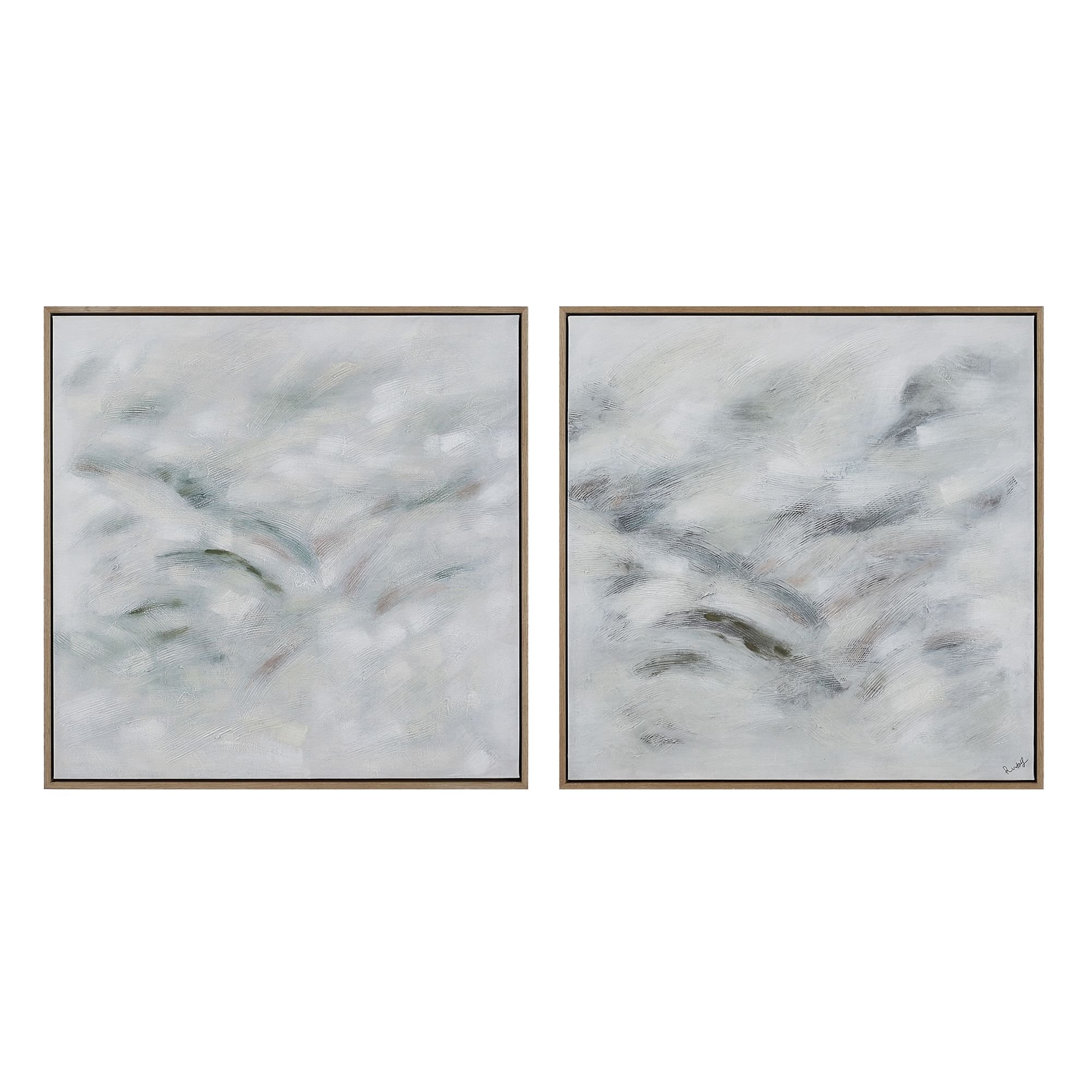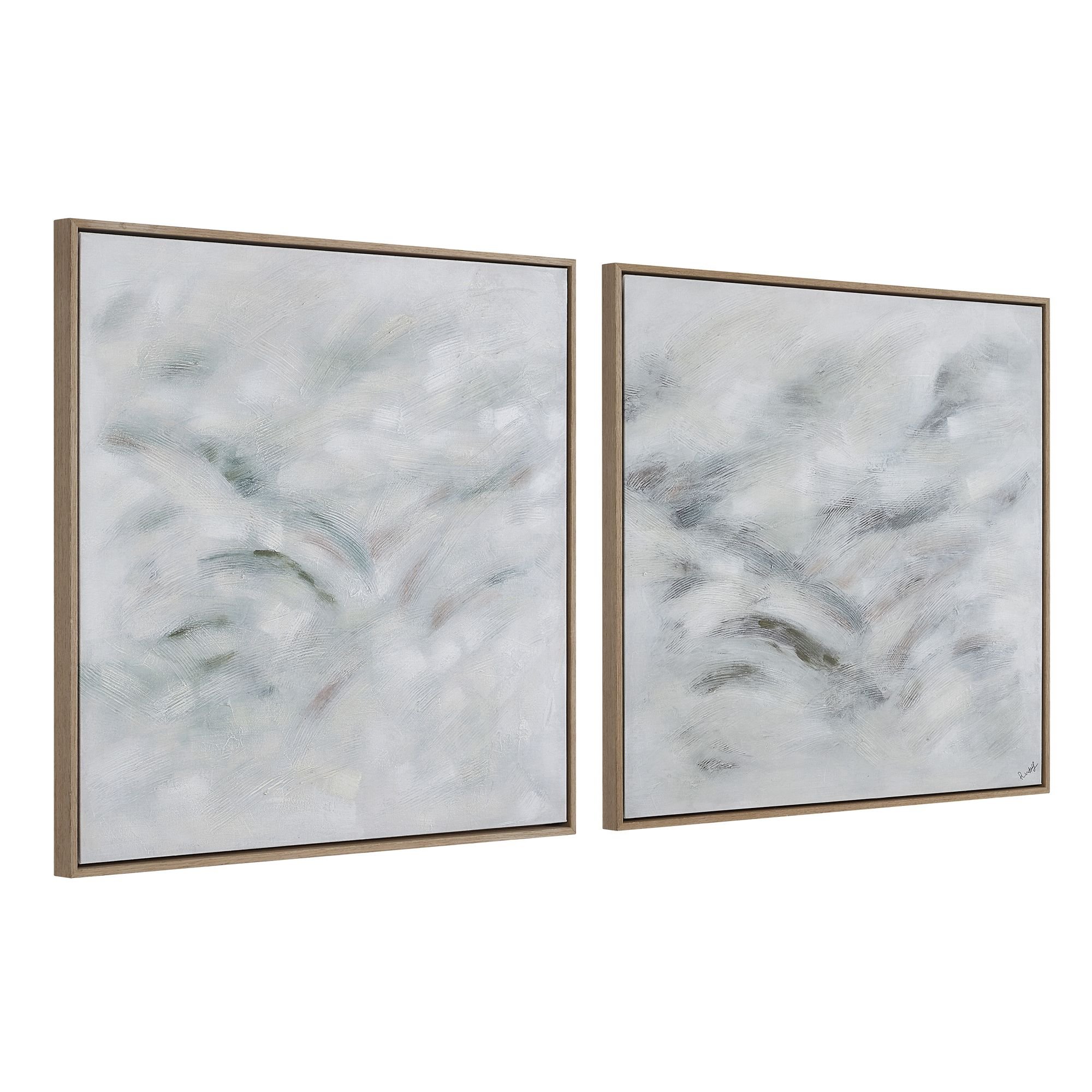 Hand-painted in soft tones with plenty of texture, and framed in medium walnut, this set of two wall art canvases will complete the look of any modern or transitional setting. Displayed side by side, stacked or split up, these paintings offer two-way hanging for styling flexibility and maximum impact.