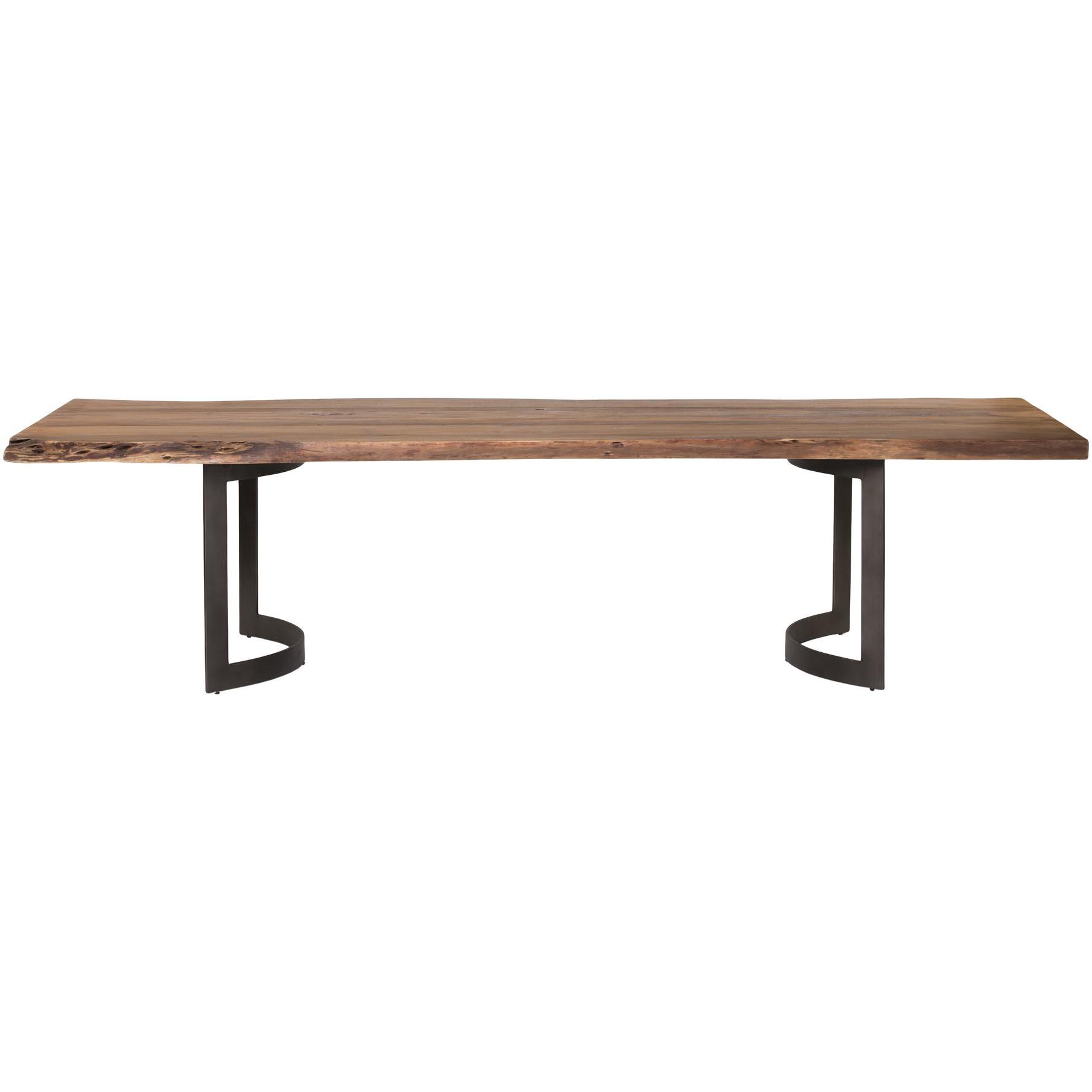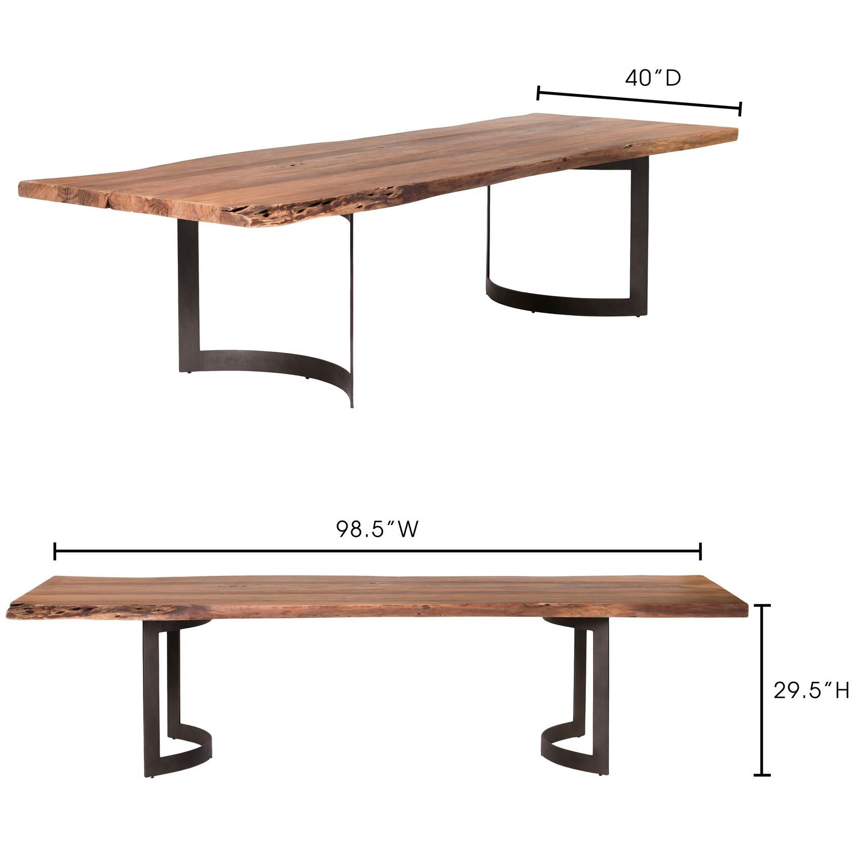Thick-top energy, no fuss. Bent turns solid acacia into a statement surface—grain, knots, and color shifts left proudly visible under a natural, water-based finish. That extra-thick profile casts a bold shadow line, giving the table a sculptural edge without stealing the room. A cast-iron base keeps the look clean and steady, with rust- and corrosion-resistant strength for everyday use. Seats six comfortably, ready for shared plates and big plans from weeknight pasta to weekend projects.