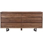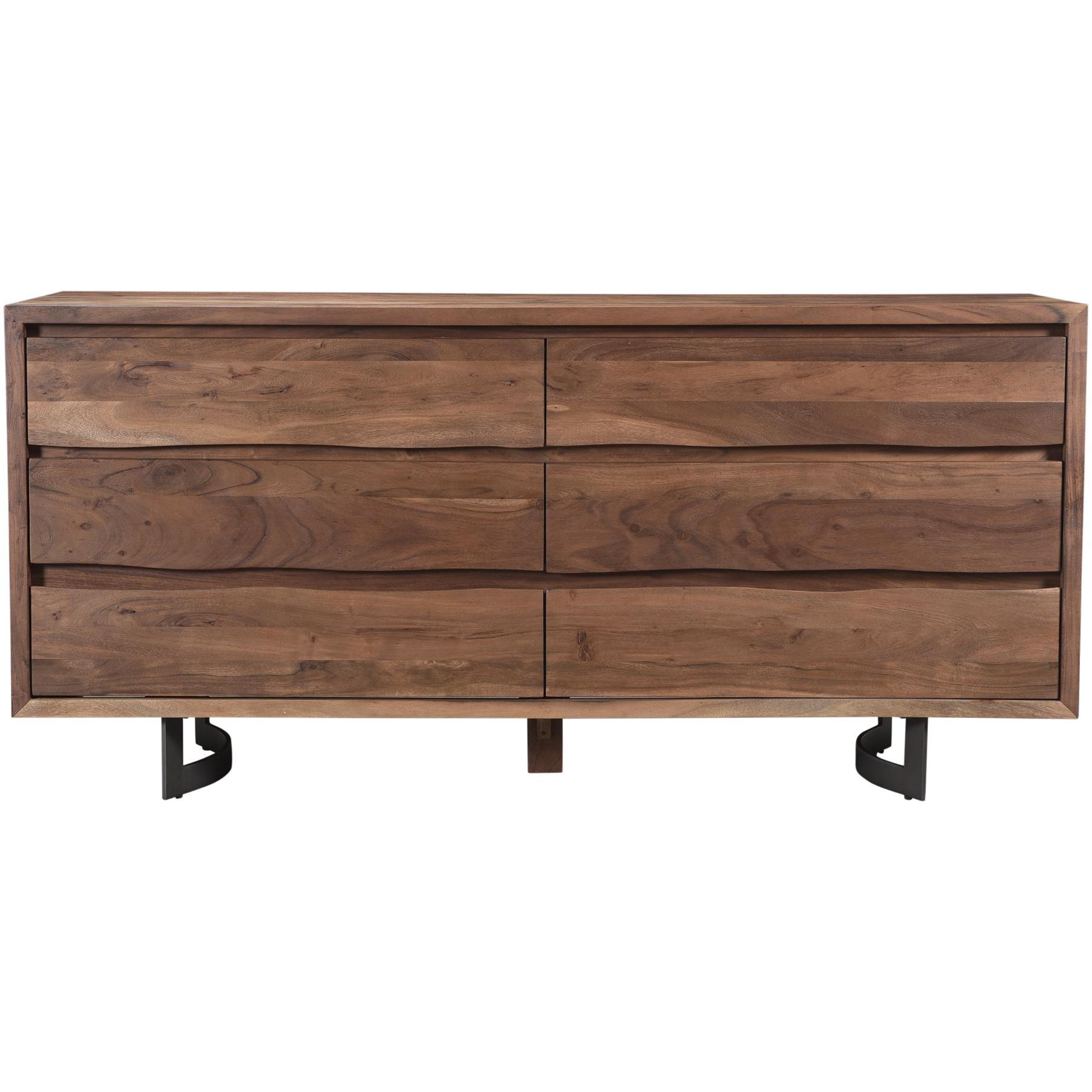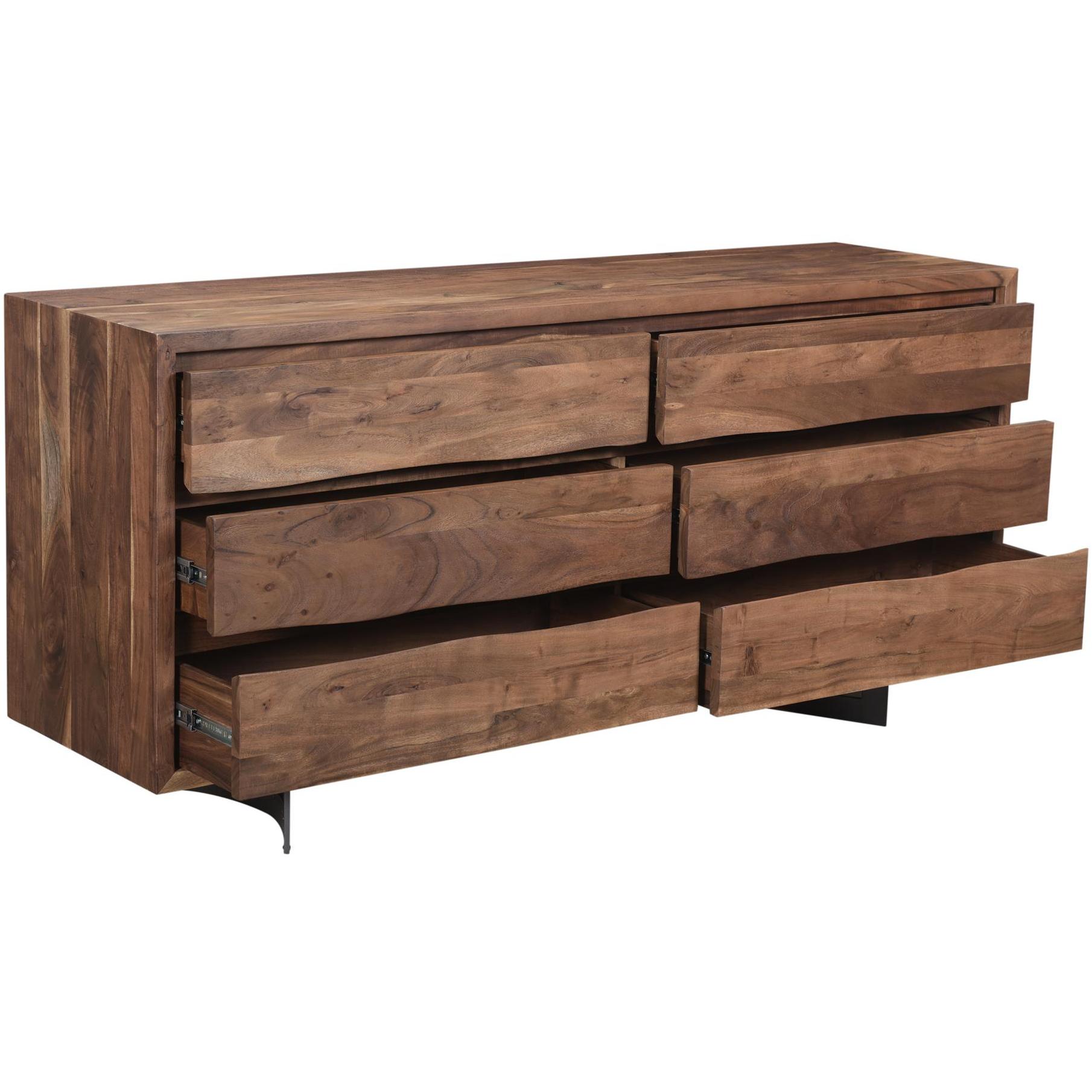 Your bedroom storage, but with some personality. Bent brings solid acacia front and center, showing off live-edge character through knots, whorls, and grain that make every piece feel one-of-a-kind. Six wide drawers keep the day-to-day organized, and easy slide glides make the routine feel smoother. Iron legs add a clean industrial lift, while an MDF back keeps the silhouette tidy from behind. It’s a hardworking dresser that still earns its spot in the room.