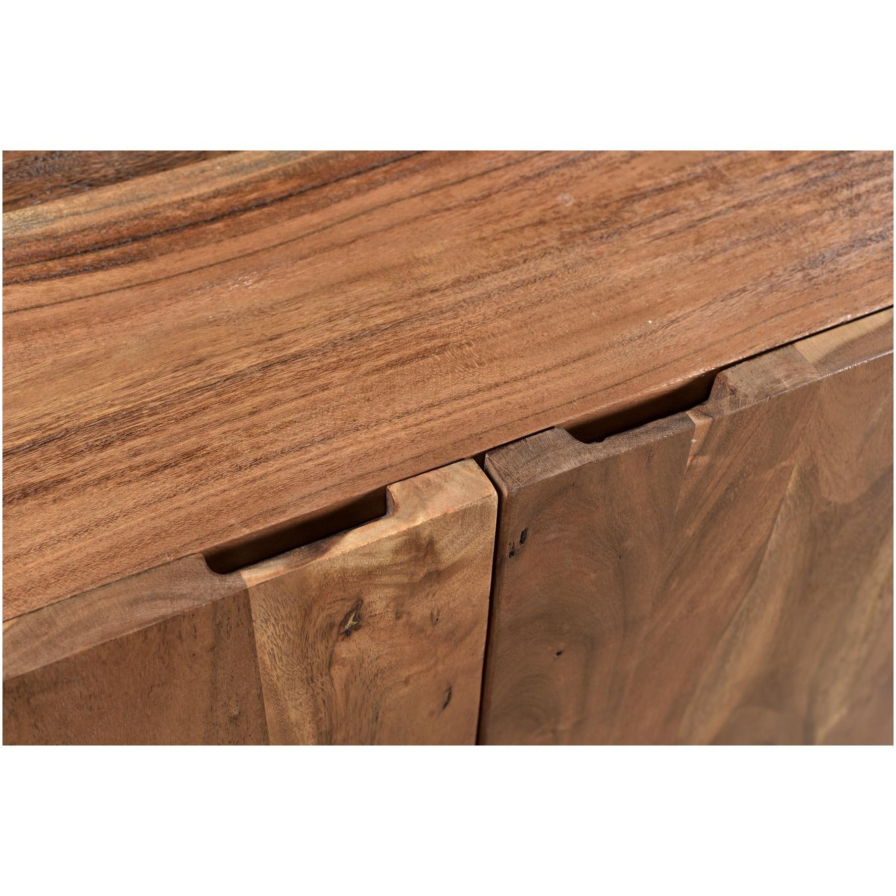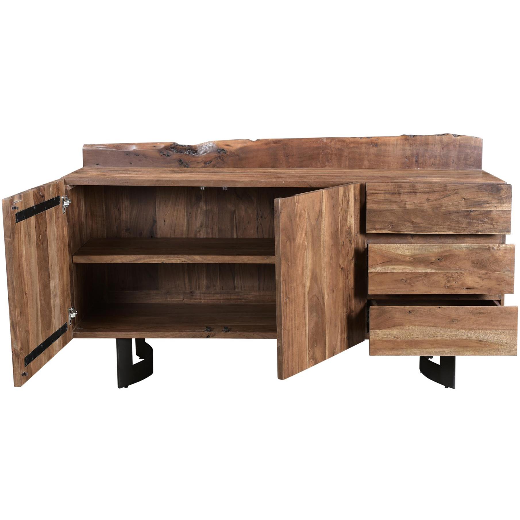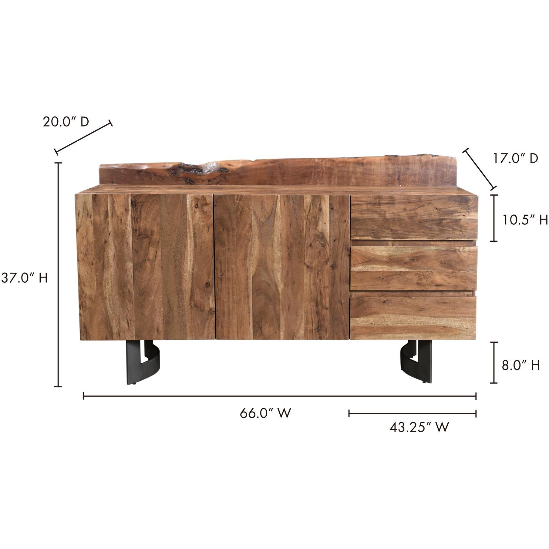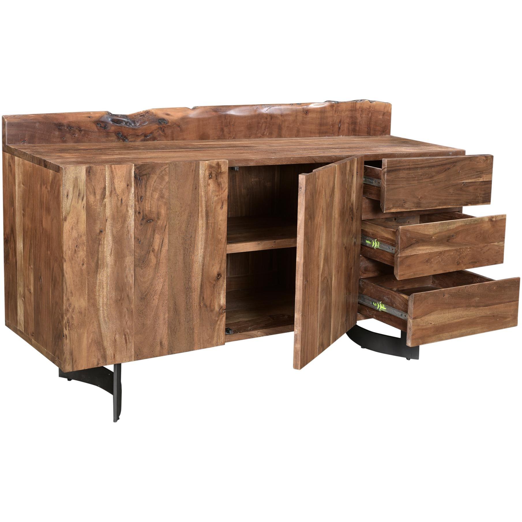 Nature did the styling here. Bent turns solid acacia into storage that doesn’t hide its character, thanks to a live-edge look that spotlights knots, whorls, and grain. The iron base adds a clean industrial counterpoint, keeping the piece feeling open instead of bulky. Behind two doors and in side-mounted drawers, there’s plenty of room for dining essentials, bar gear, or everyday clutter. Use it as a buffet, console, or storage cabinet, then pair with the rest of Bent for a cohesive feel.