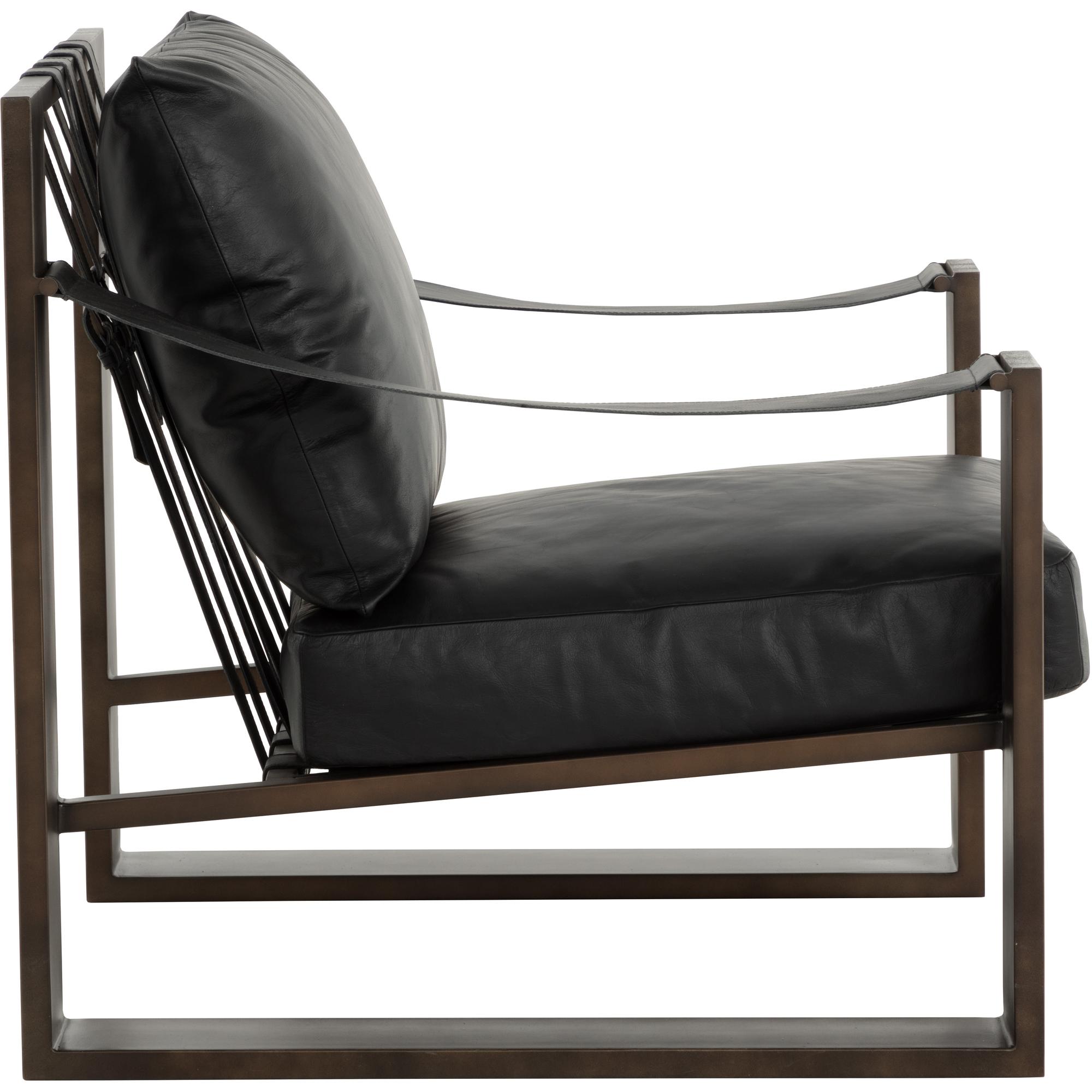 The Berke Lounge Chair brings an impressive modern look. Soft cushions are upholstered in buttery charcoal black leather with matching leather strap detailing. A strong iron frame lends this lounge chair a bold, geometric design.
