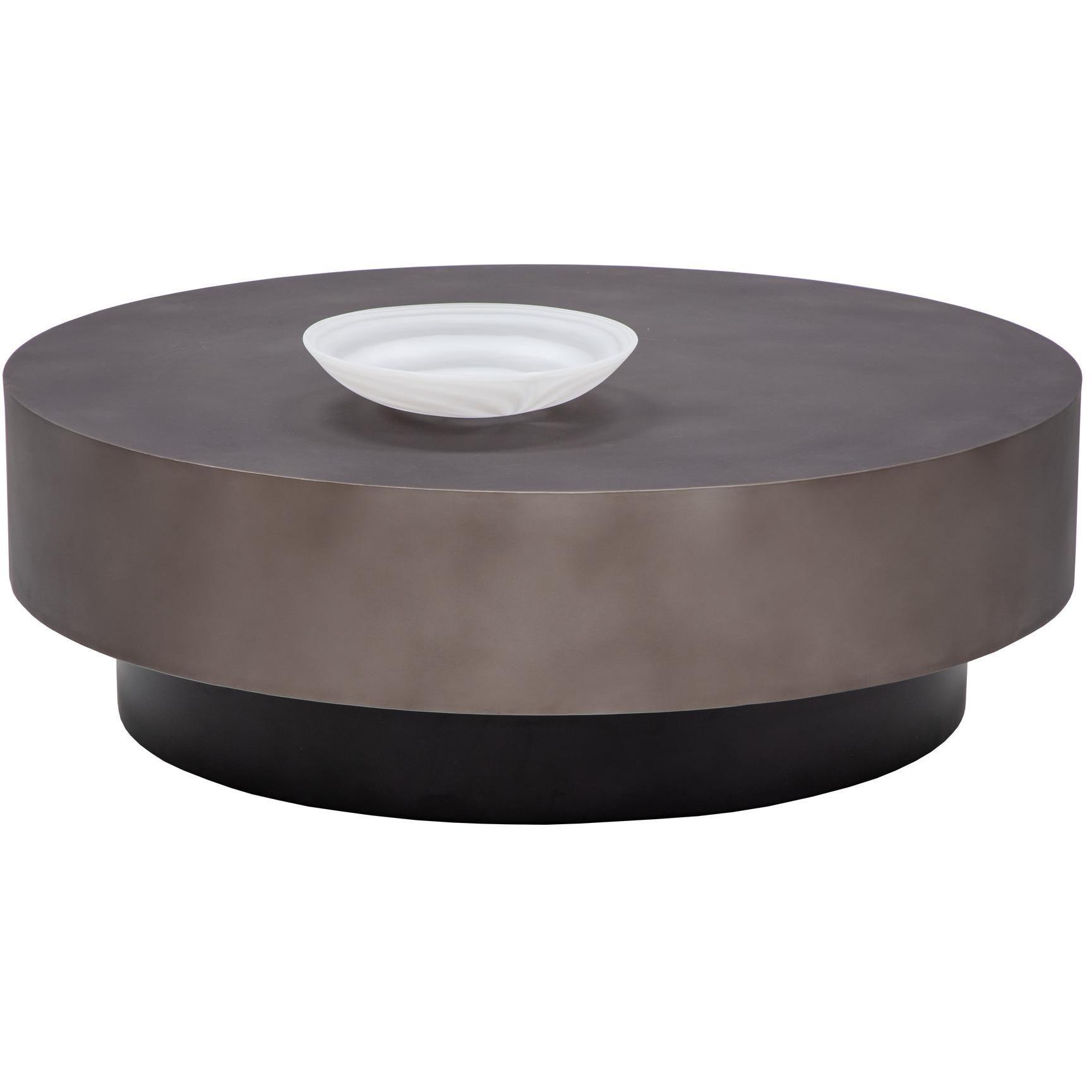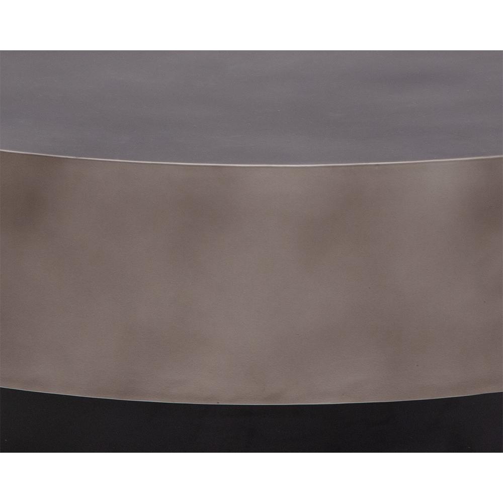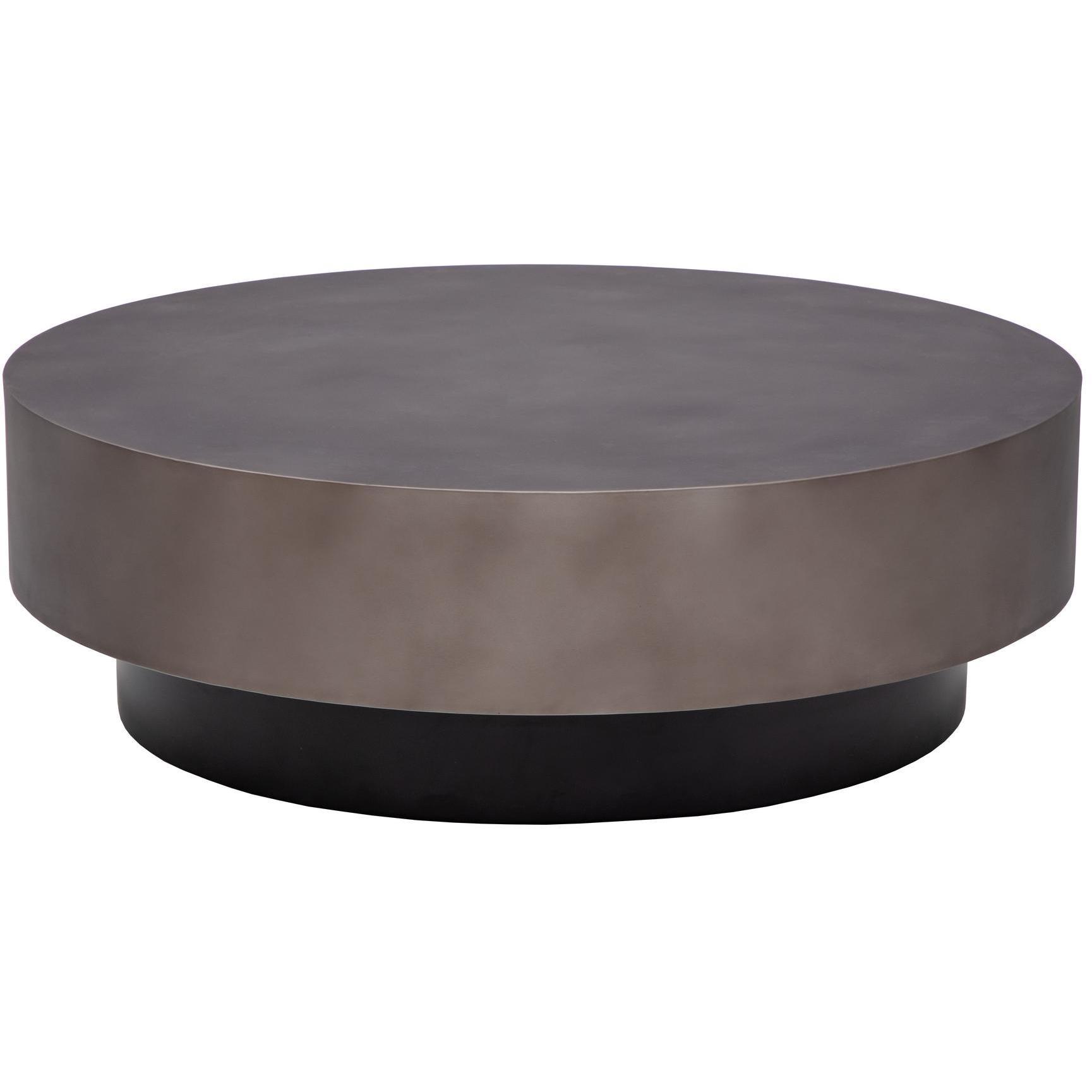 A stunning round coffee table crafted in India exudes contemporary elegance. Features a metal top with a hand-painted gunmetal finish supported by a black base. Suitable for residential and commercial living and lounge environments. Coordinating end table also available. Made in India. With refined craftsmanship, this design was brought to life by skilled local artisans. By nature, these materials develop unique imperfections such as fissures, markings and colour variations for a truly one-of-a-kind piece.