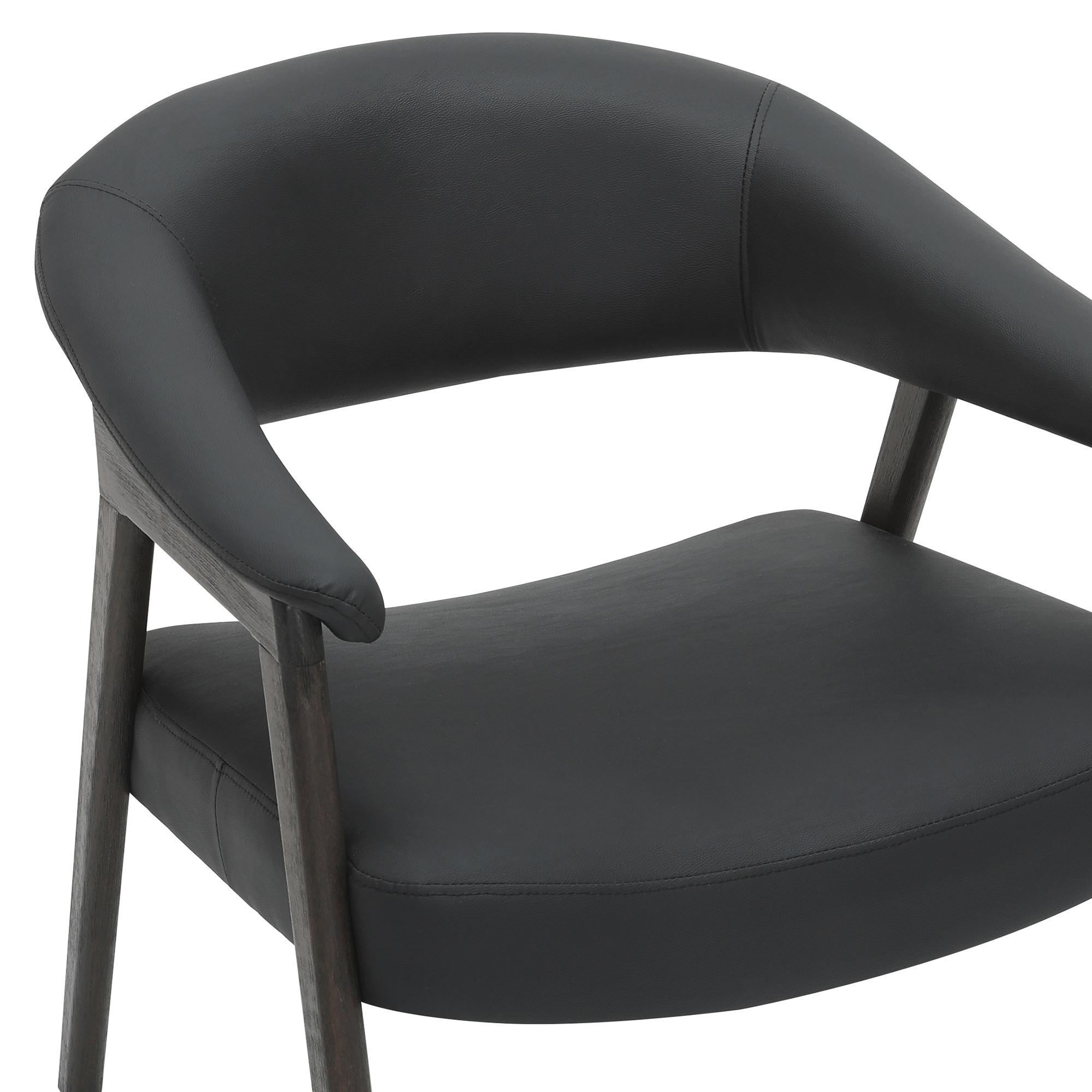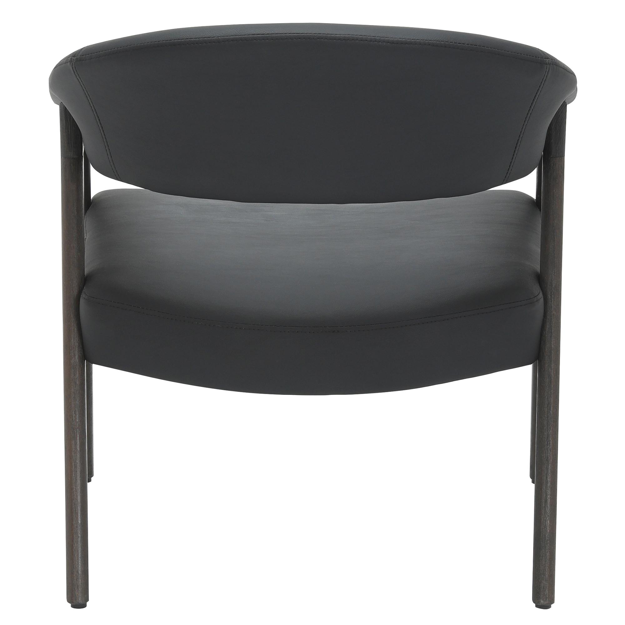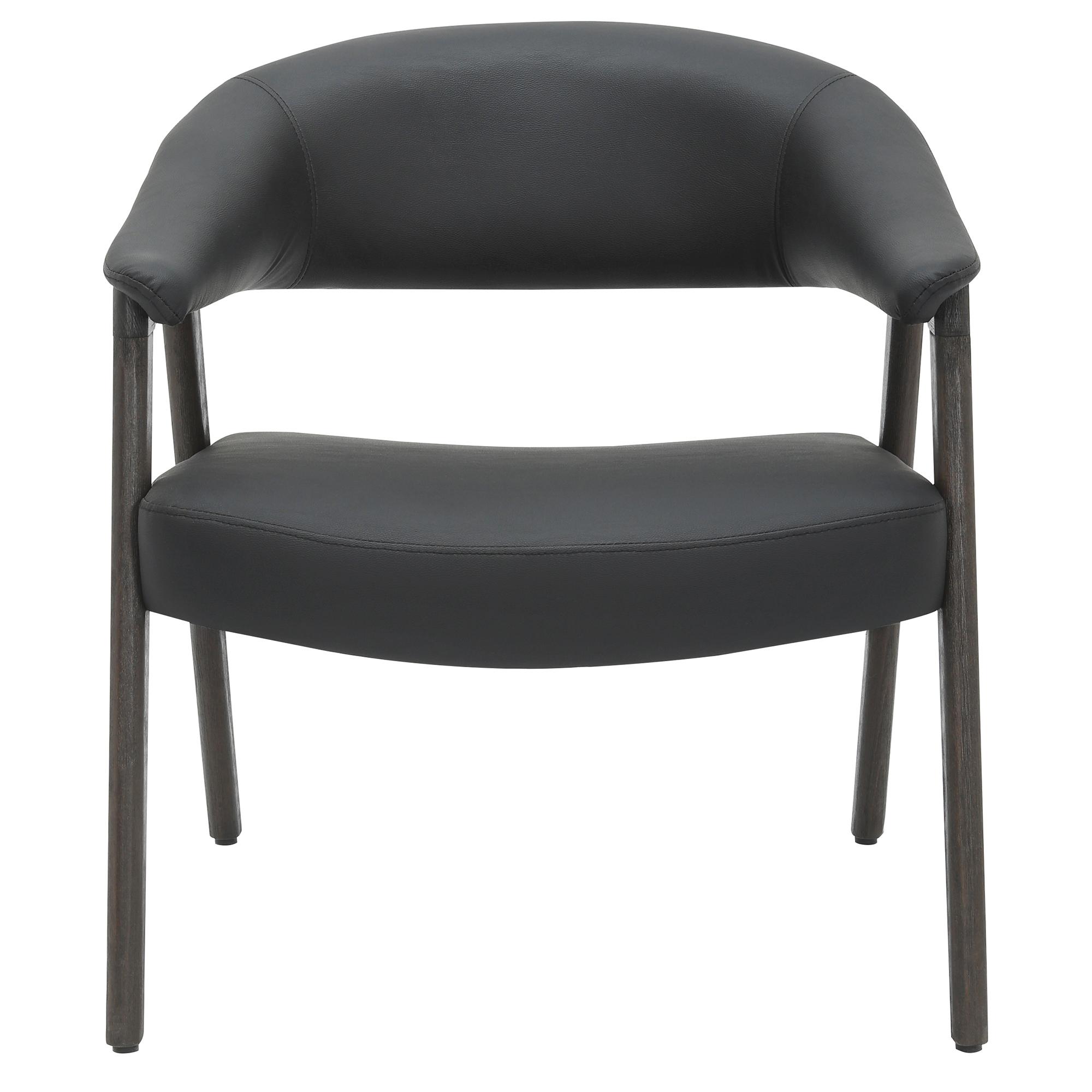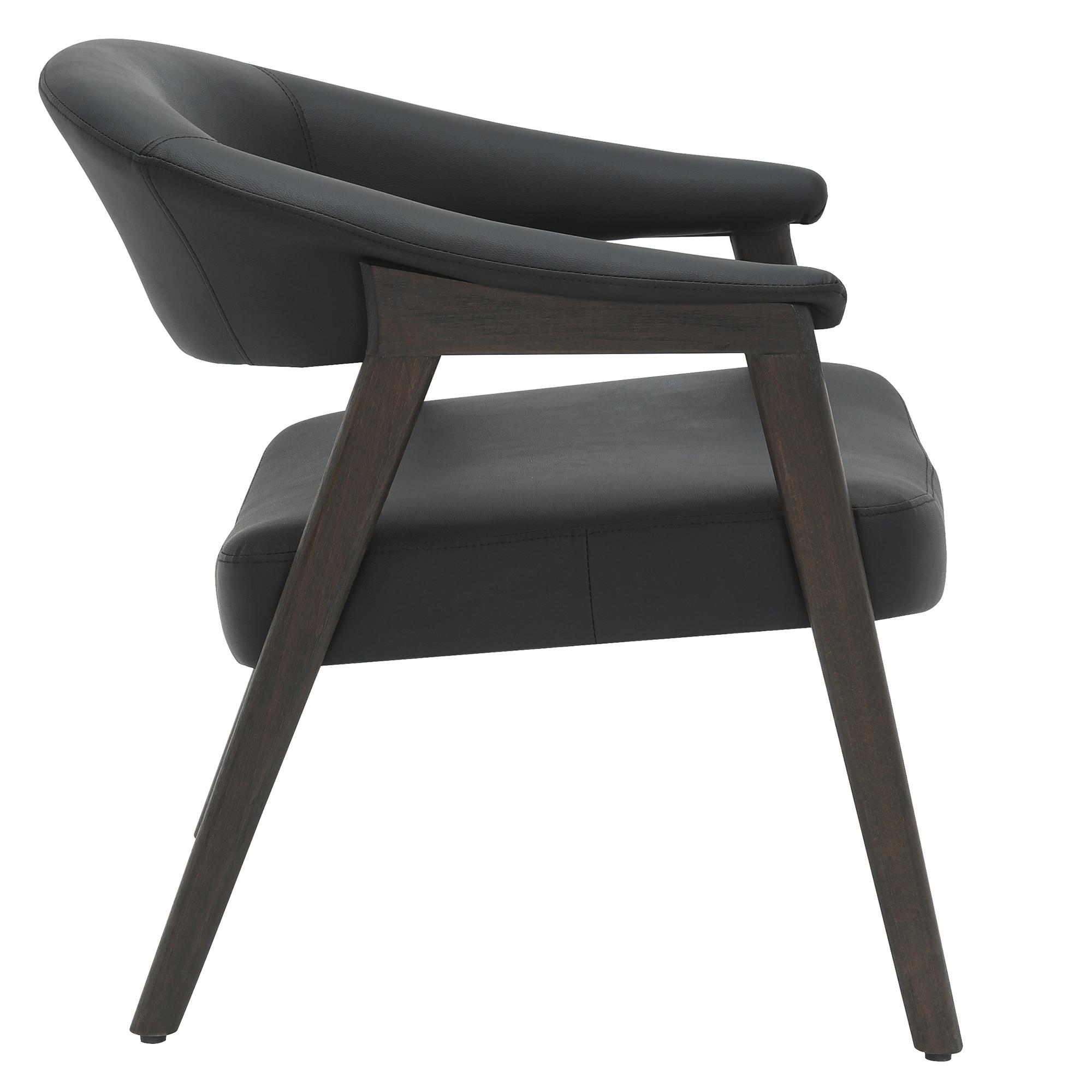 The rich combination of black faux leather and brushed dark walnut frame is irresistible on this armchair. Sturdy, curved back and seat with foam, web and springs means this chair is built for those long, comfortable conversations with friends, or afternoons reading. Use in a formal living space or a comfortable corner chair in the bedroom.