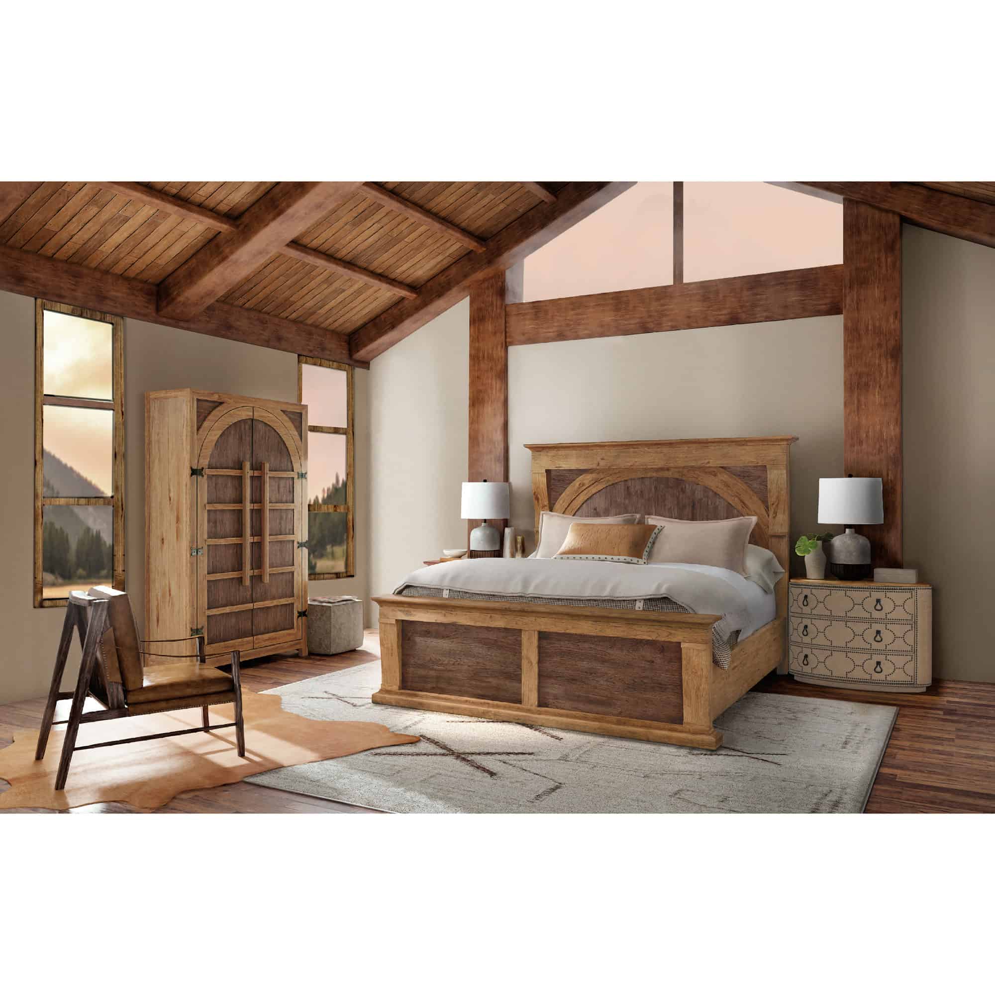 Finish: Vintage Natural: a warm, rustic, organic finish over hickory veneers. Distressing includes chopping, rock, drawknife, gauging, chain distressing and wire brush.