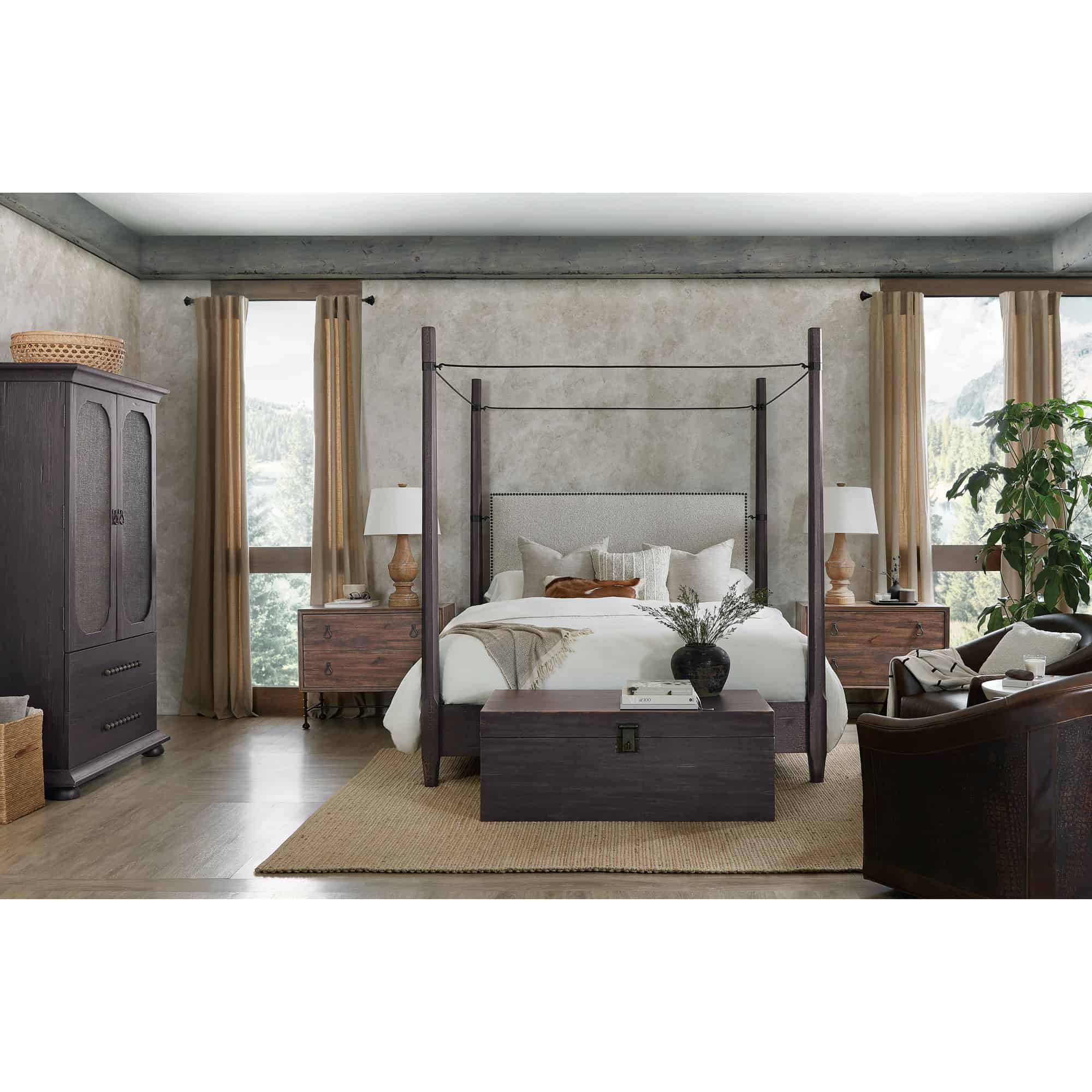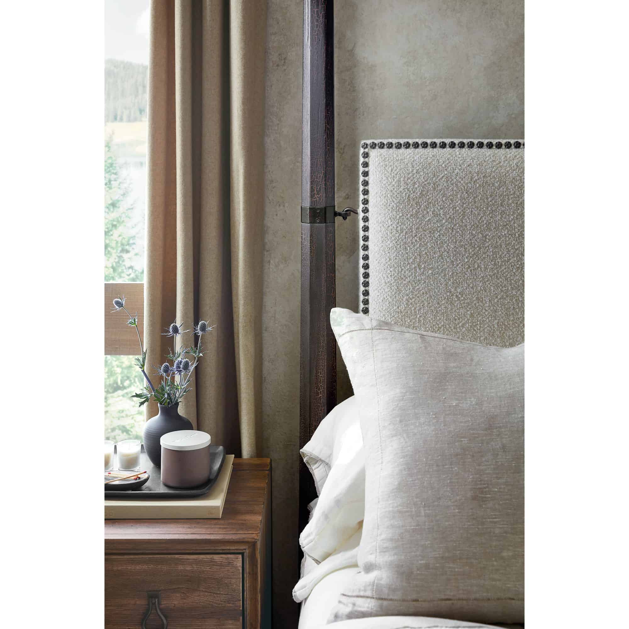 Finish: Charred Timber: inspired by the restorative beauty of a fire-ravaged forest. Distressing includes worm holes, rasping, gauging, plane shock, hand plane, drawknife, wire brush and screw head. Dark brushed bronze metal canopy.