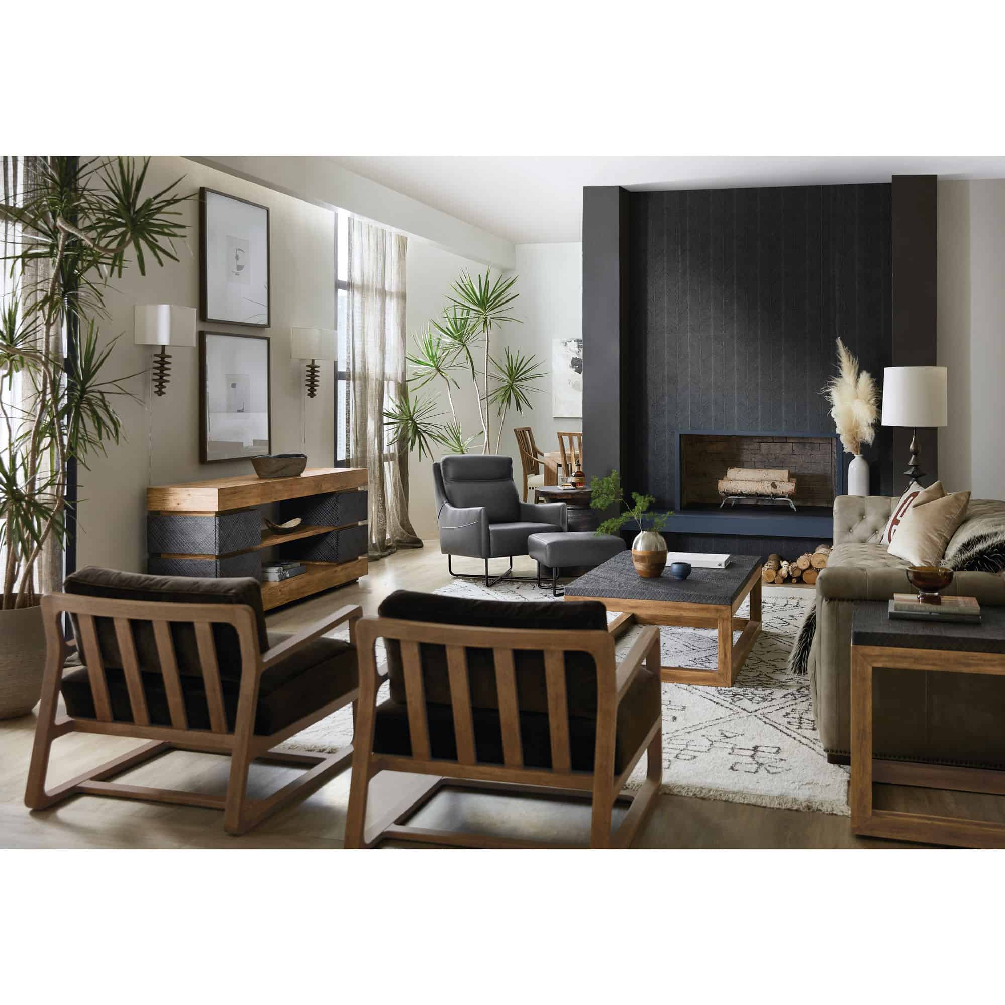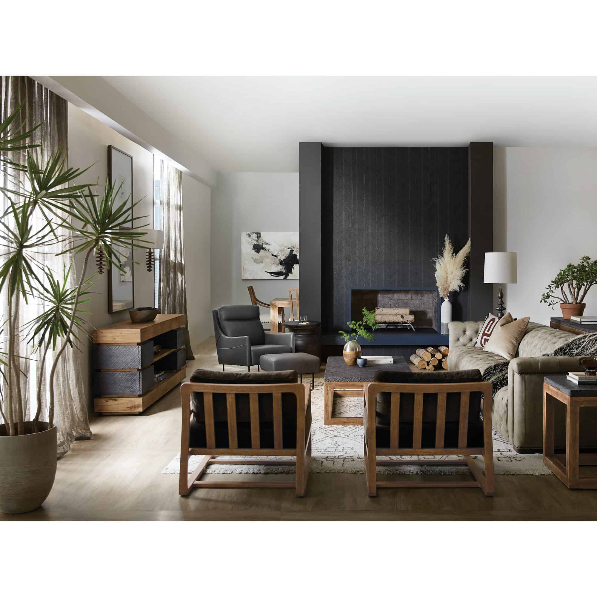 Finish: Vintage Natural base: a warm, rustic, organic finish over hickory veneers. Furrowed Bark top: a charcoal finish with a crosshatch texture. Distressing includes chopping, rock, drawknife, gauging, chain distressing and wire brush.
