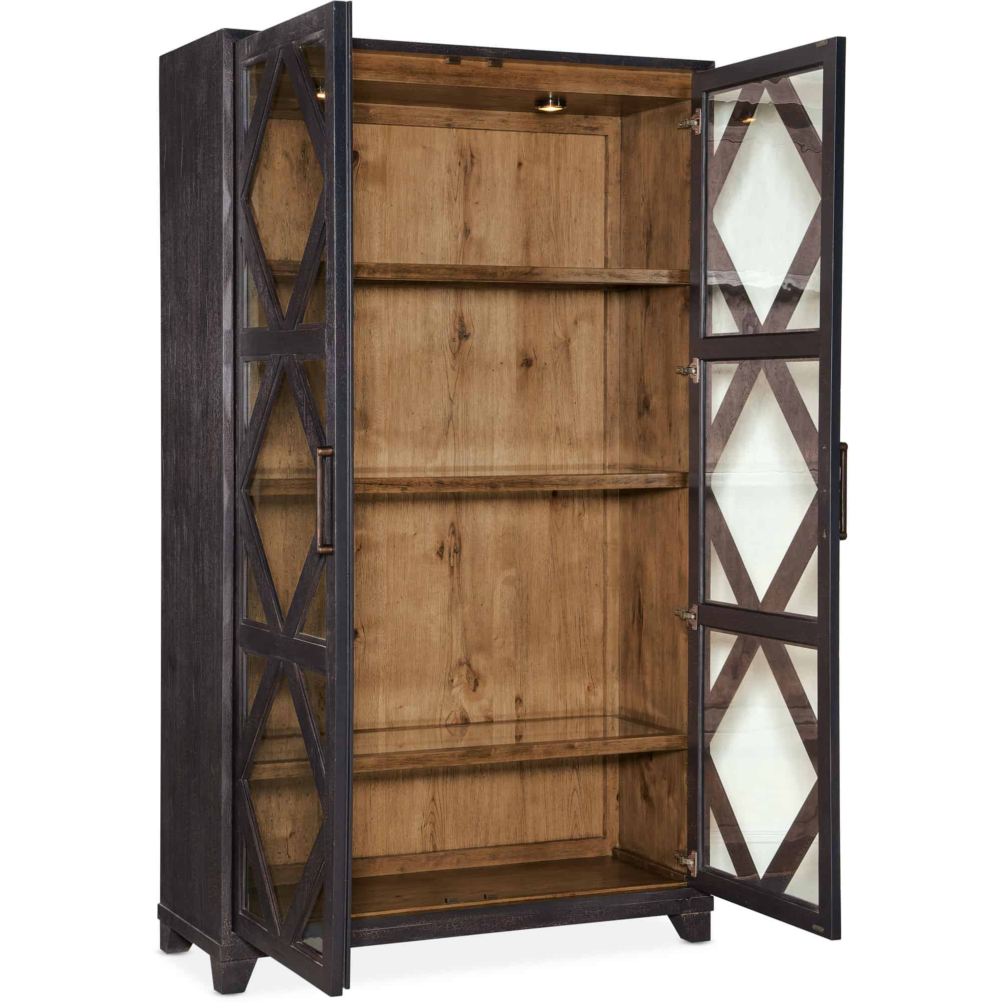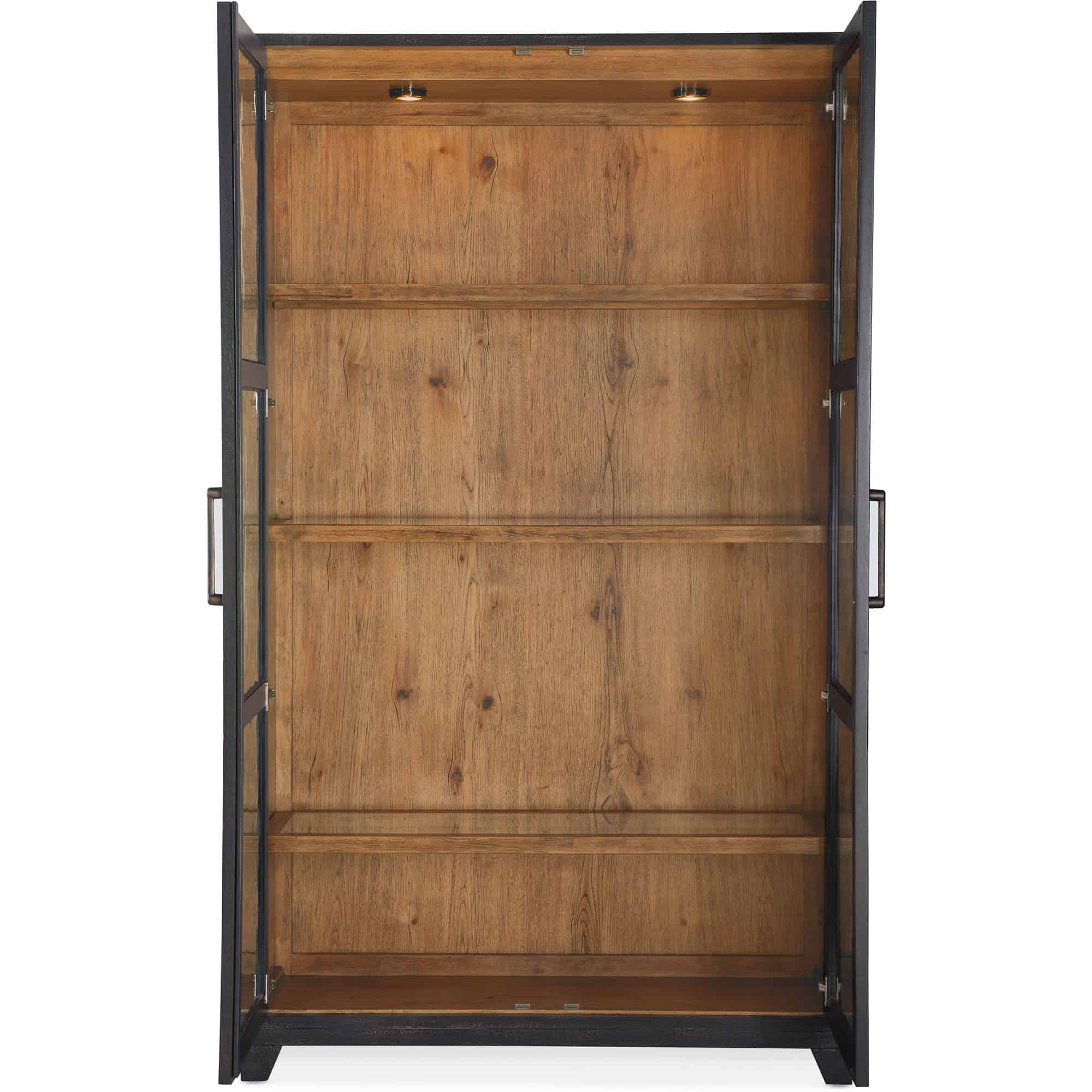 Finish: Charred Timber on exterior: inspired by the restorative beauty of a fire-ravaged forest. Distressing includes worm holes, rasping, gauging, plane shock, hand plane, drawknife, wire brush and screw head. Vintage Natural on interior: a warm, rustic, organic finish over hickory veneers. Distressing includes chopping, rock, drawknife, gauging, chain distressing and wire brush. Dark brushed bronze bar pulls.