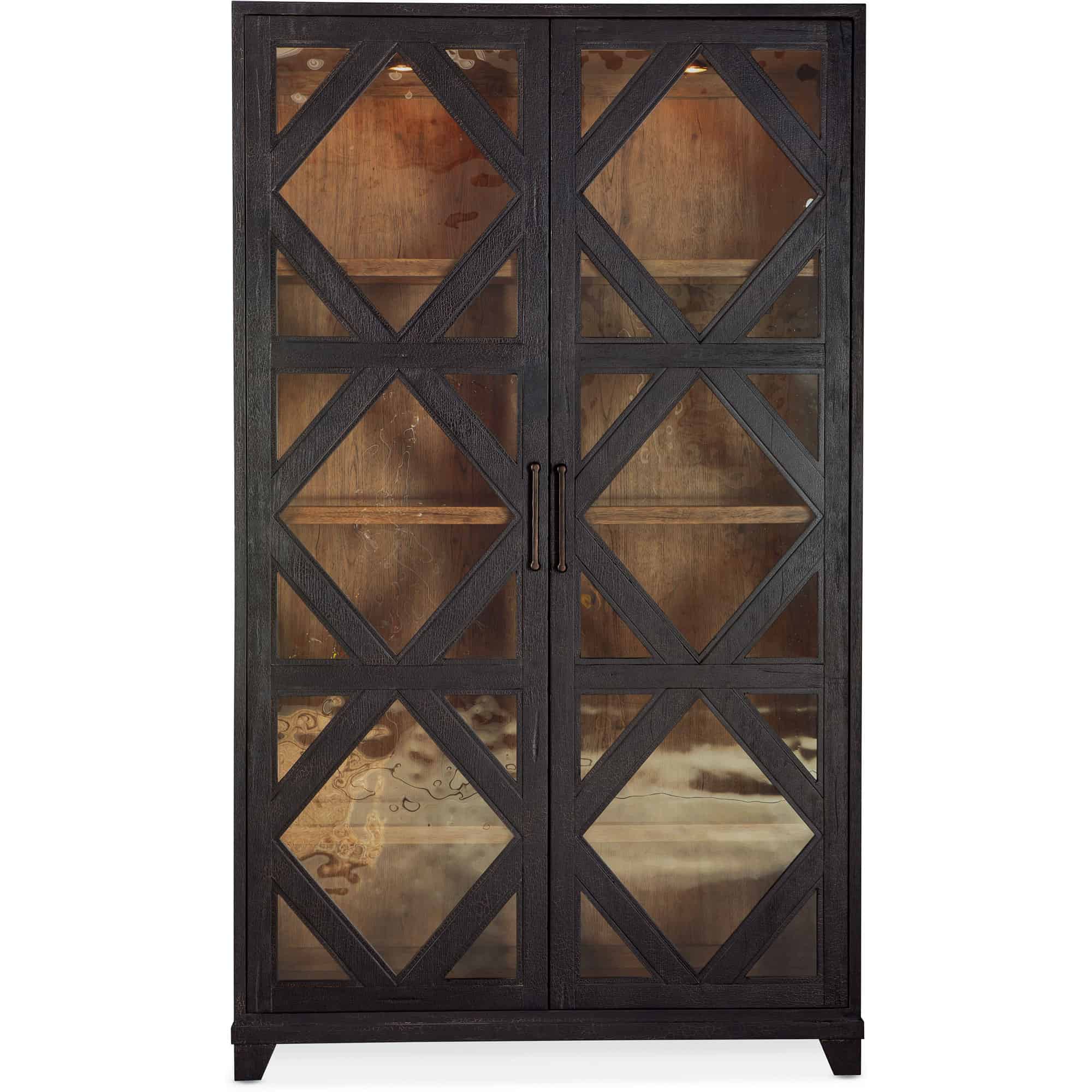 Features: Two doors with lightly seeded antique glass and decorative overlay