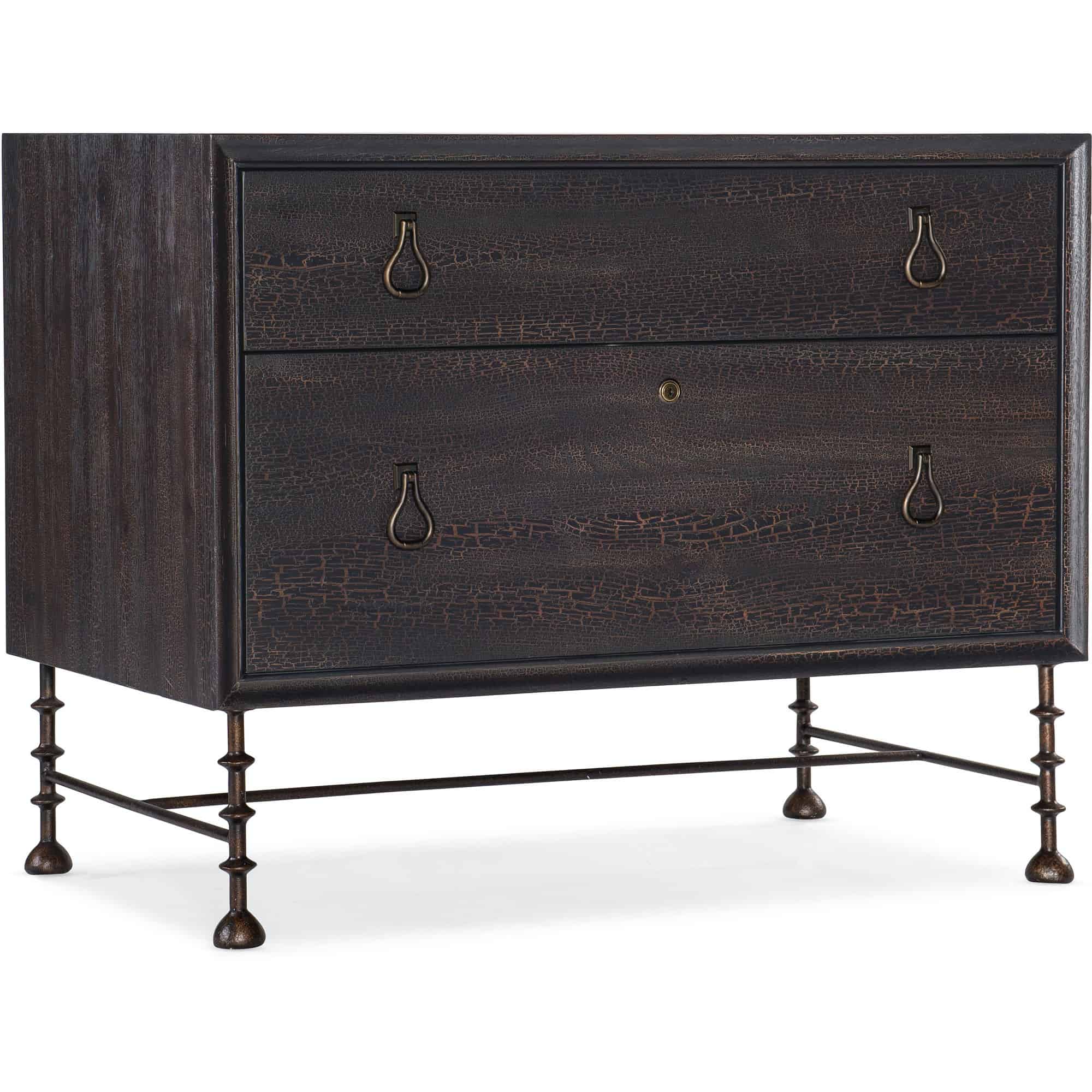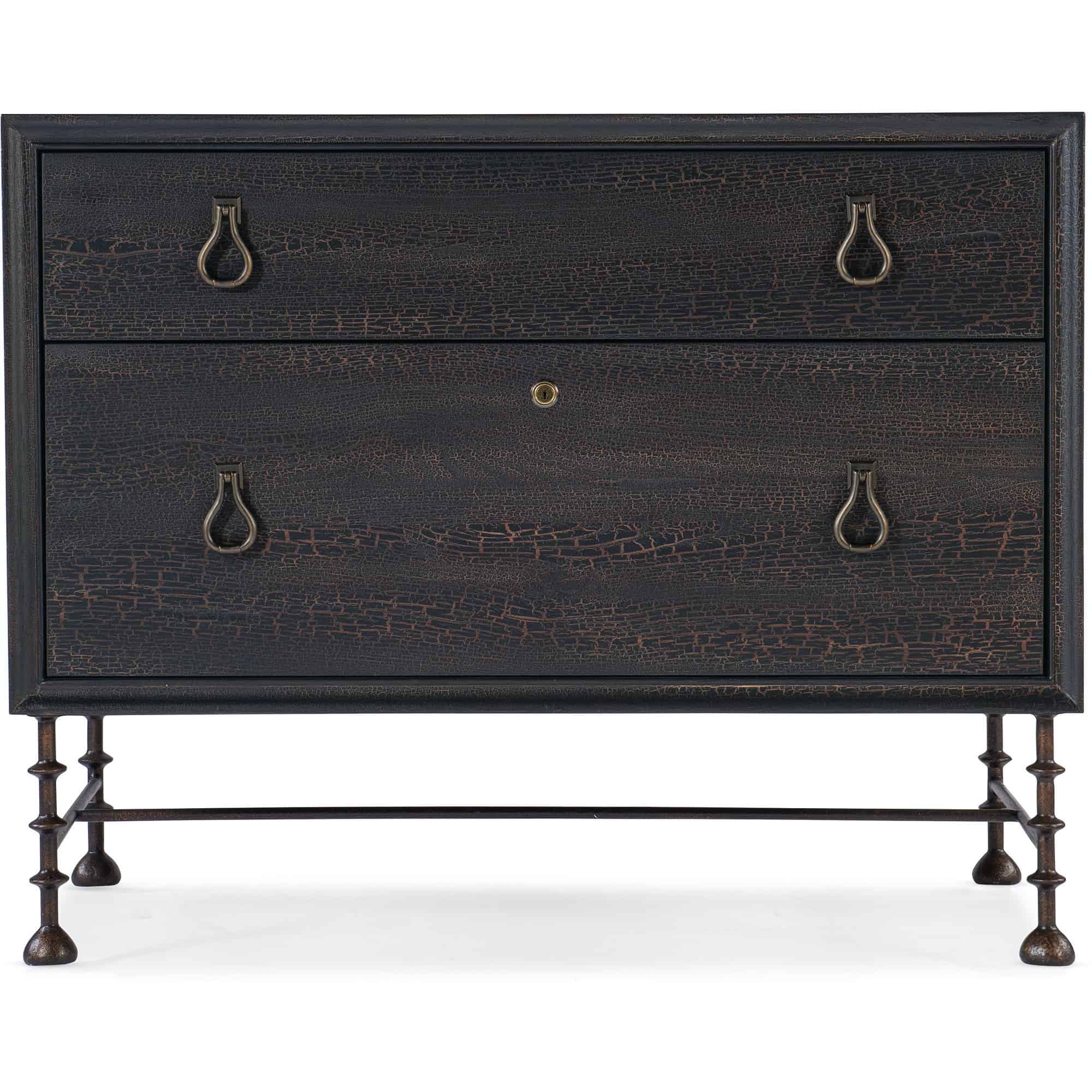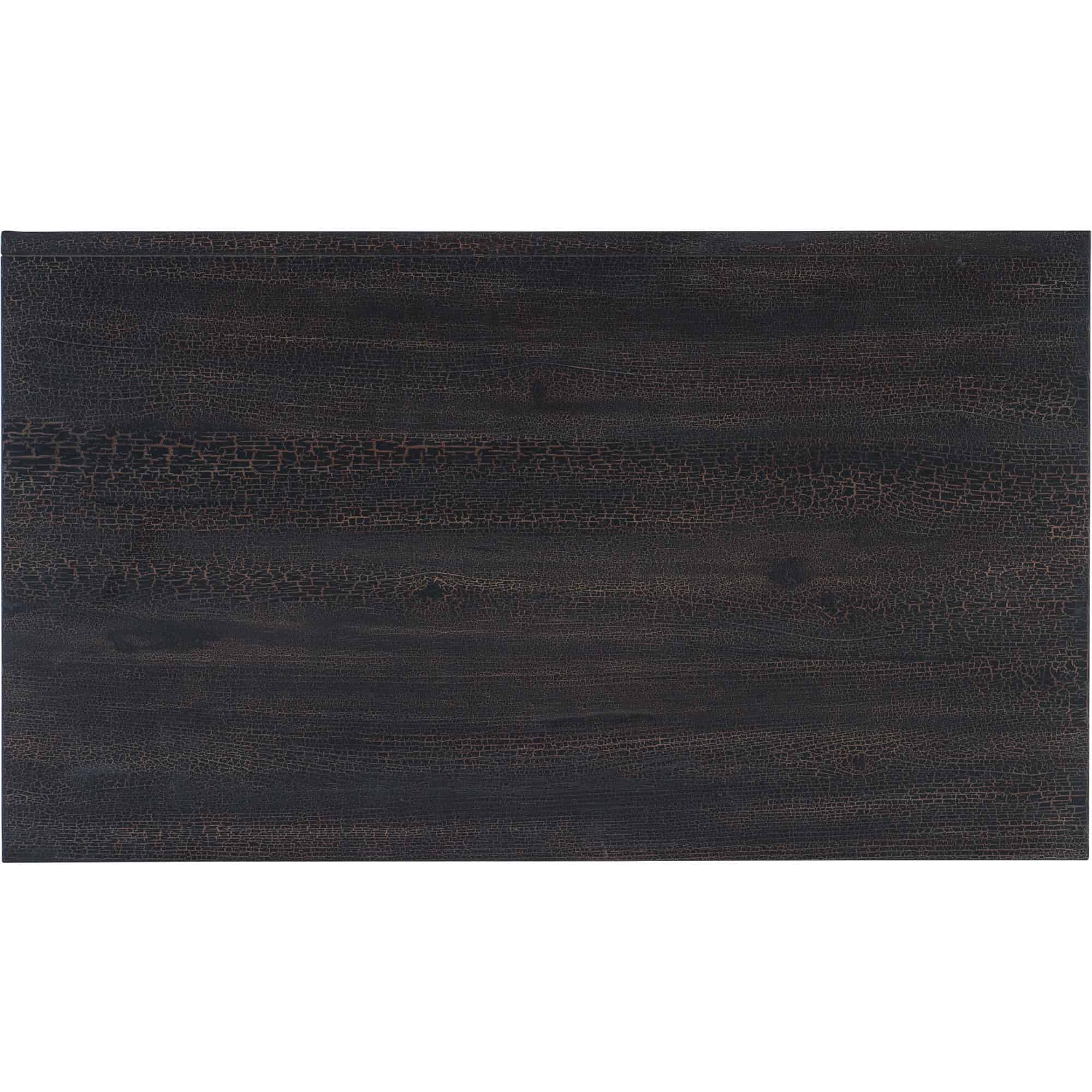 Finish: Charred Timber: inspired by the restorative beauty of a fire-ravaged forest. Distressing includes worm holes, rasping, gauging, plane shock, hand plane, drawknife, wire brush and screw head. Dark brushed bronze metal legs and bail pulls.