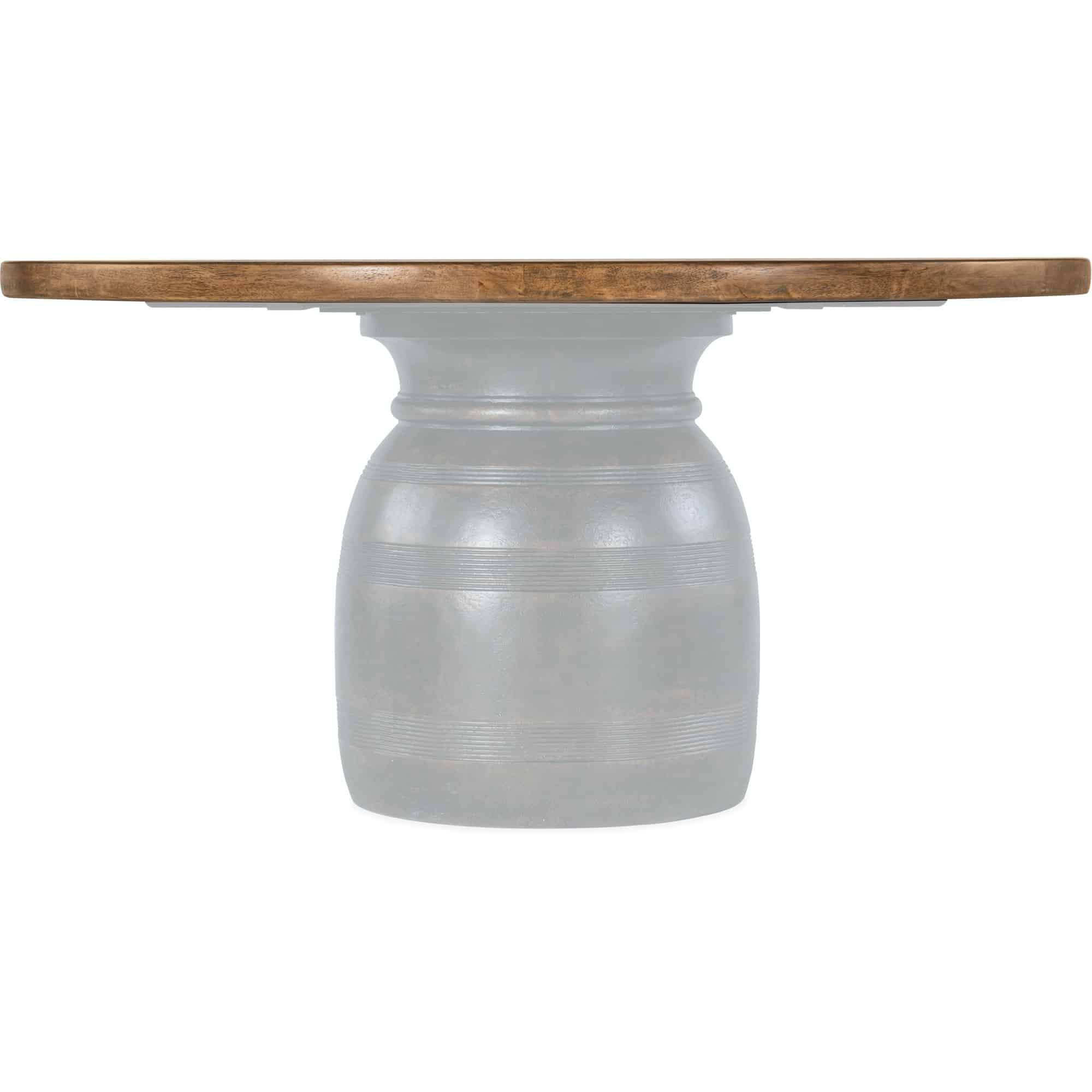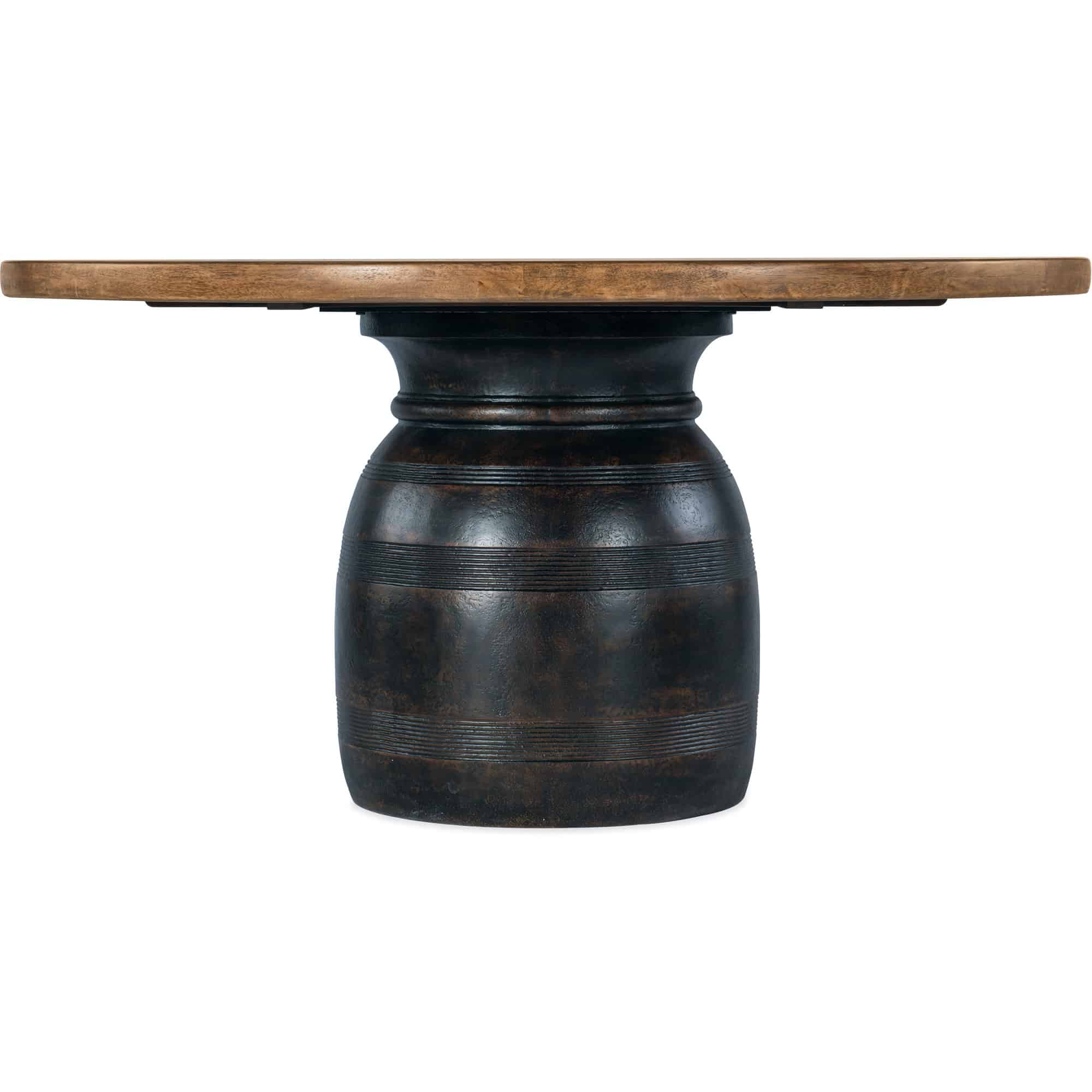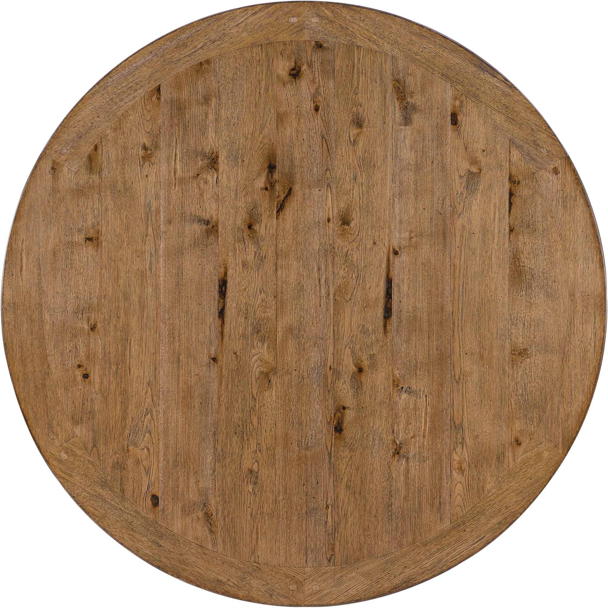 Finish: Vintage Natural top: a warm, rustic, organic finish over hickory veneers. Distressing includes chopping, rock, drawknife, gauging, chain distressing and wire brush. Charred Timber base: inspired by the restorative beauty of a fire-ravaged forest. Distressing includes worm holes, rasping, gauging, plane shock, hand plane, drawknife, wire brush and screw head.