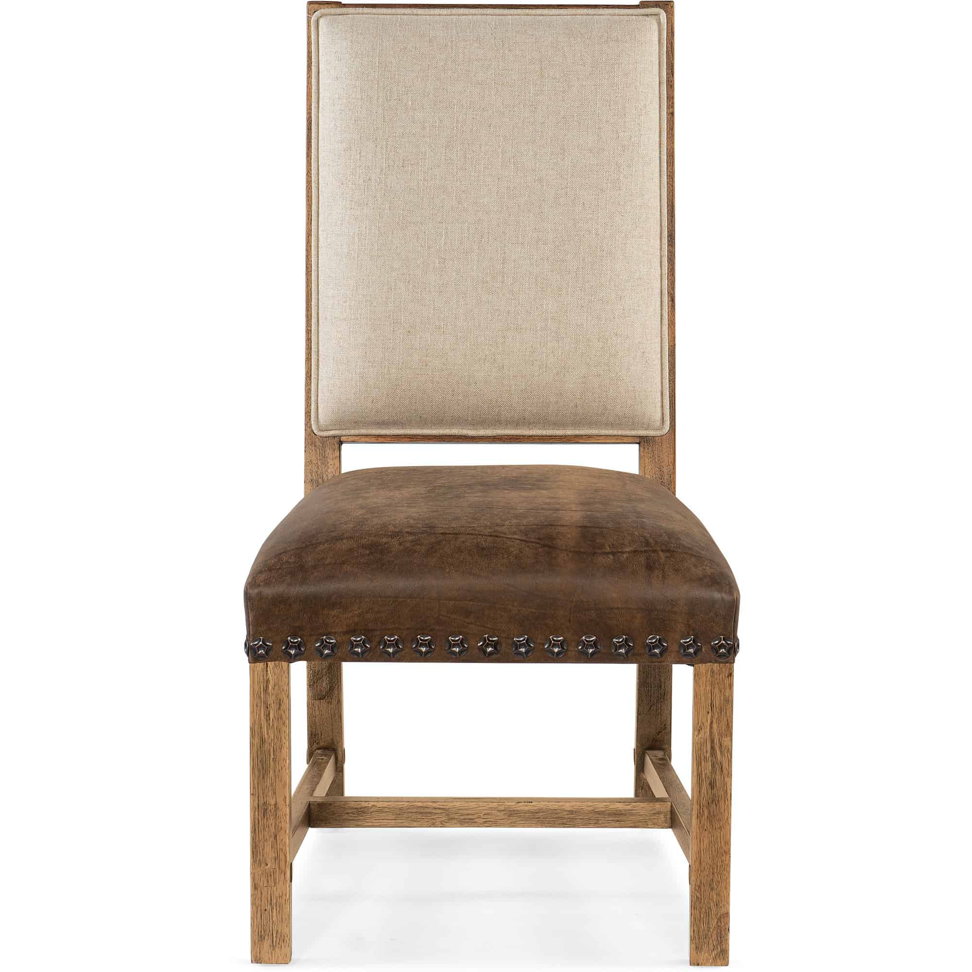 Features: Leather seat and fabric back Nailhead trim Furrowed Bark crosshatch design on back Tack in floor glide
