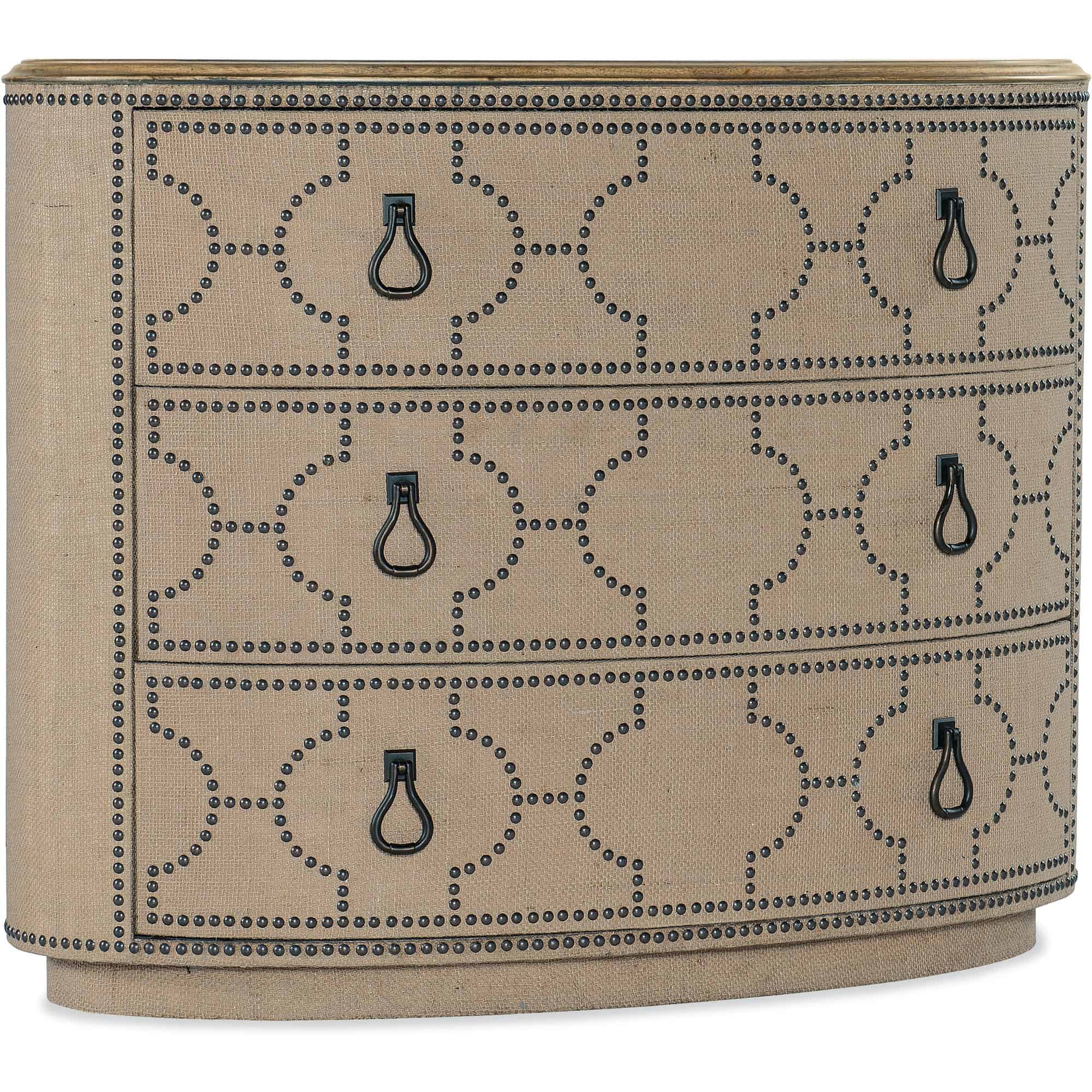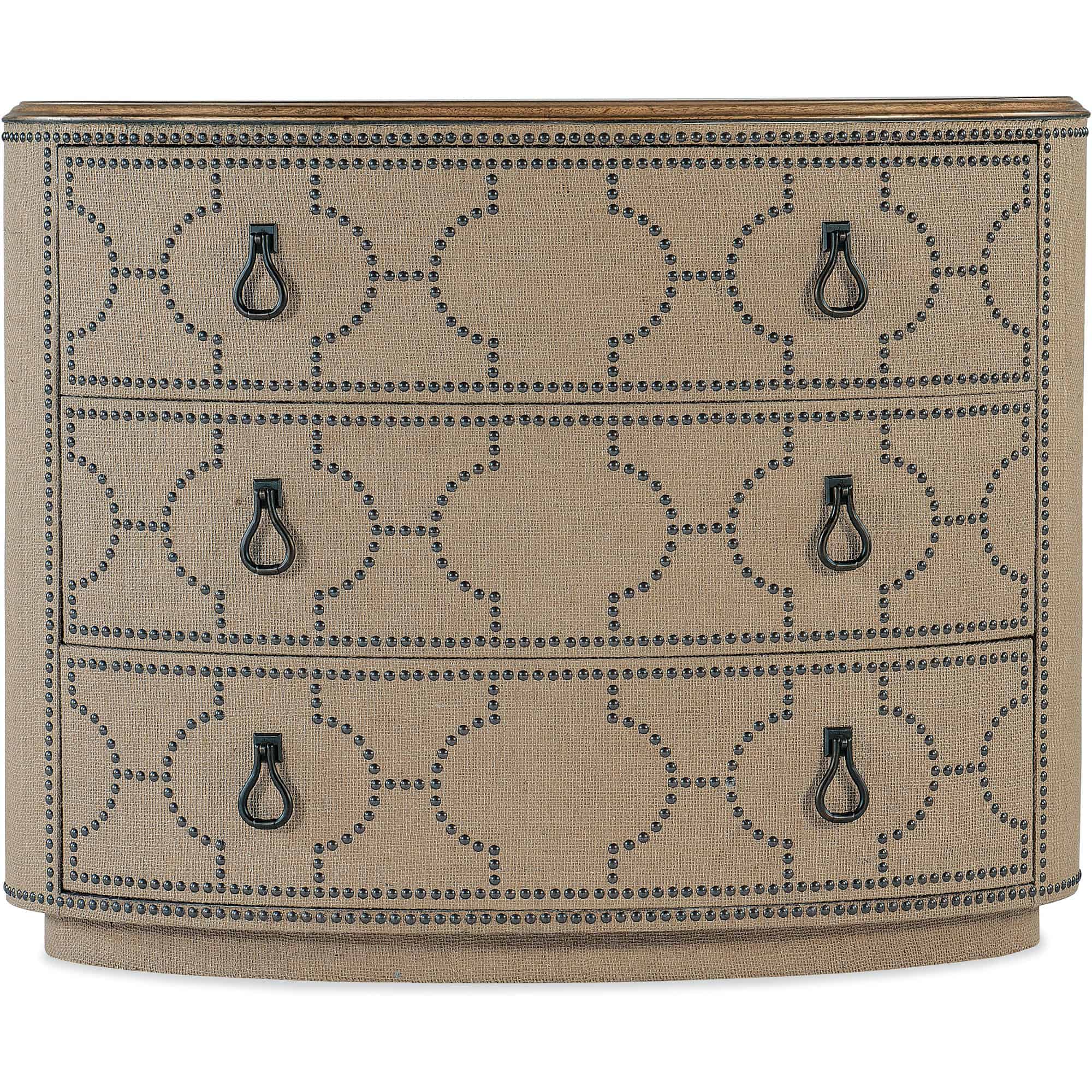 Features: Three self-closing drawers Top drawer has a removable felt liner Levelers Nailhead trim design