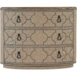 Finish: Vintage Natural: a warm, rustic, organic finish over hickory veneers. Distressing includes chopping, rock, drawknife, gauging, chain distressing and wire brush. Dark brushed bronze bail pulls. Burlap wrapped case. The burlap featured on the Big Sky Three Drawer Chest is a natural material and slight color variation from piece to piece can be expected.