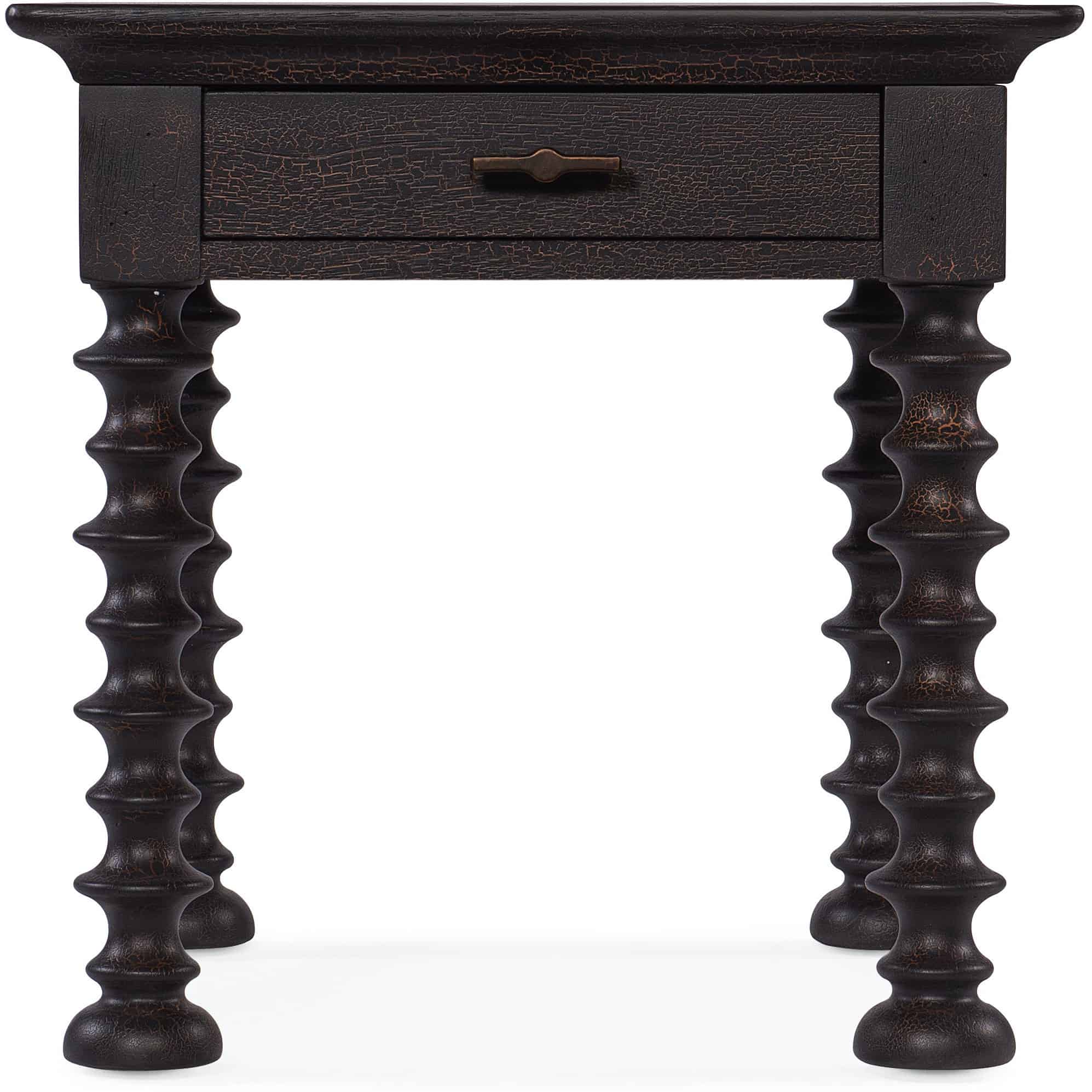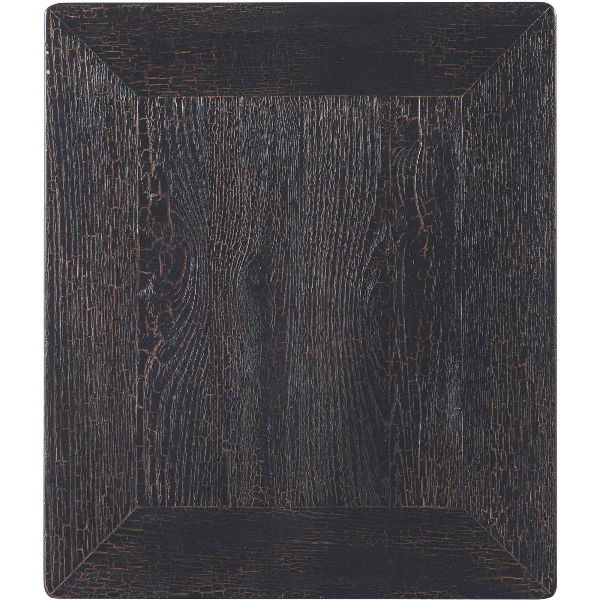 Finish: Charred Timber: inspired by the restorative beauty of a fire-ravaged forest. Distressing includes worm holes, rasping, gauging, plane shock, hand plane, drawknife, wire brush and screw head. Dark brushed bronze metal bar pull.