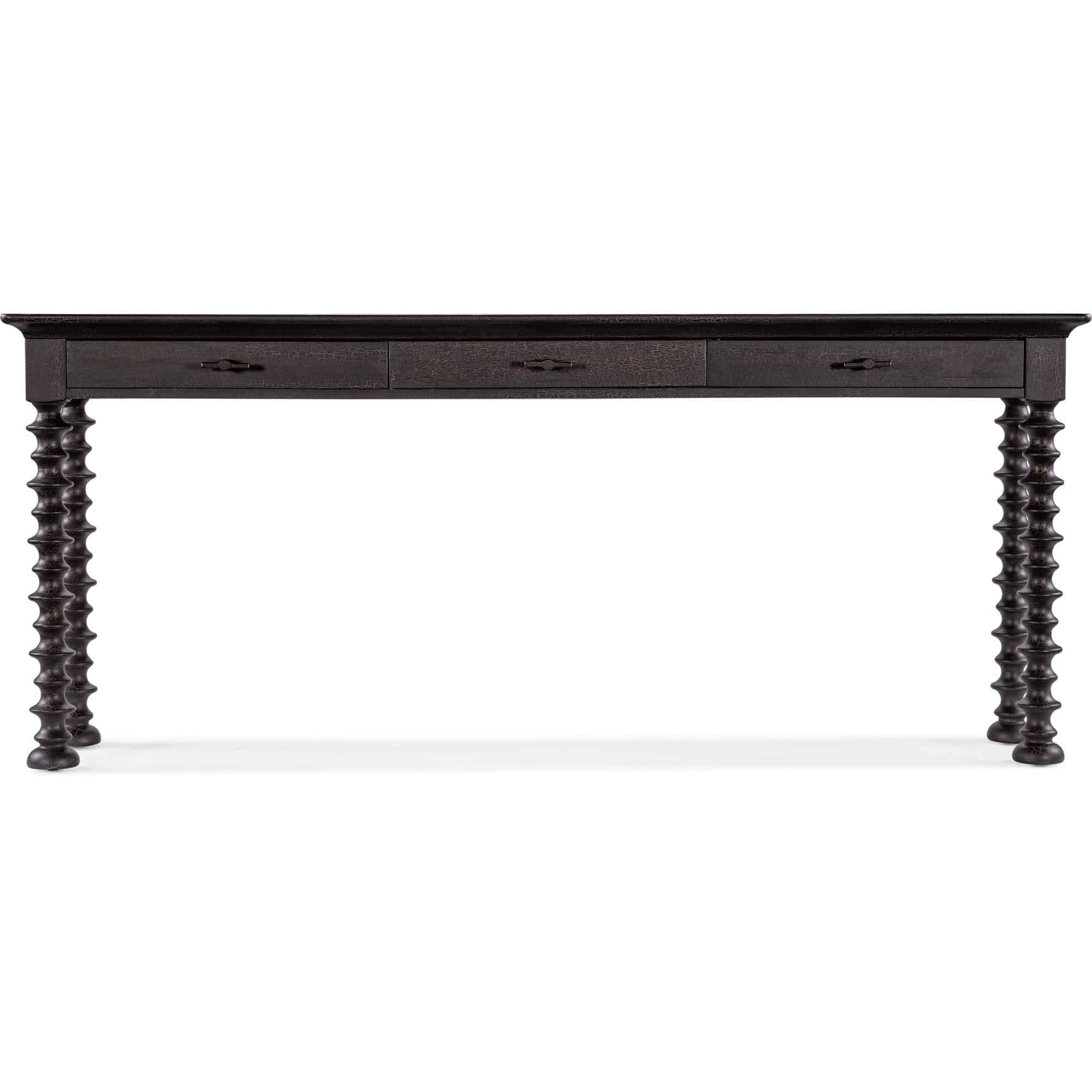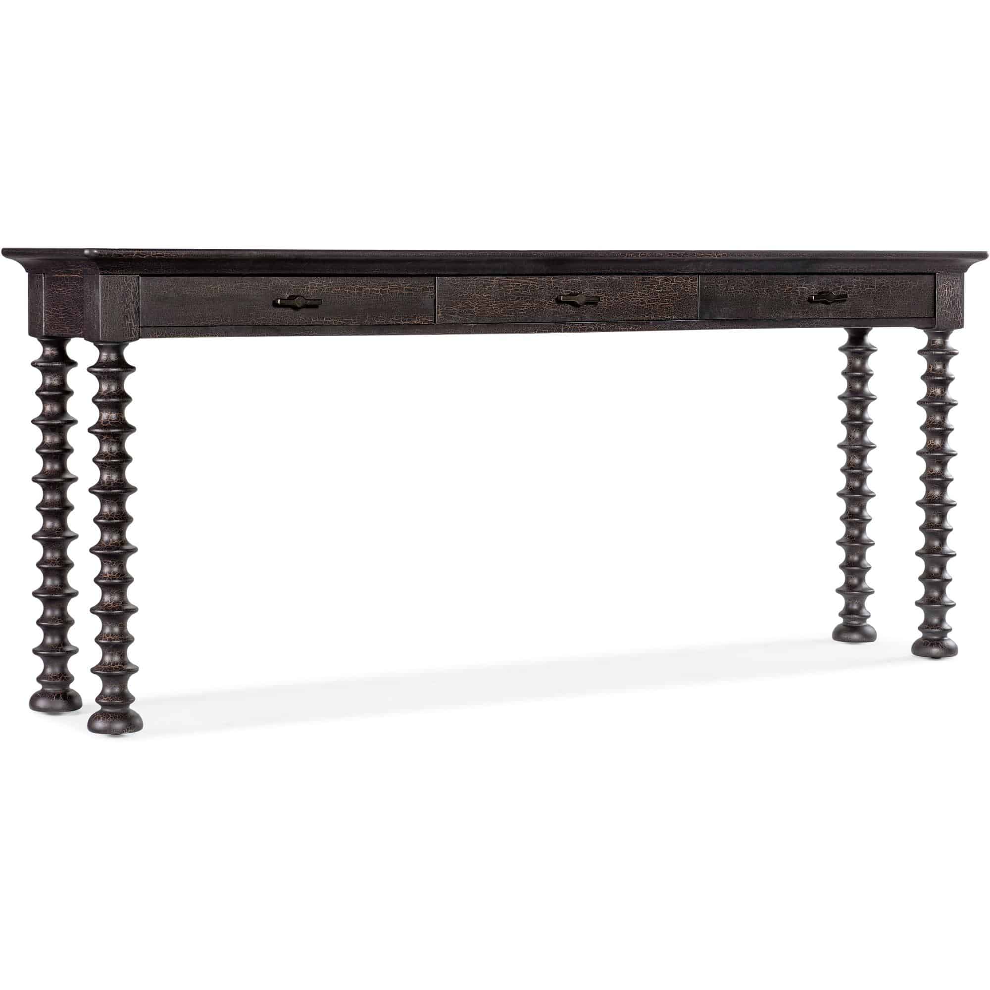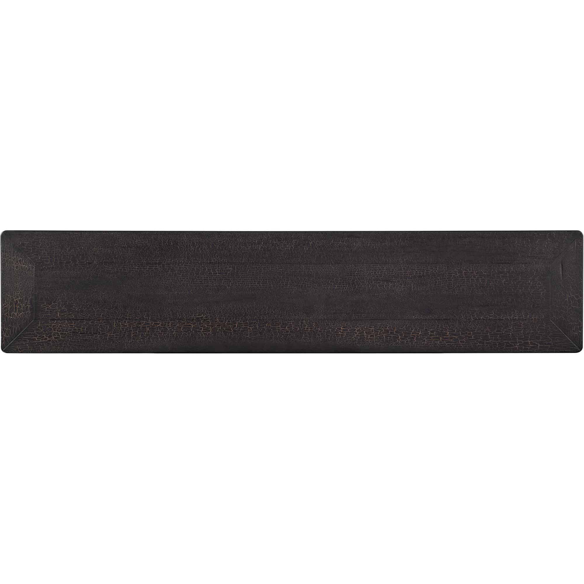 Finish: Charred Timber: inspired by the restorative beauty of a fire-ravaged forest. Distressing includes worm holes, rasping, gauging, plane shock, hand plane, drawknife, wire brush and screw head. Dark brushed bronze metal bar pull.