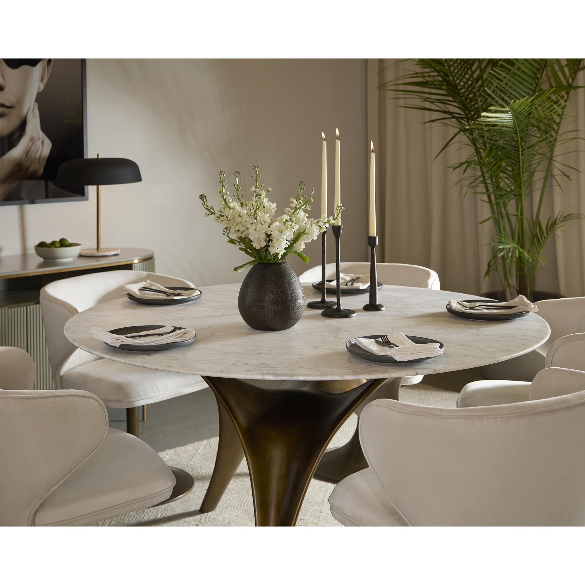 Make a statement with the Bijon Dining Table. Distinguished by its strong sculptural base made from a polyurethane mould with steel and wood in a powder-coated finish. A matte white Carrara marble top adds a sense of intrigue to tie the piece together. As marble is a natural material, unique veining, pitting, fissures, micro-cracks and colour variations are all characteristics that add to the uniqueness and beauty of each piece.