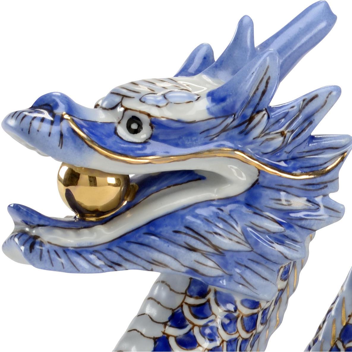 Blue and off white porcelain dragon with metallic gold details, hand painted.