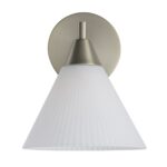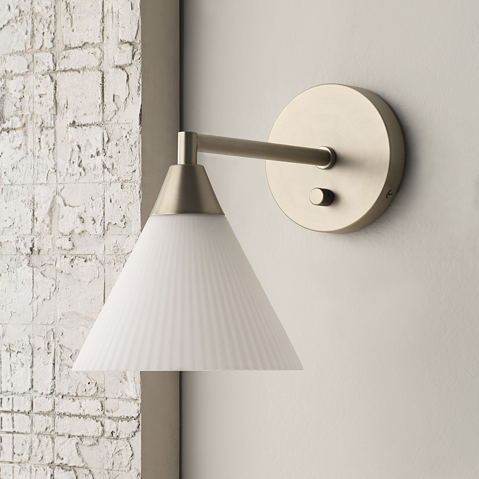 Combining the best of classic and modern design, the Bocca 1-light sconce delivers something special to any room. Crafted using high-quality materials, it features an on-trend yet timeless champagne plated finish for a dash of warmth and luxury. A cone-shaped fluted glass shade diffuses ambient light in any space it graces. Perfect for flanking a bed, lighting up a reading corner, shedding a warm glow in a dining room or anywhere else that could use a little illumination and charm, this light wall sconce is hardwired so no unsightly cords get in the way of its great looks. Light up your life the minute it’s installed thanks to an included bulb and dimmer switch that lets you to customize the light level to suit your needs and mood.
