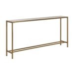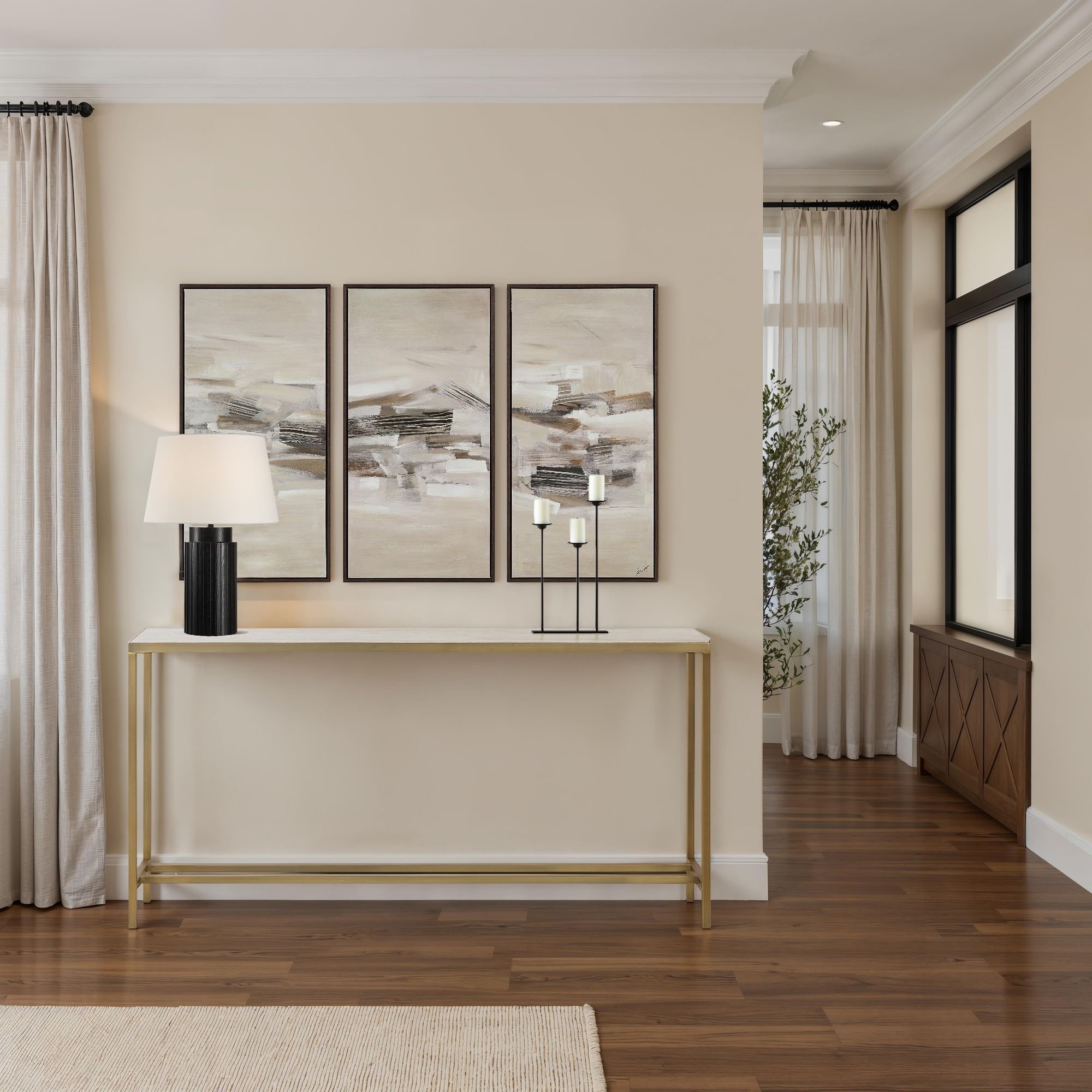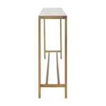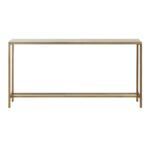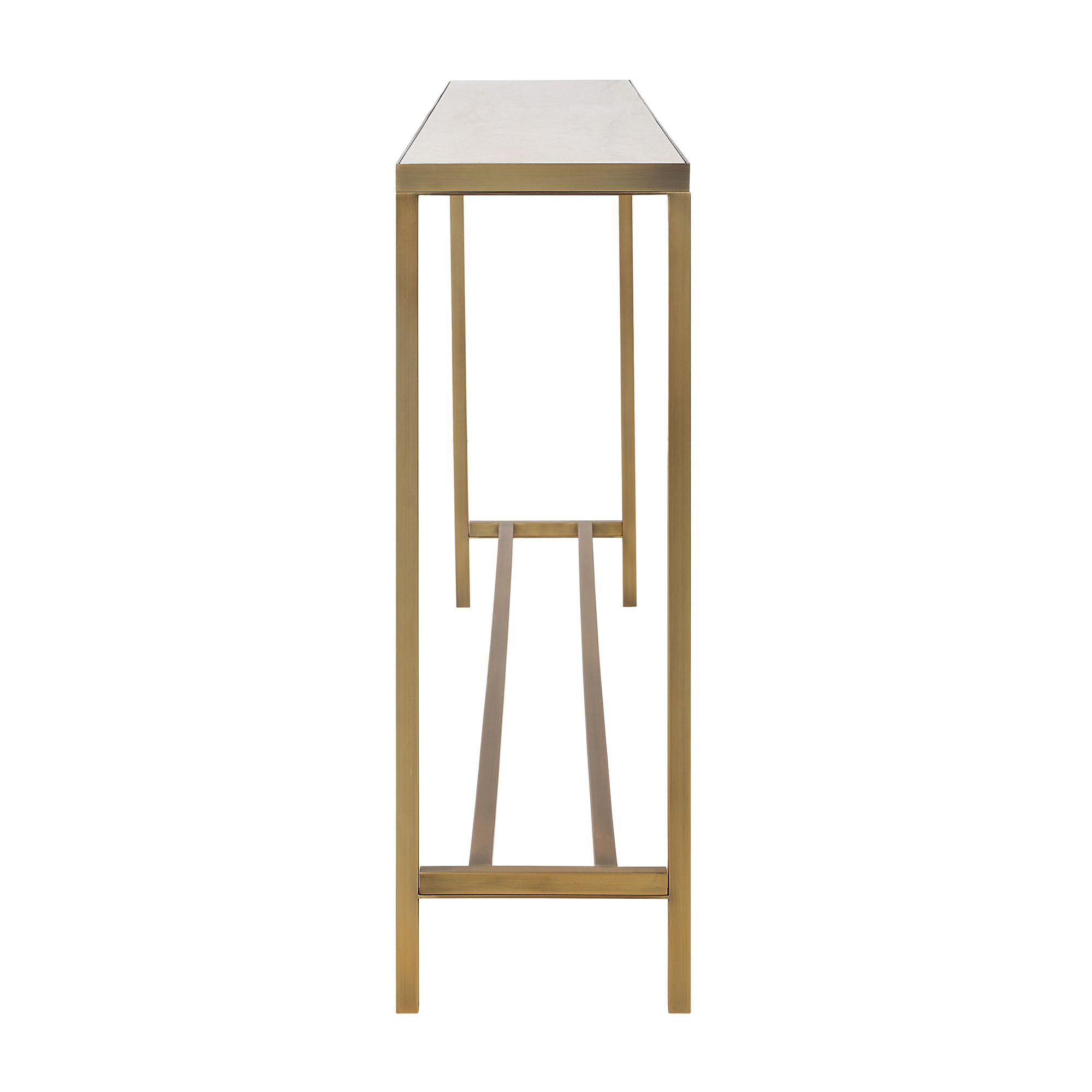 Made of travertine and antique brushed brass-plated iron, this luxurious accent console table will elevate any home or office. Display it in an entryway to wow guests upon arrival, try it as a sofa table to hold an eye-catching vignette or in a dining room as a stylish bar. Tap into your creativity for endless uses.