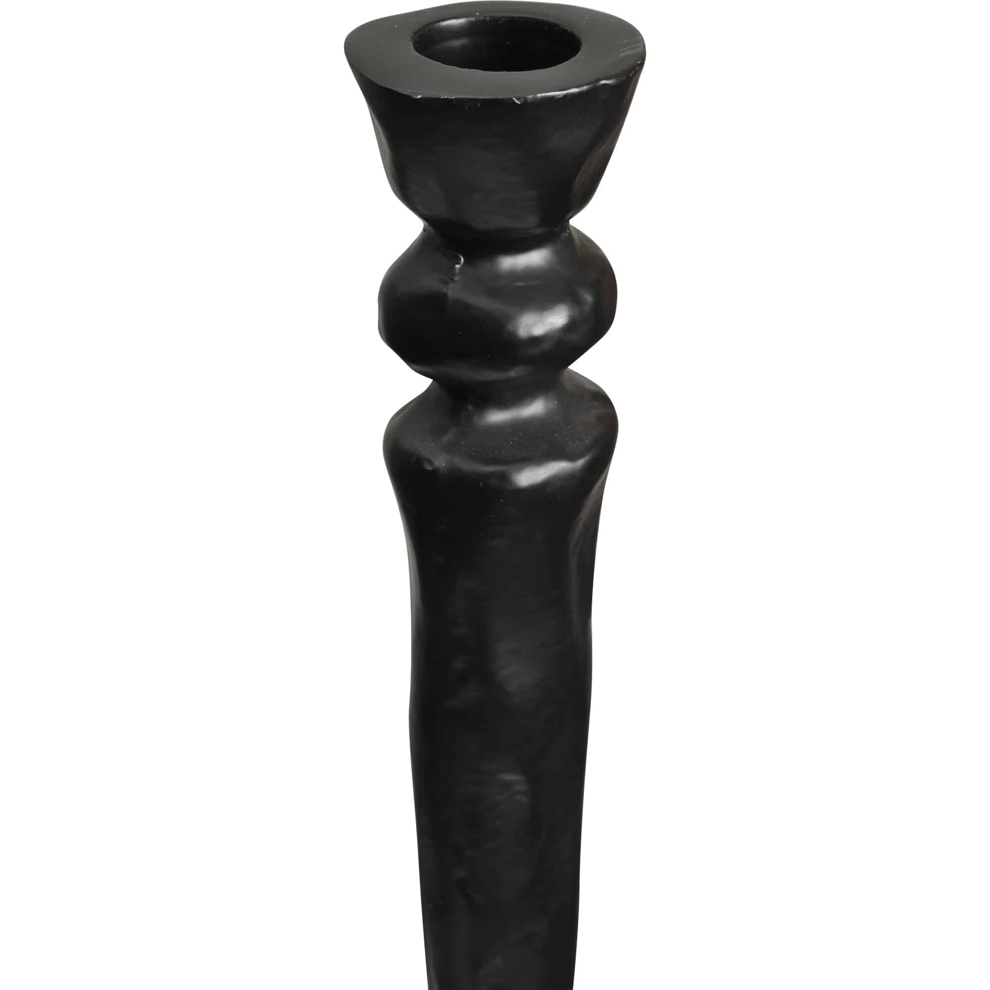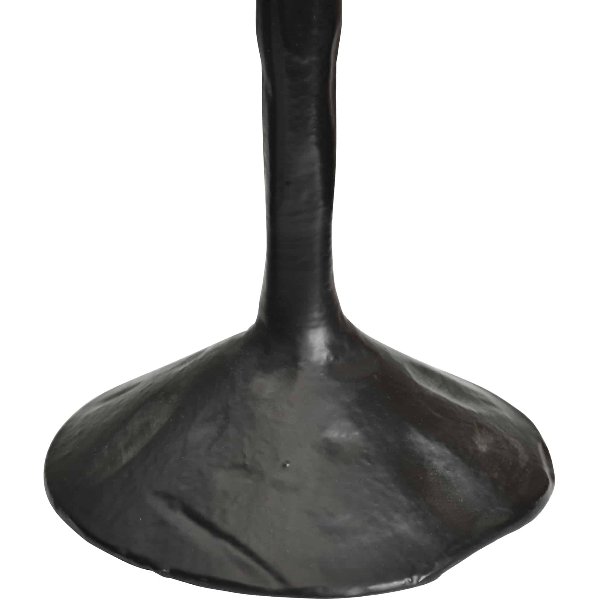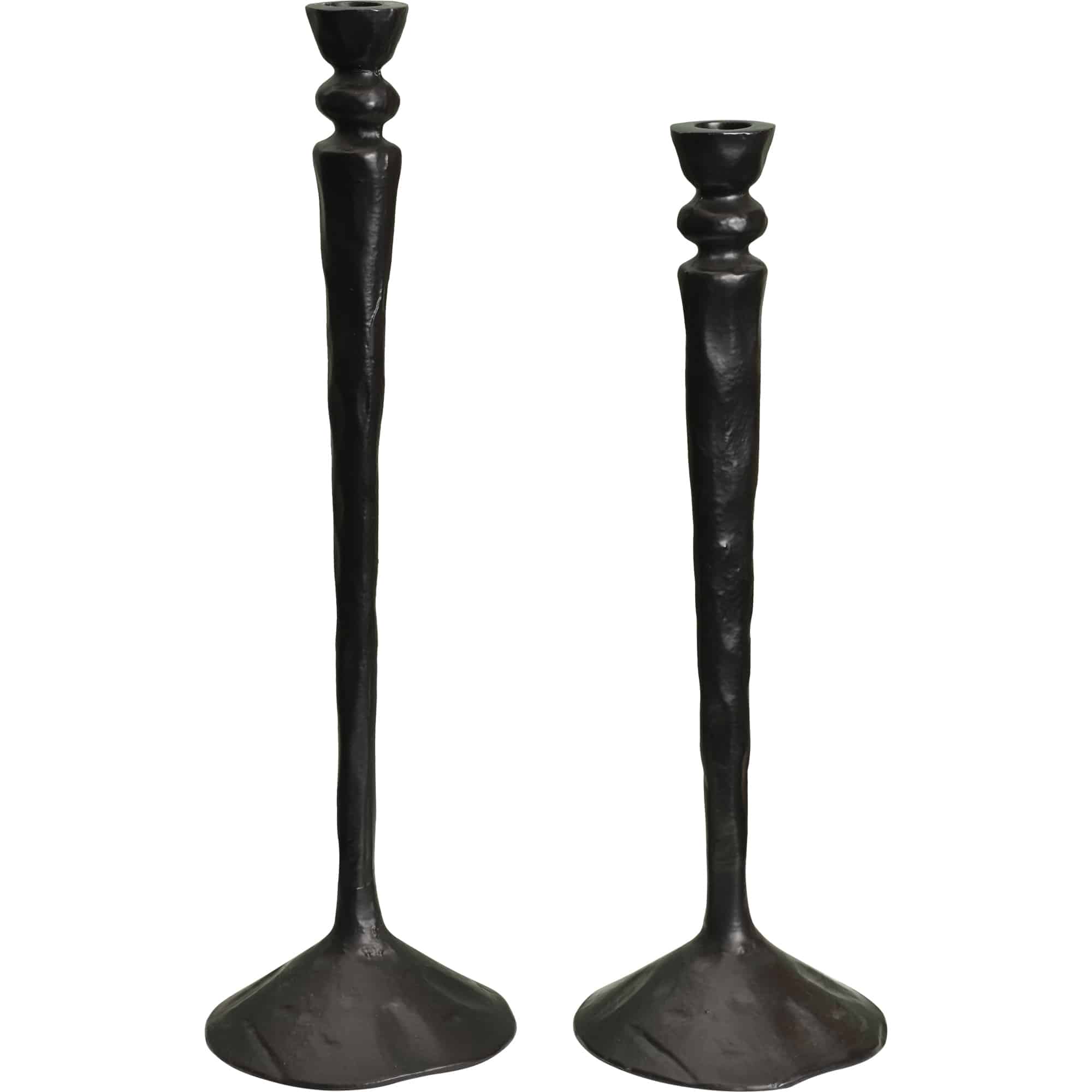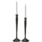 The handsome profile of this set of two candlesticks is rich in traditional design motifs. The slender silhouette of each candleholder is sculpted from aluminum and finished in black with subtle imperfections that allude to their artisanal craftsmanship. Alternating heights make the decorative candleholder set a dynamic pairing as a rustic accent upon a farmhouse-style dining room table.