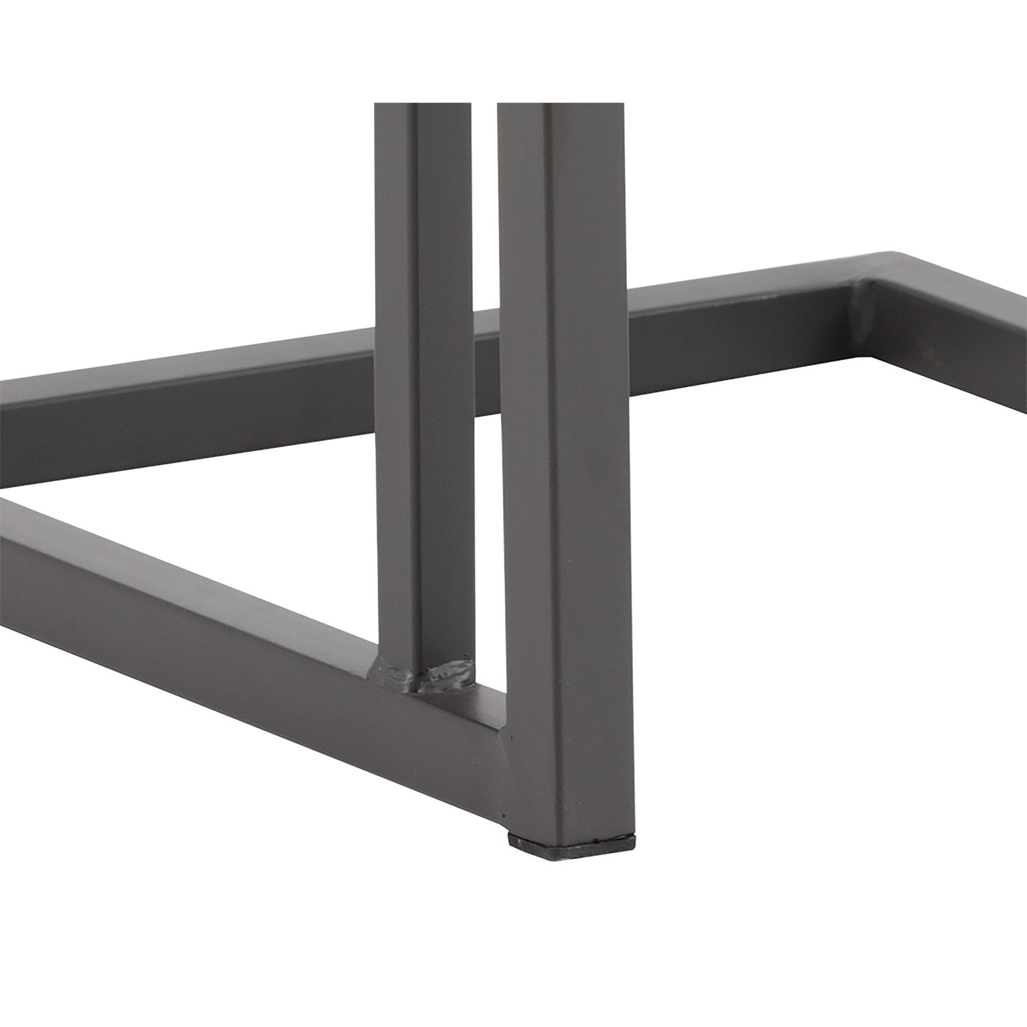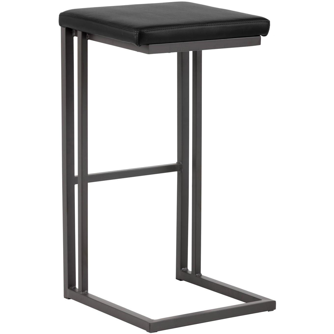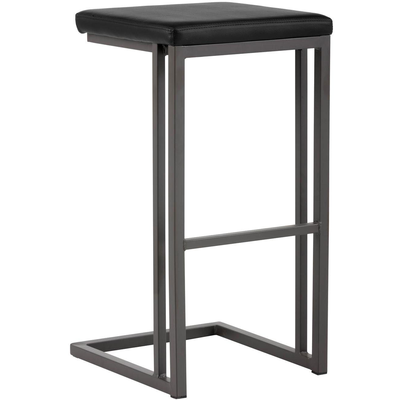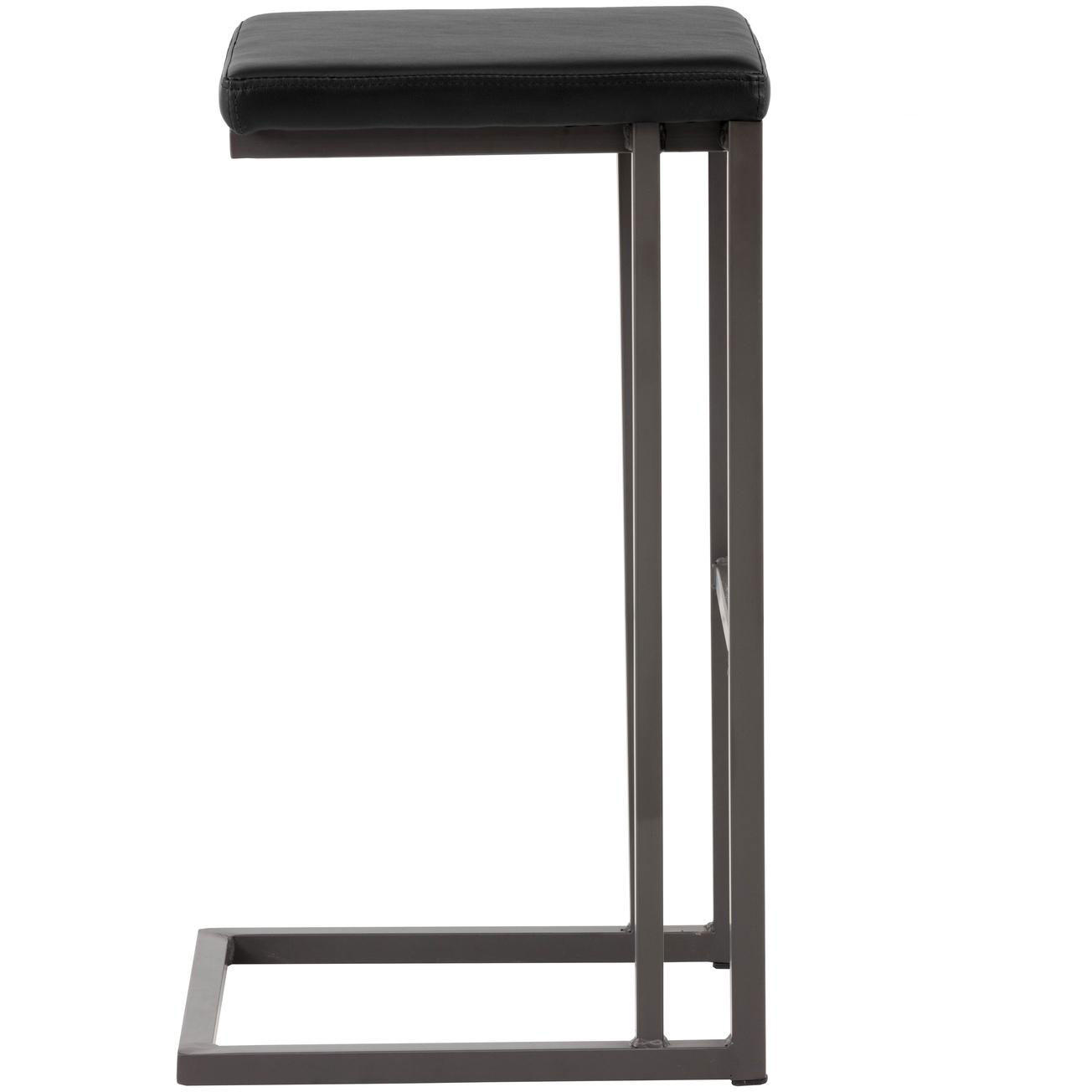 A modern industrial stool featuring a backless seat in onyx faux leather and a cantilever frame with footrest in grey powder-coated steel. Suitable for various dining, kitchen and bar spaces of all sizes.