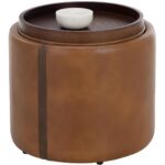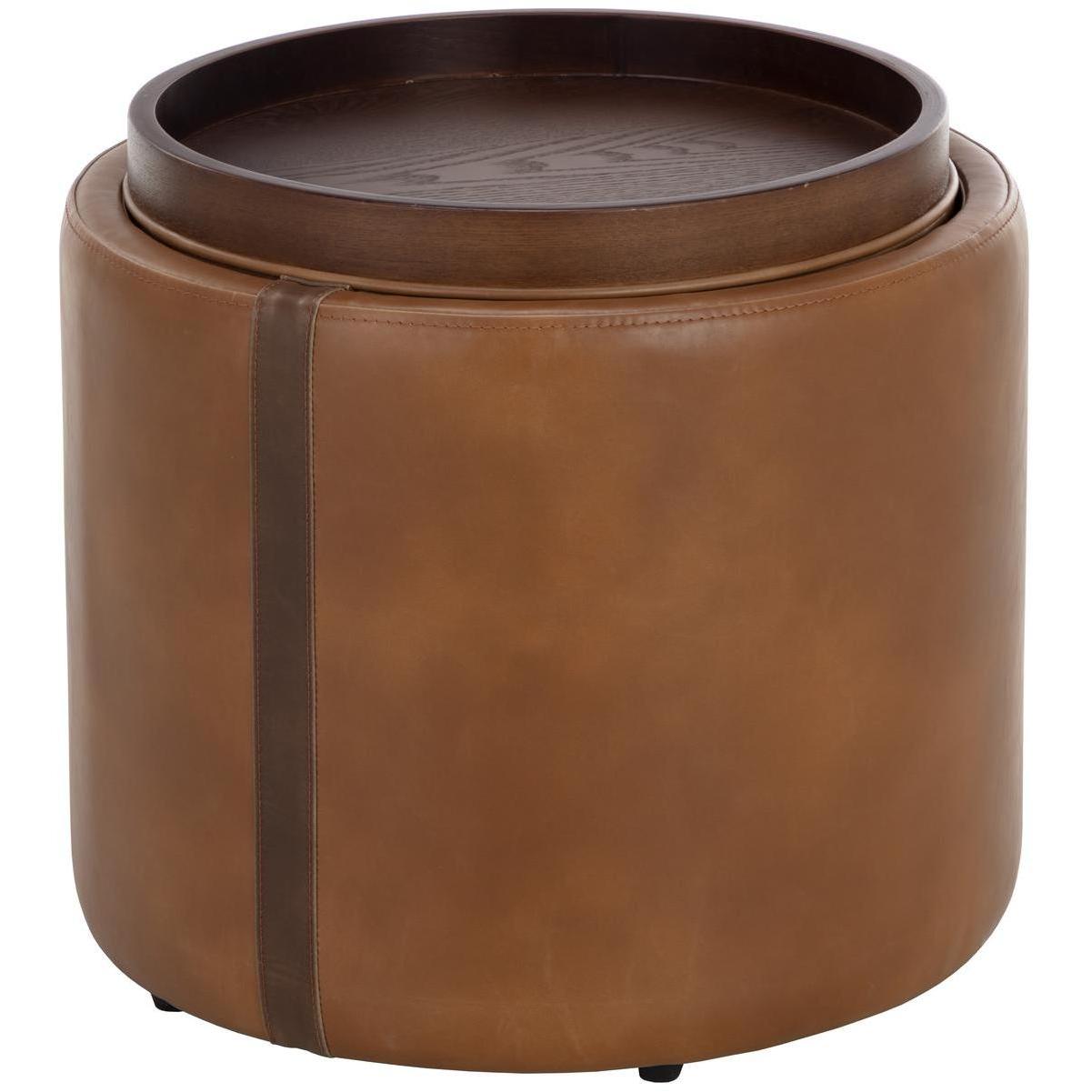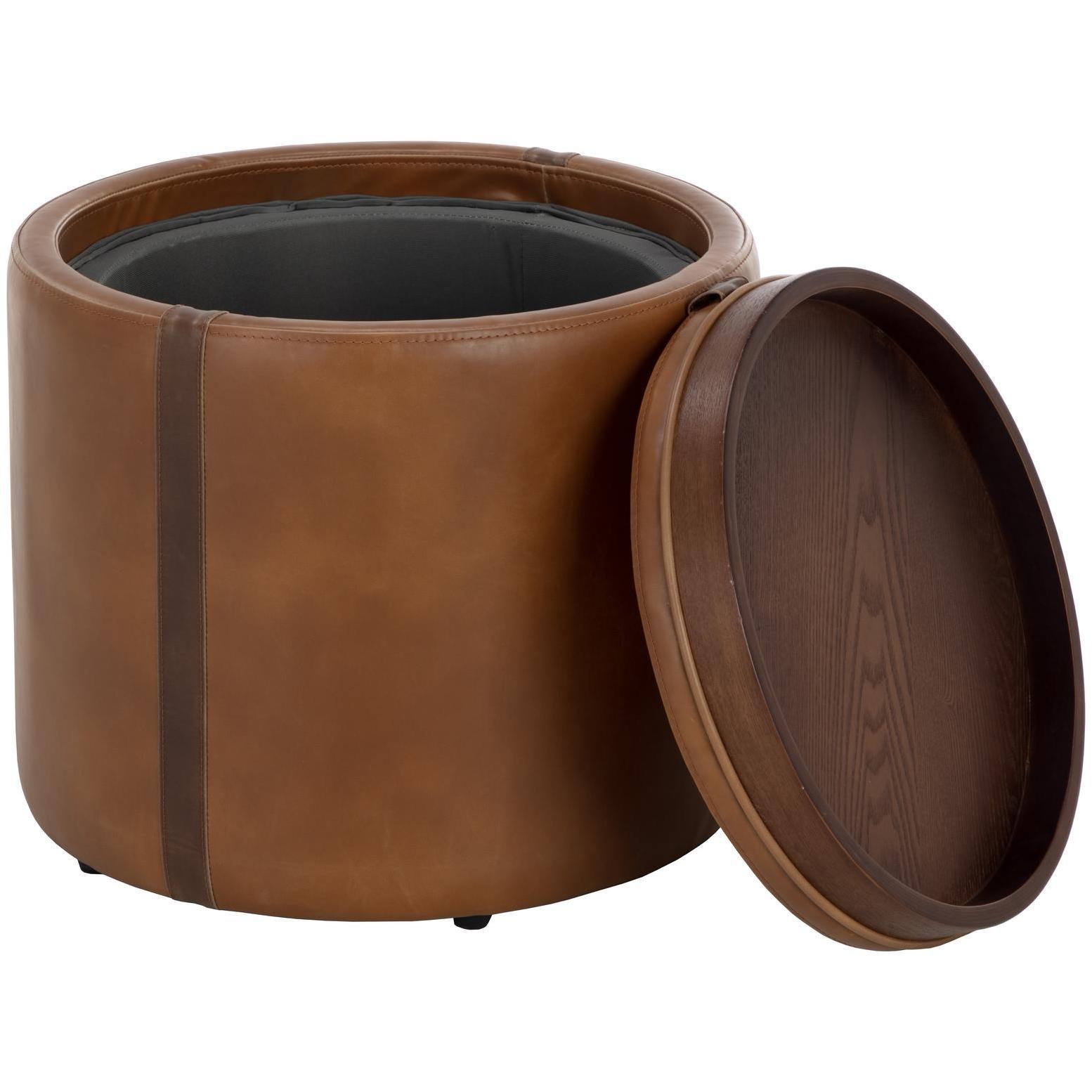 With a touch of retro influence, the Borelli Storage Ottoman will add form and function to any space. Features a handsome tobacco tan faux leather base with a contrasting autumn chestnut faux leather band. A reversible brown solid birch wood top completes this multi-purpose design. Handle With Care: This design has been crafted with faux leather. Faux leather is manufactured to reflect the natural characteristics of leather; as such, markings, wrinkles, grooves, and light scratches are appreciated characteristics. No two pieces will be alike. Visit our Product Care page for more information on how to ensure the lasting beauty of this piece.