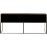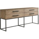 The Boulder Metal Base Console blends industrial chic with natural warmth. Featuring a sleek metal base and a warm Boulder medium-brown finish, its clean lines and four spacious drawers offer both style and functionality. This console adds a modern, architectural touch to your entryway, living room, or dining area, perfect for those seeking a blend of contemporary design and practical storage.