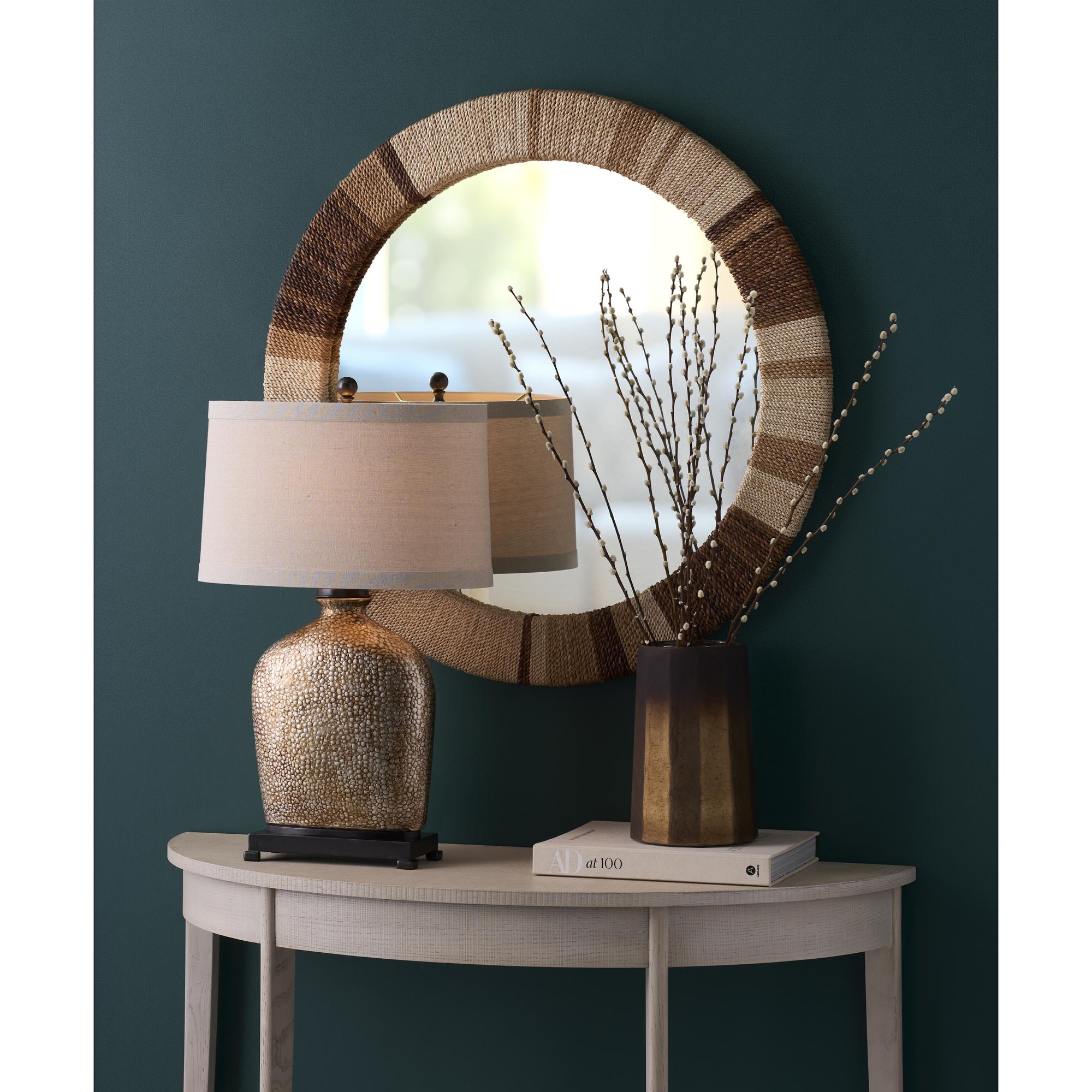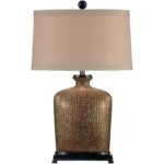 Bradford lamp is a hand made and decorated ceramic jar with a textured and elongated shape. The golden bronze glaze pairs with the world bronze finished base and accents refracting a radiant glow. A classic ball finial and tan linen drum shade complete a rustic look for a bedroom, entryway or living area.