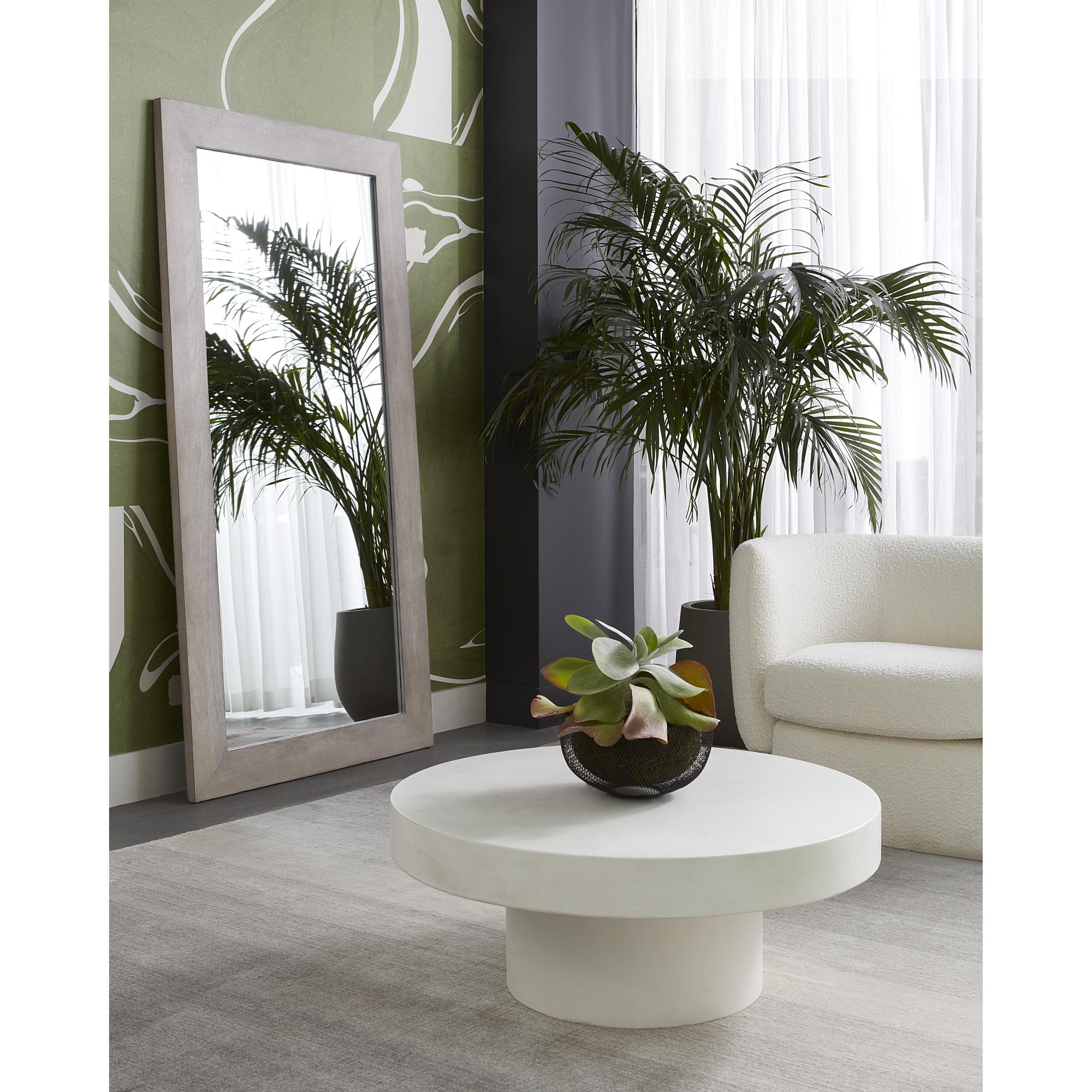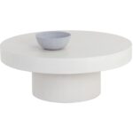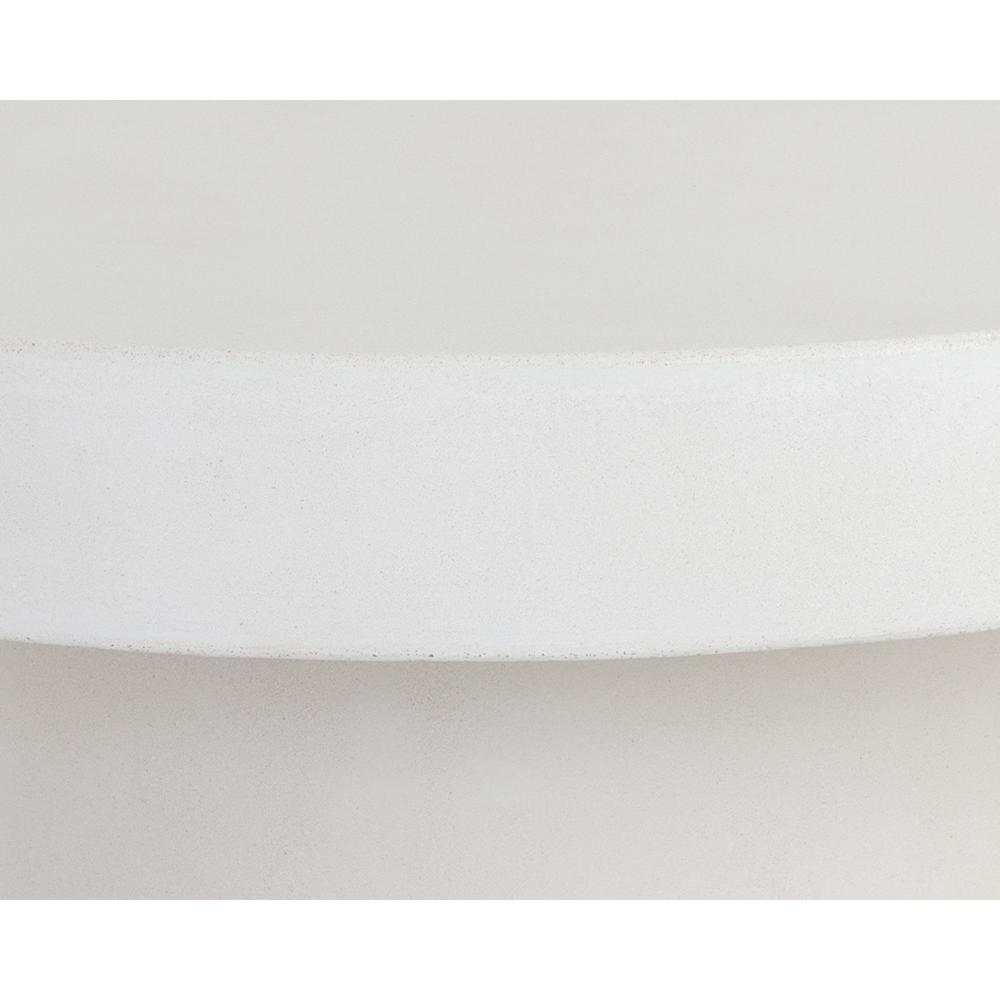 This bold, round coffee table will be the perfect addition to urban, contemporary or modern spaces. Made with sealed concrete that will display variations of white hues, which are unique to each piece and will enhance over time. Suitable for indoor and covered outdoor spaces. Also available in grey concrete.