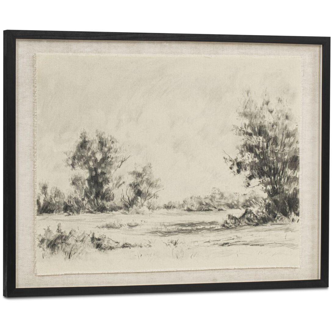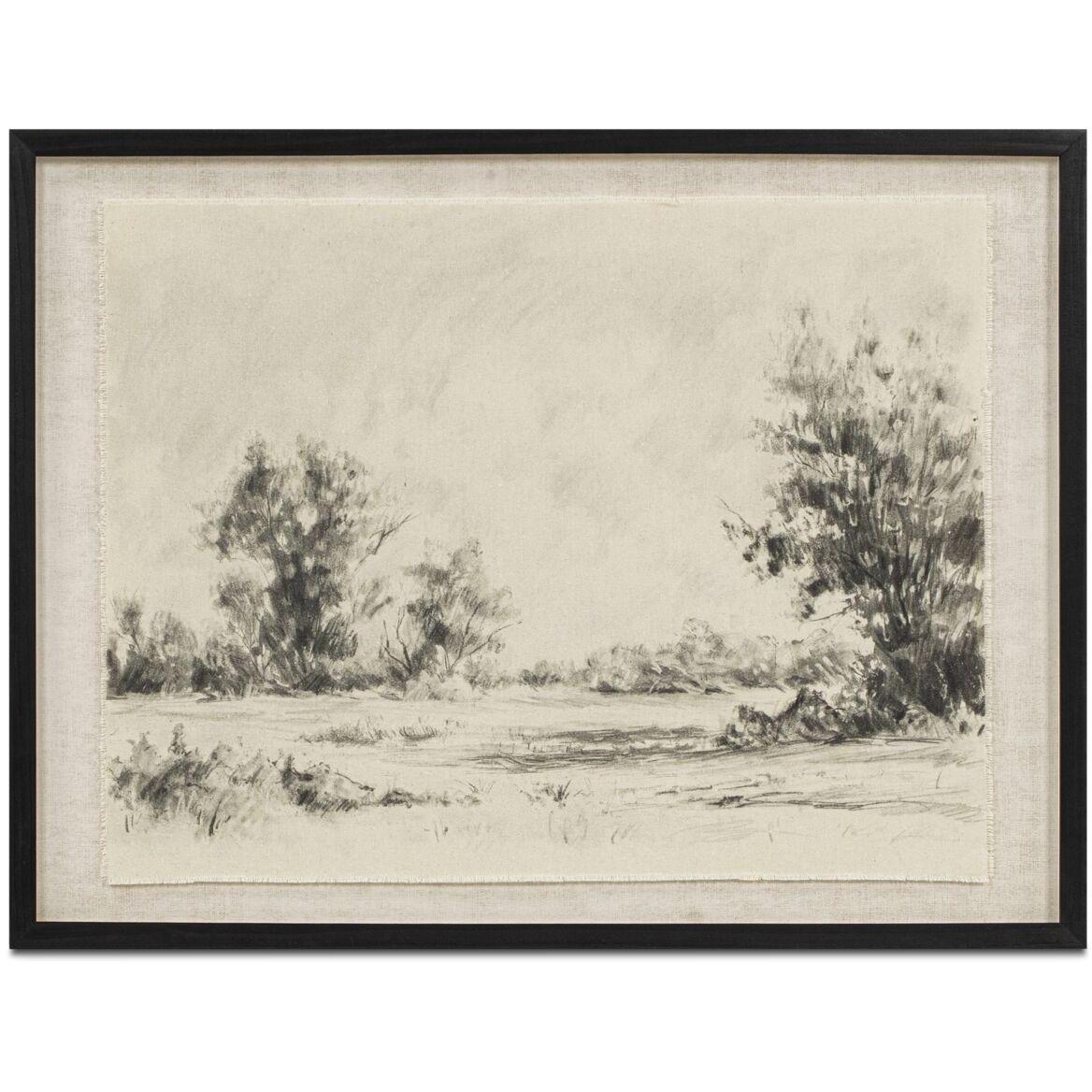 A classic, redrawn. Briar reimagines the traditional landscape with a relaxed hand. Sketched in bold strokes on soft white cotton, its countryside composition feels both familiar and freshly interpreted. Frayed edges nod to its hand-touched origins, while the solid wood frame and glass overlay lend a polished finish. Timeless, textured, and heritage with a hint of ease.