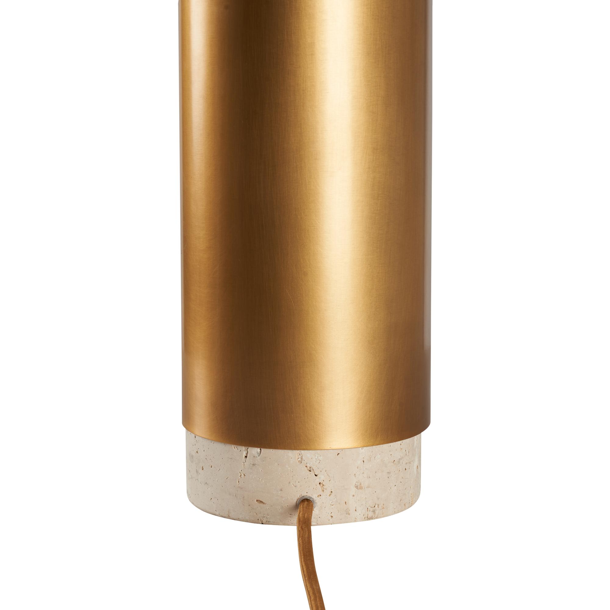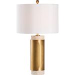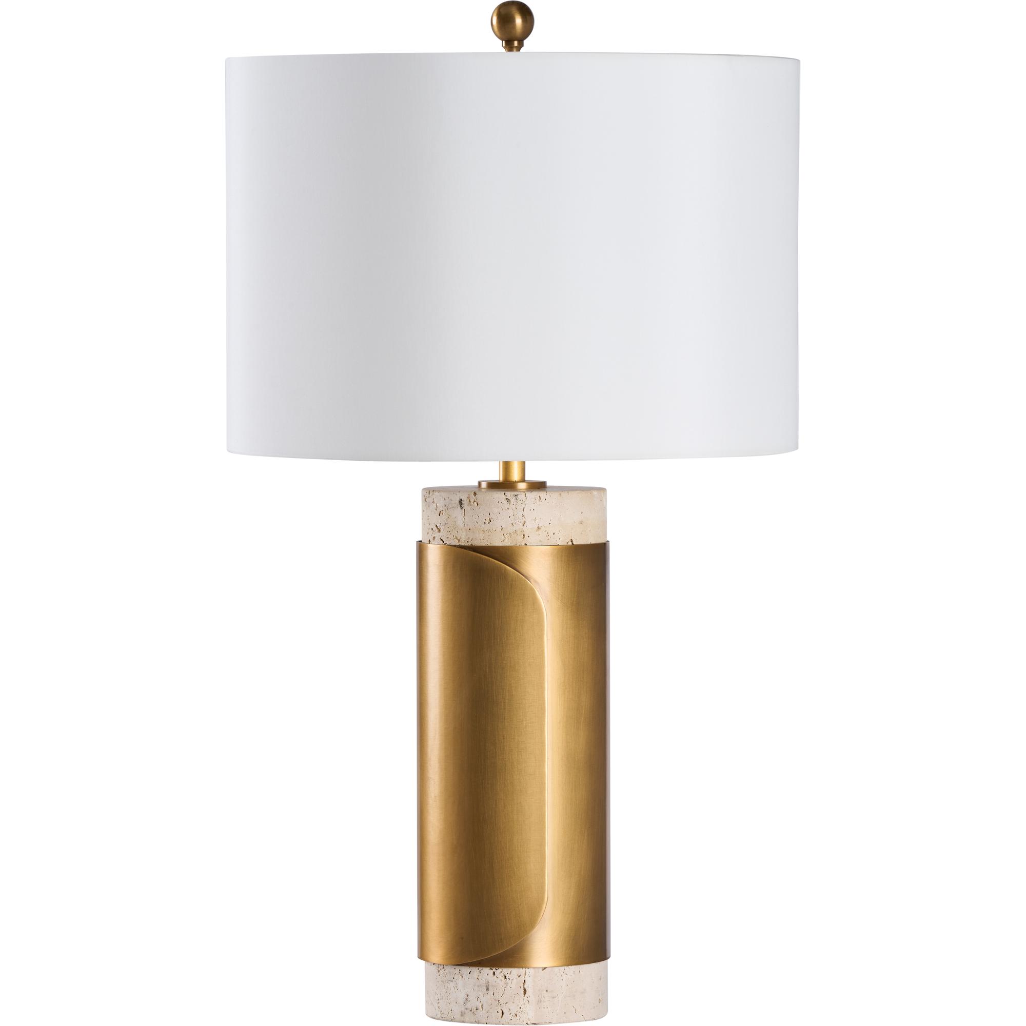 The Bridgeport Lamp – White brings timeless elegance to any setting with its refined combination of natural travertine and antique brass. The sculptural brass wrap adds a contemporary edge to the warm, textured stone base, while the clean white drum shade offers a soft, ambient glow.