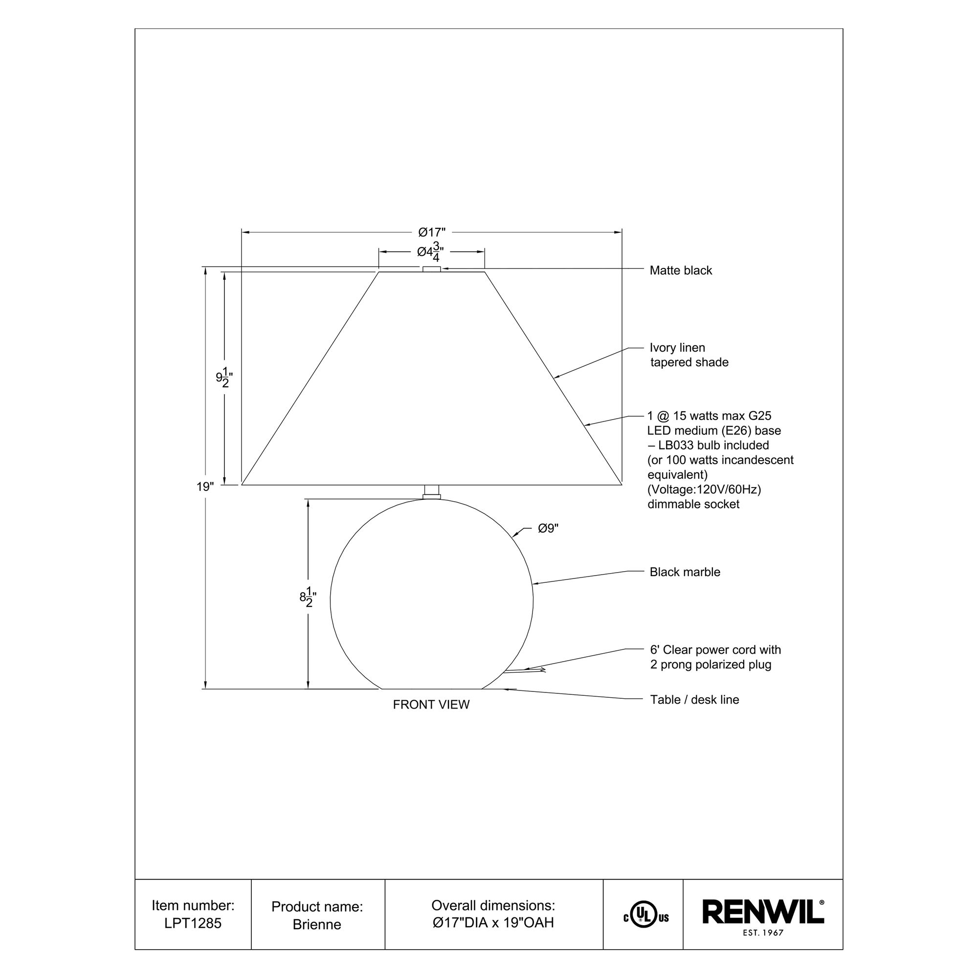 The Brienne table lamp is set to become the fashionable sidekick your room update has been waiting for. Blending form and function, it features a stunning honed marble base in tones of black that complements many styles of interior. The perfect bedroom or living room table lamp, its generously sized tapered cream linen shade is held up by a matte black fitting that when combined with its included bulb, shed a warm glow throughout the room. Beautiful on its own or paired up for double duty, this dimmable lamp will make a timeless and memorable statement in any space.