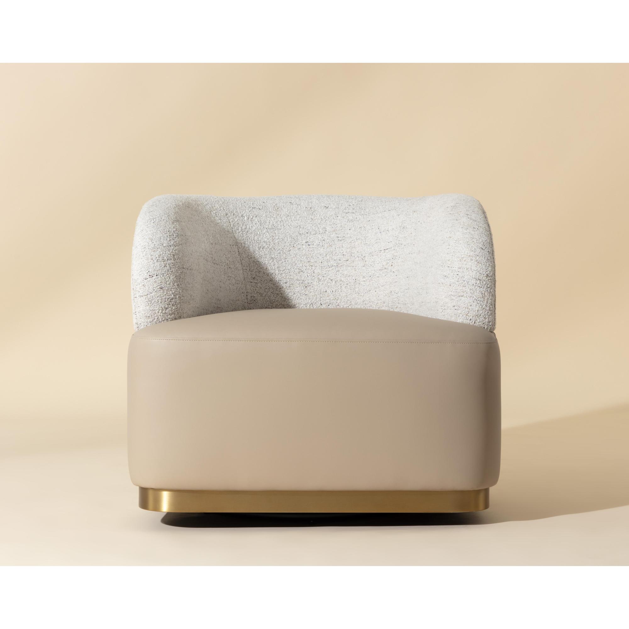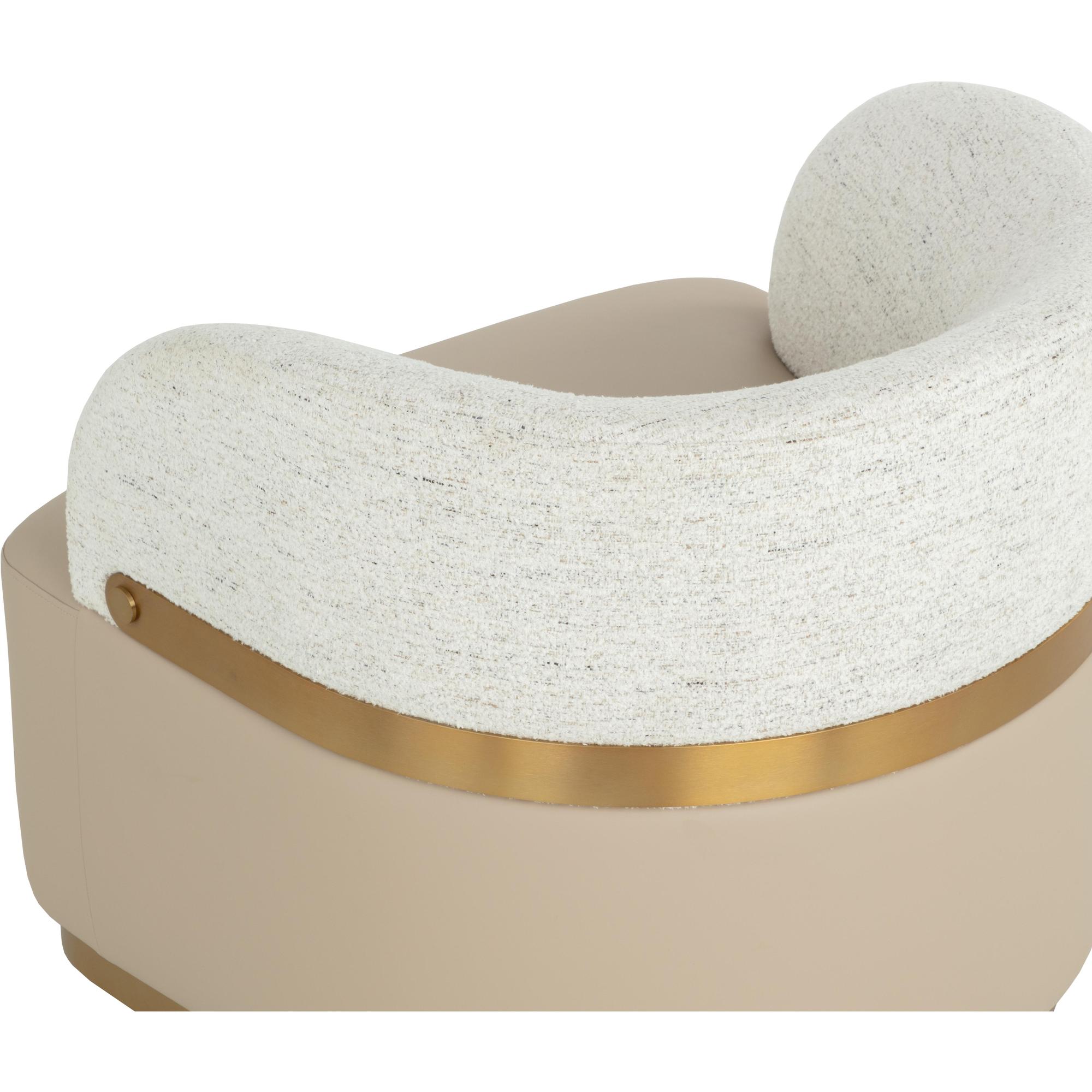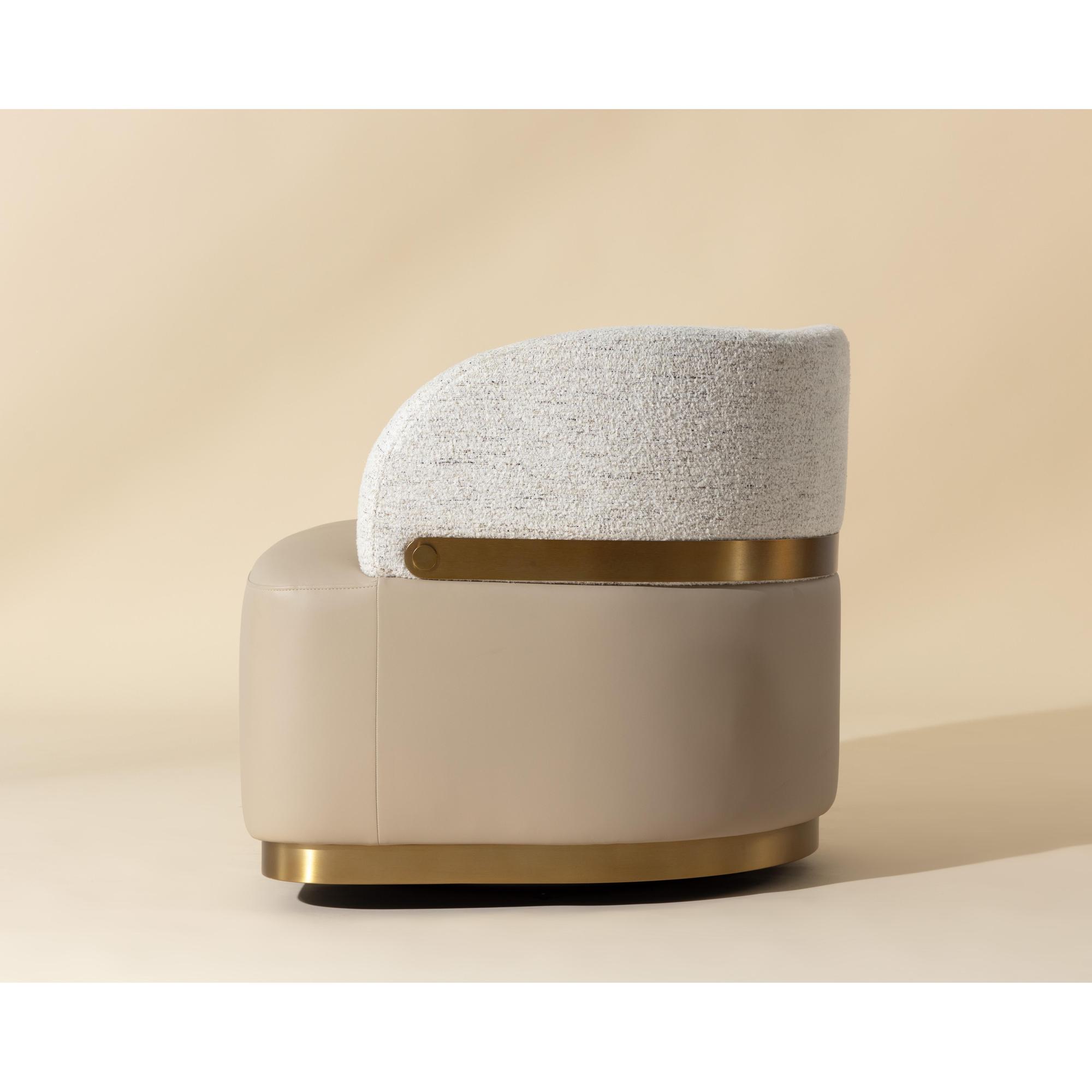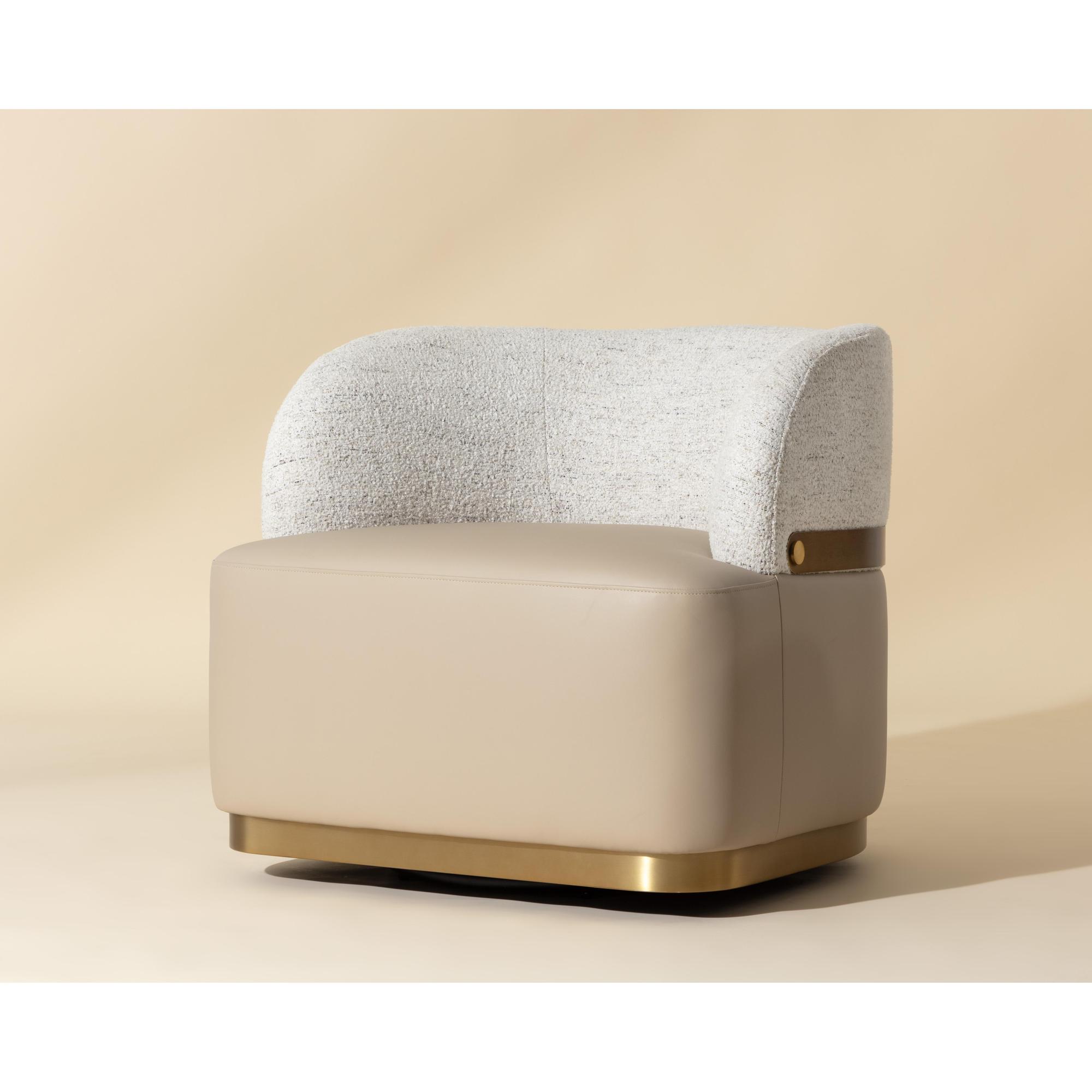 The Brinda Swivel Lounge Chair is a mid-century delight that showcases a mastery of craft and dazzling style. Upholstered in smooth napa beige faux leather and hailey moon fabric, this gorgeous lounge chair features a gold stainless steel accent on the backrest and a matching plinth base.