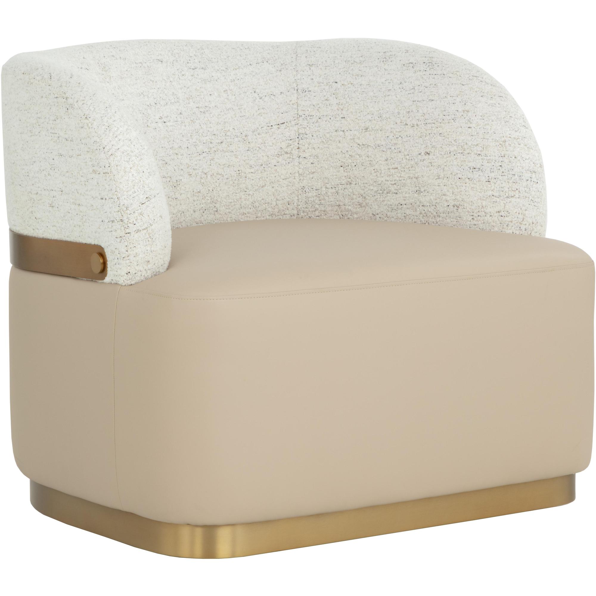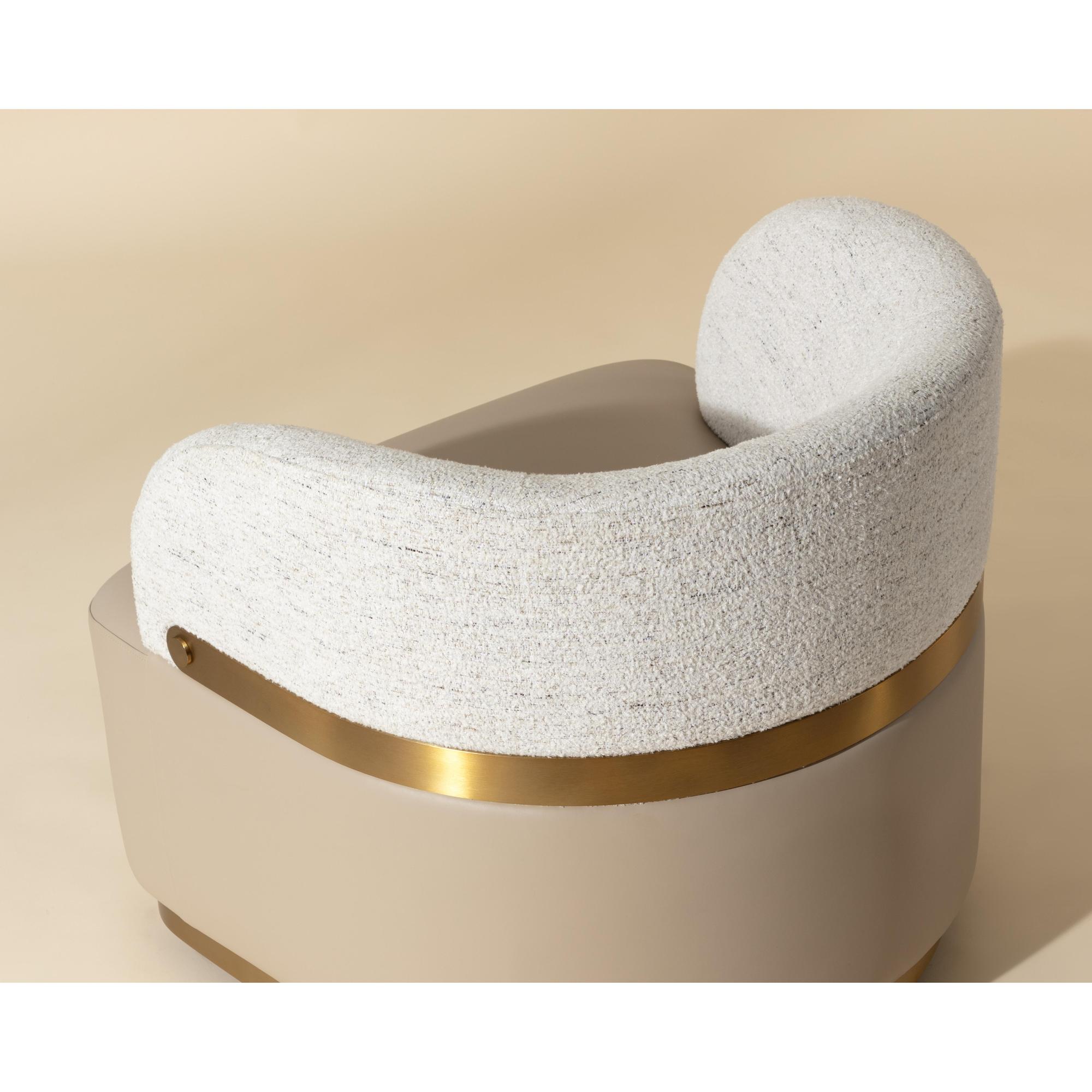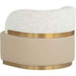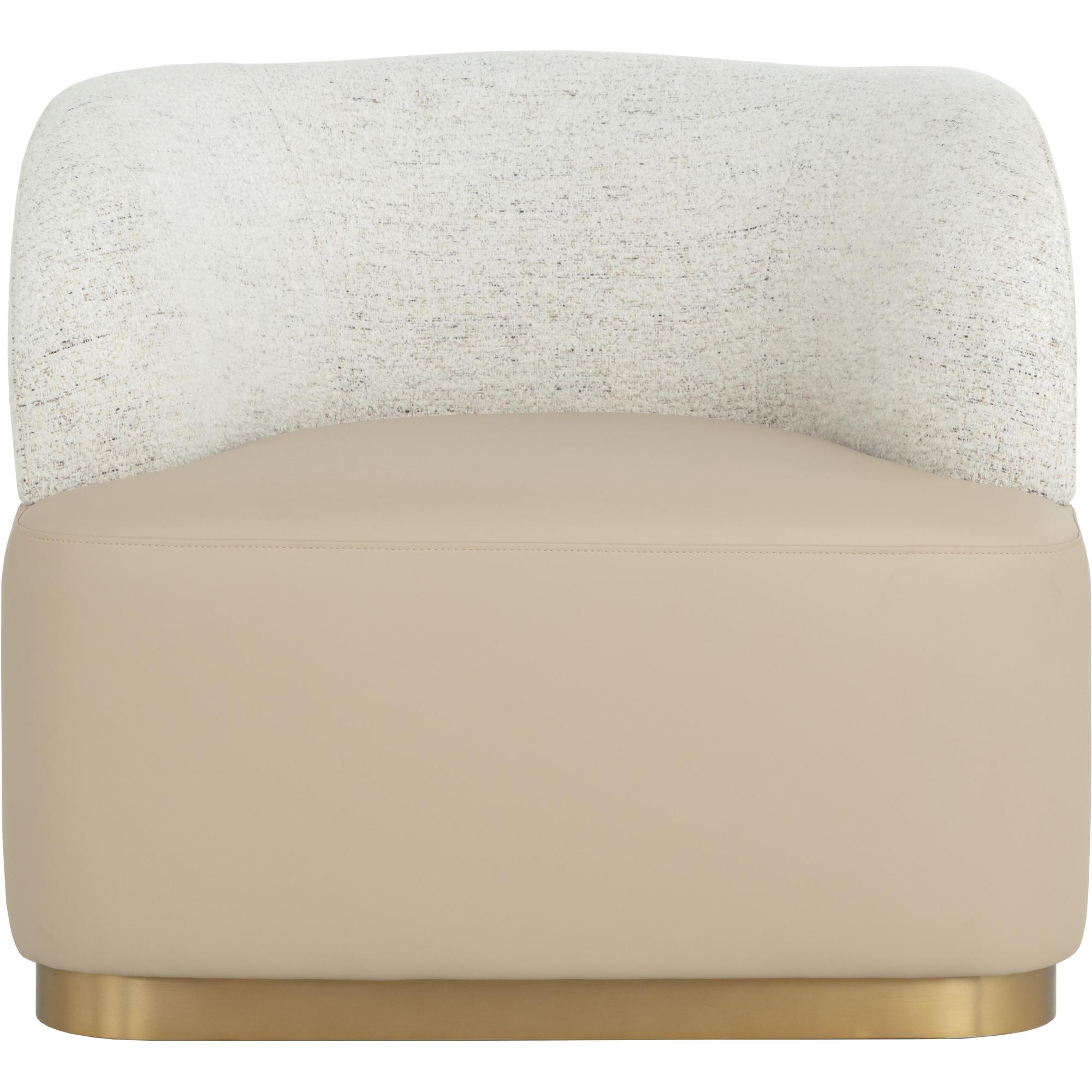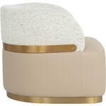The Brinda Swivel Lounge Chair is a mid-century delight that showcases a mastery of craft and dazzling style. Upholstered in smooth napa beige faux leather and hailey moon fabric, this gorgeous lounge chair features a gold stainless steel accent on the backrest and a matching plinth base.