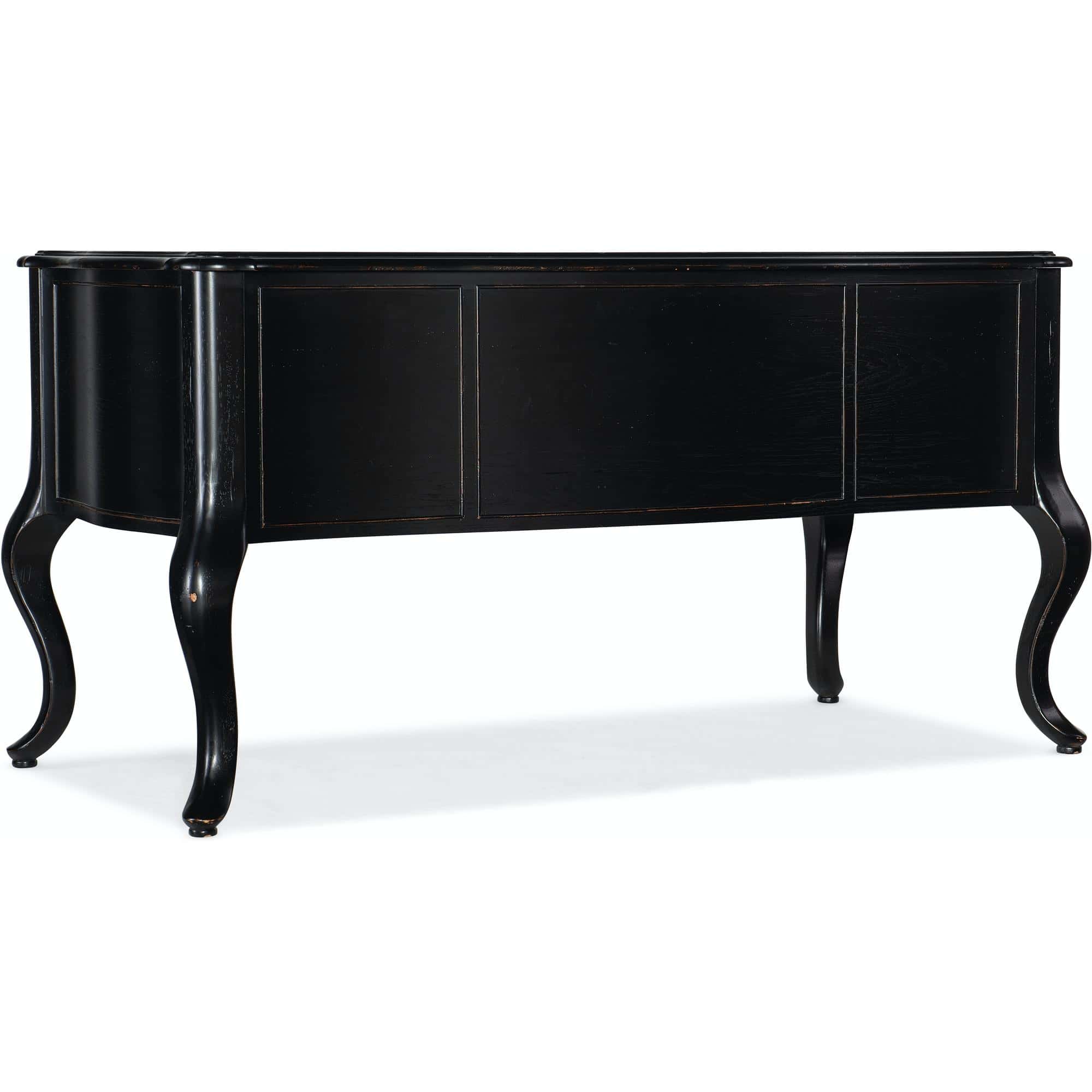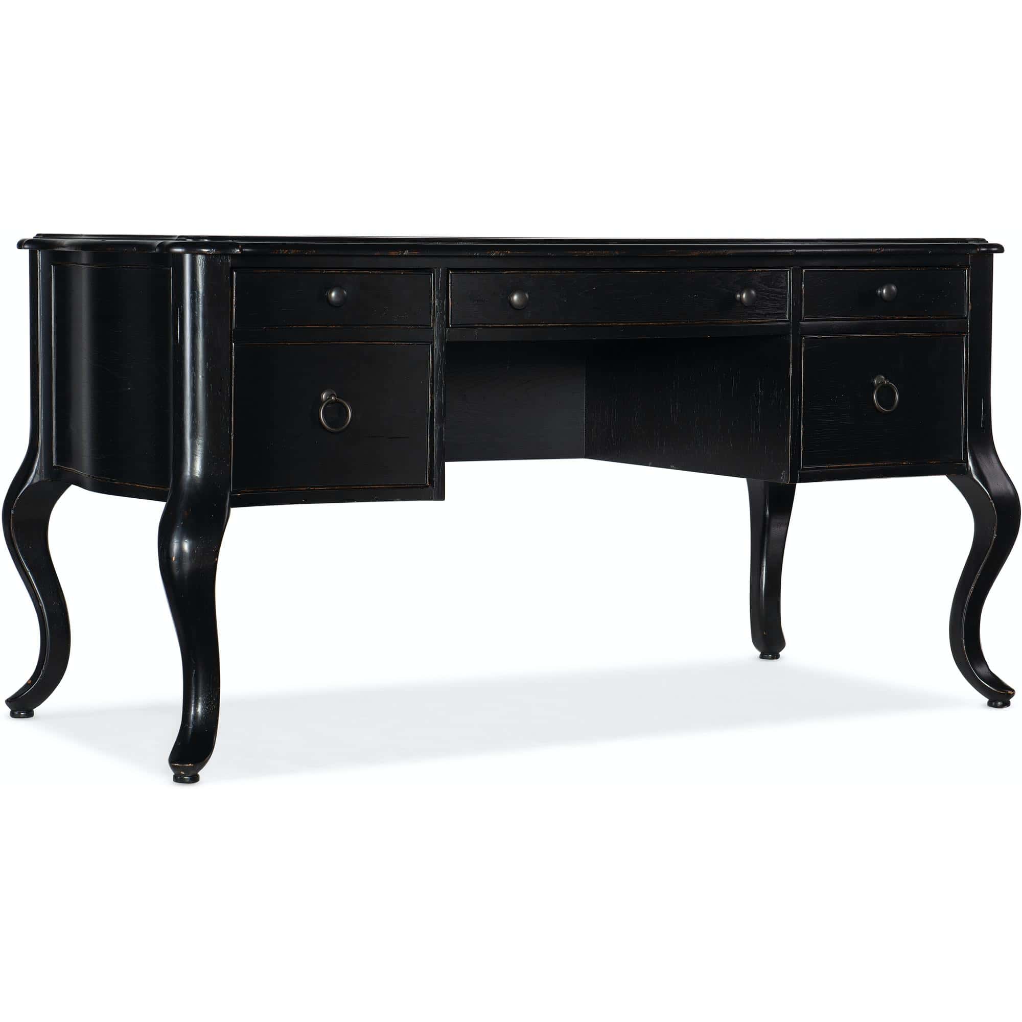 Center drawer has a drop-front for keyboard use and wire cutout in the back of drawer