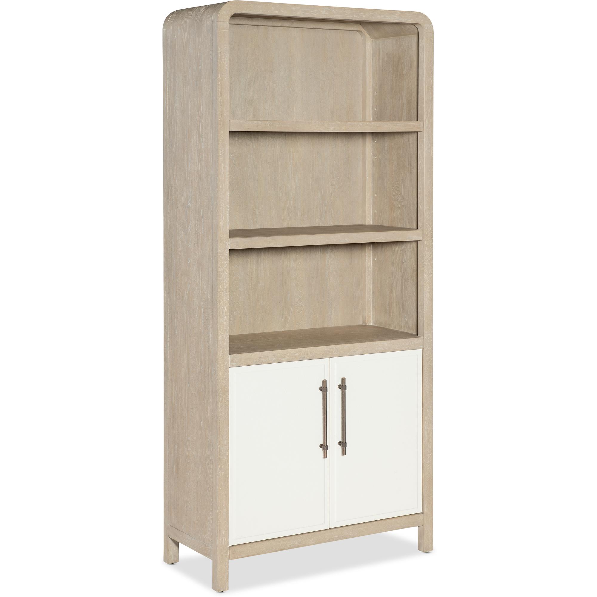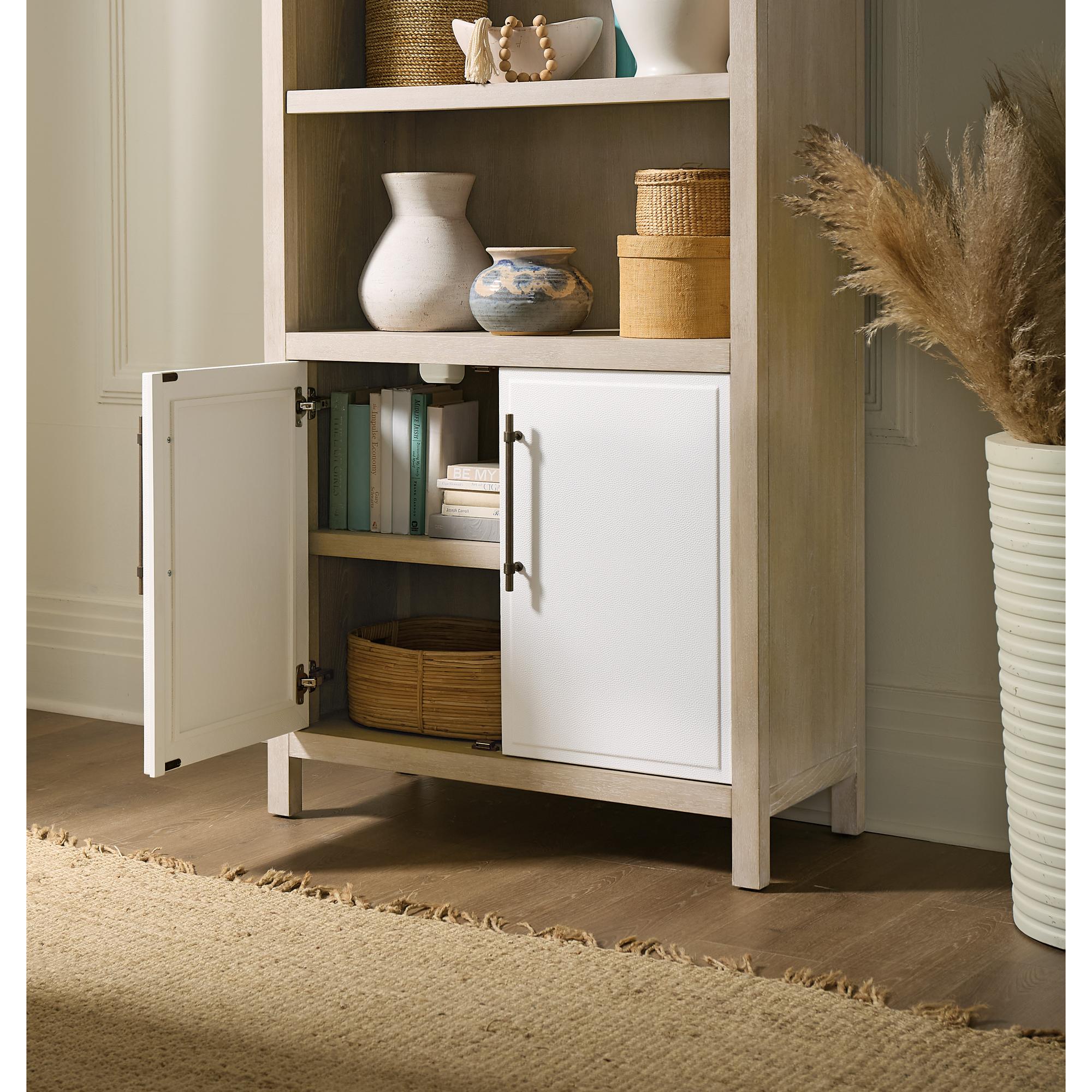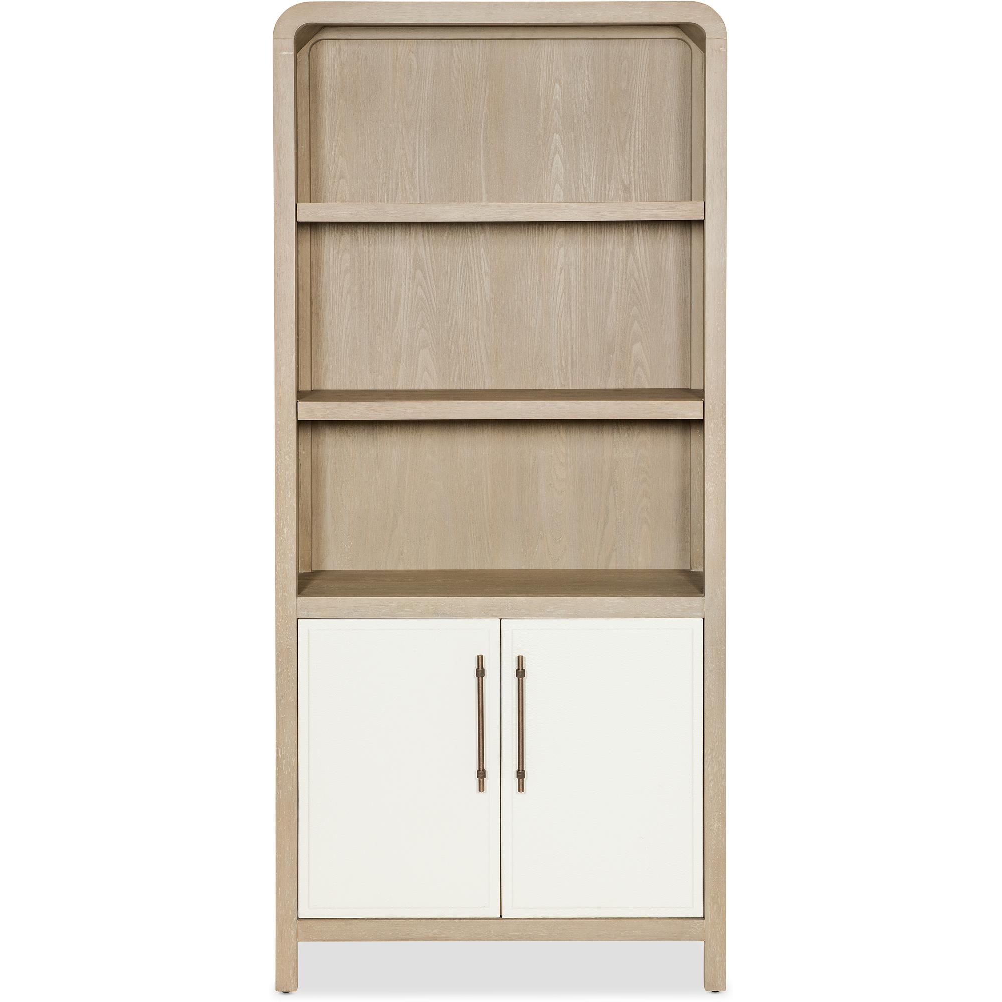 Features: Two-tone finish features elm veneers in a pebble hue with door fronts in a contrasting ivory with leathered texture Two adjustable shelves in the top Two doors in bottom with one adjustable shelf behind doors Rounded top corners